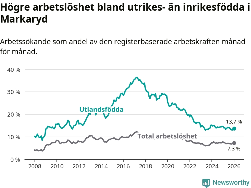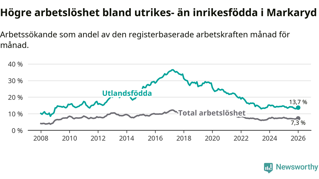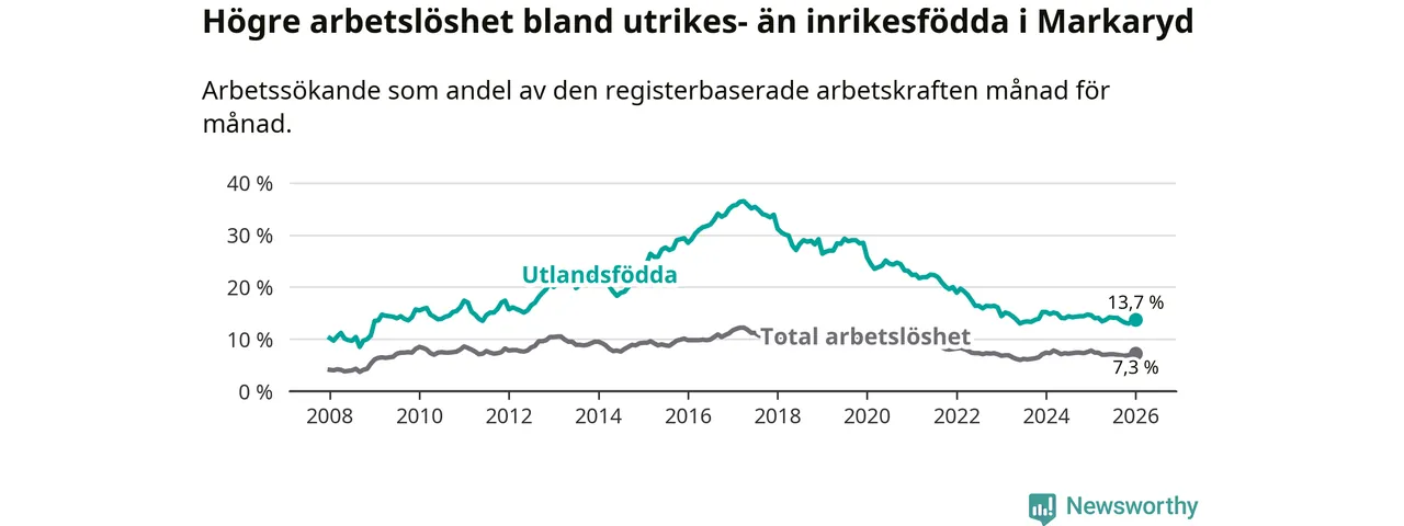 Den senaste månadsstatistiken från Arbetsförmedlingen visar på en nedgång i arbetslöshet bland utlandsfödda i Markaryds kommun med 0,9 procentenheter. Arbetslösheten bland invånare födda i ett annat land låg i januari på 13,7 procent.