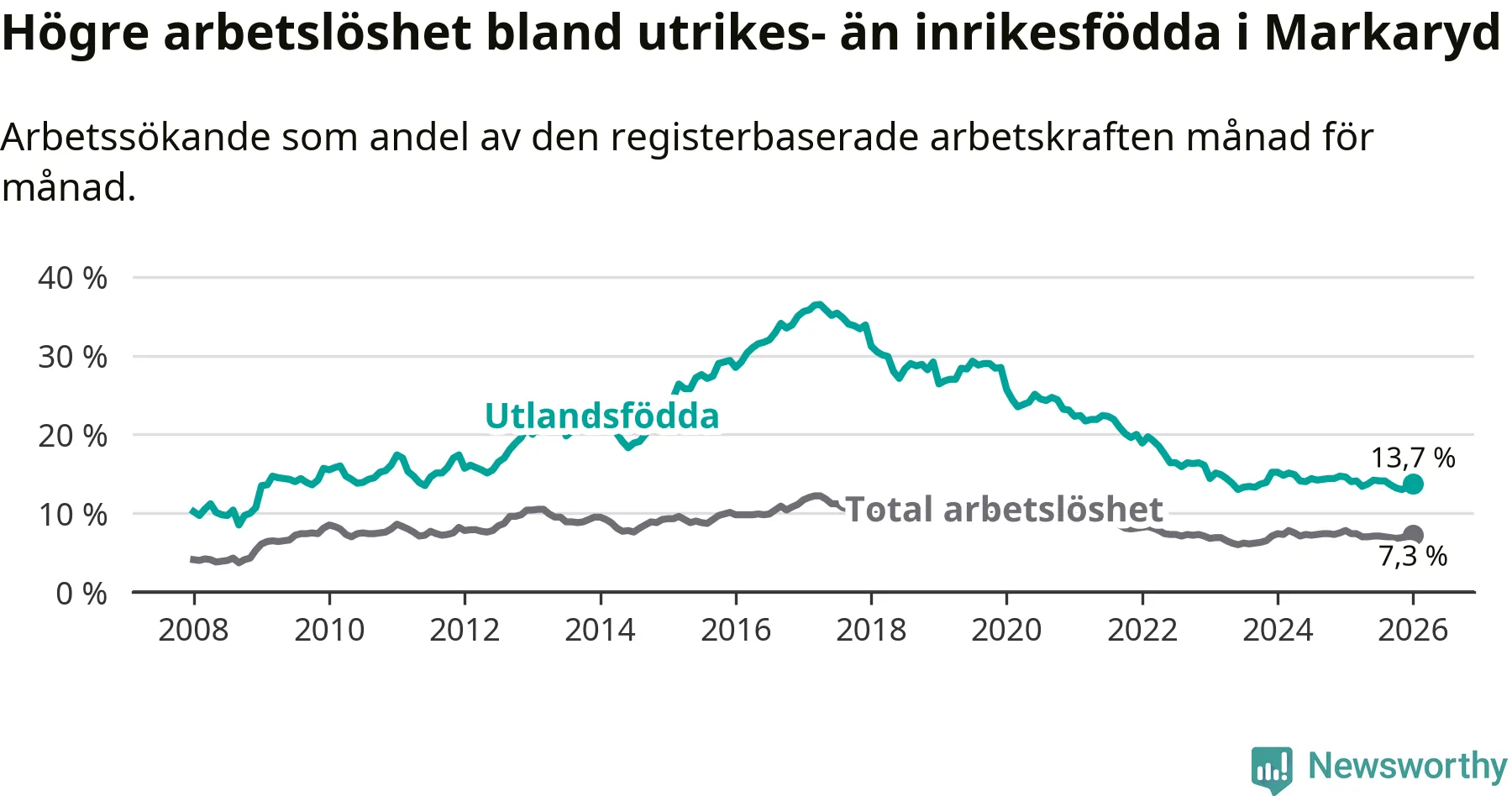 Graf: Skillnad i arbetslöshet mellan utrikesfödda och hela befolkningen i Markaryds kommun