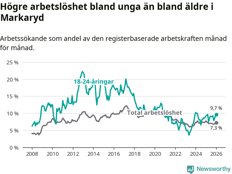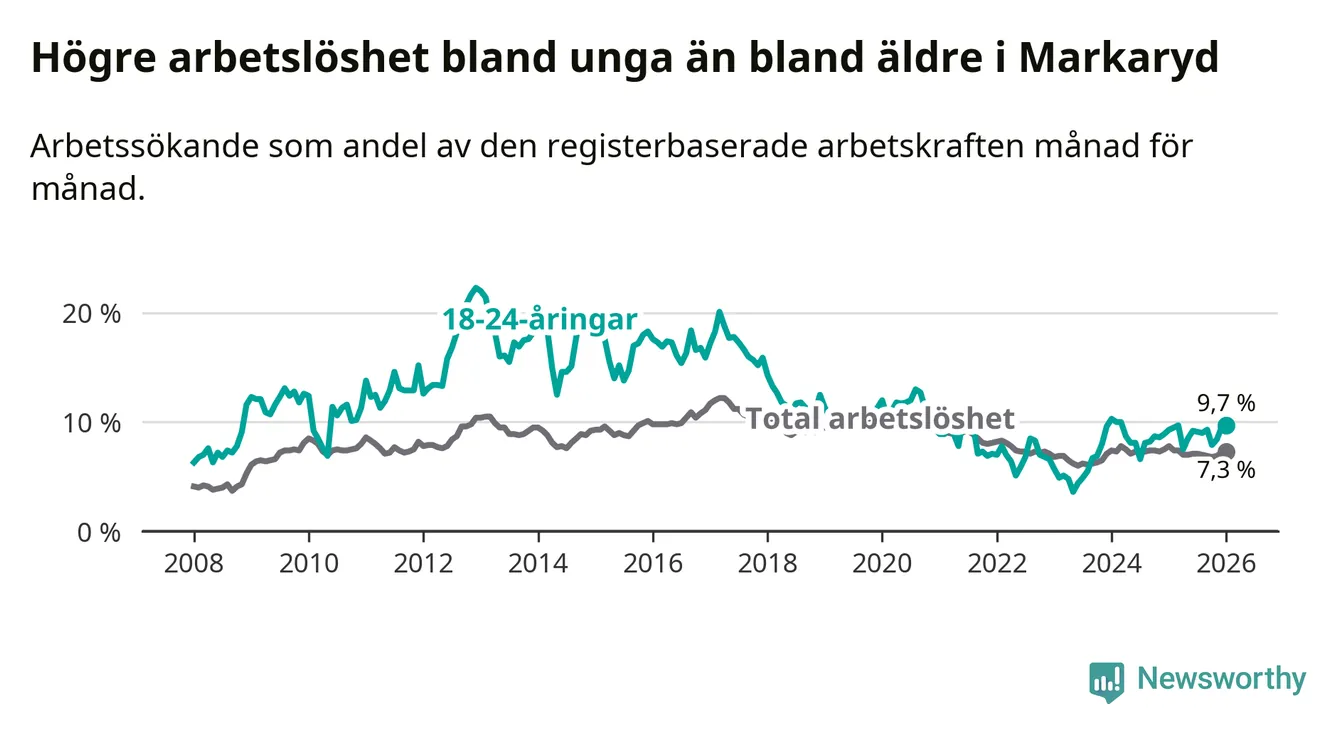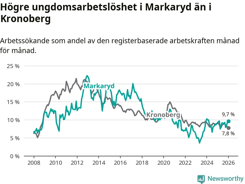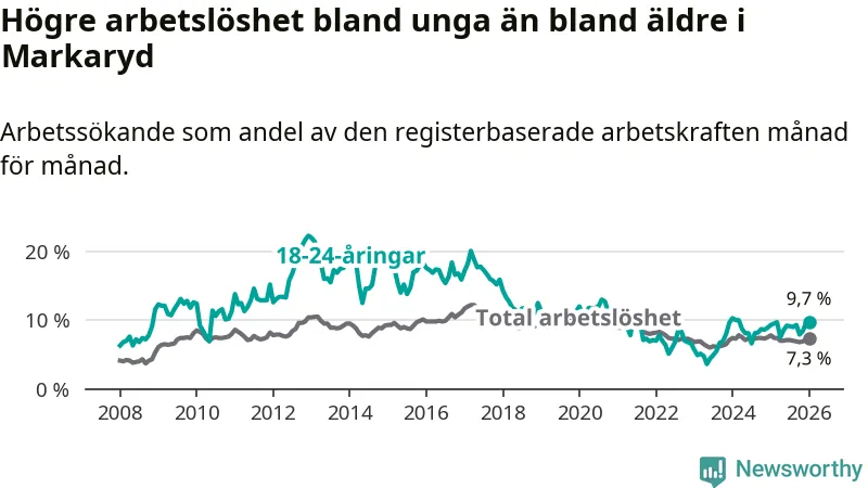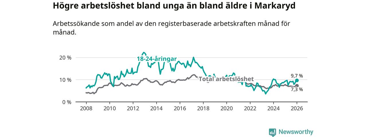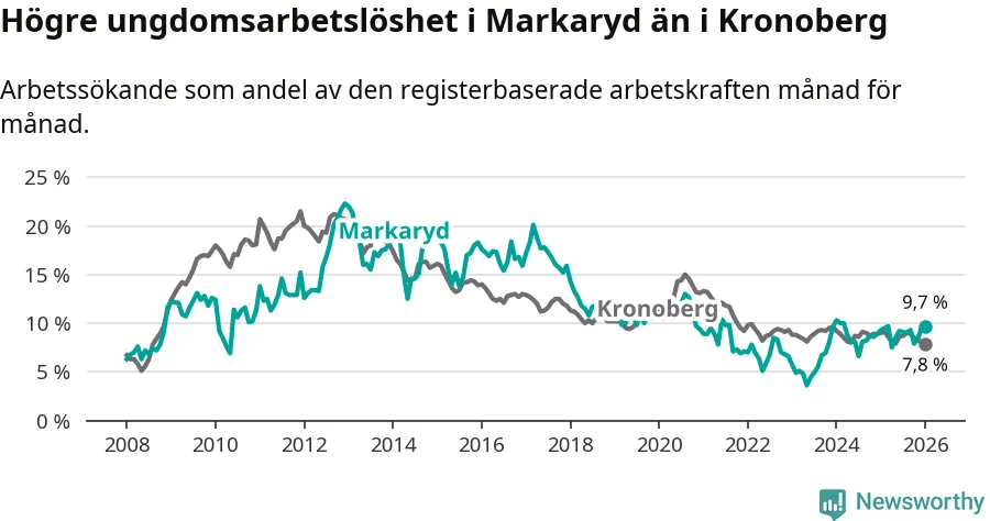 Precis som den totala arbetslösheten ligger ungdomsarbetslösheten i Markaryd högre än i Kronoberg som helhet. Skillnaden mellan kommunen och länet är 1,9 procentenheter.
