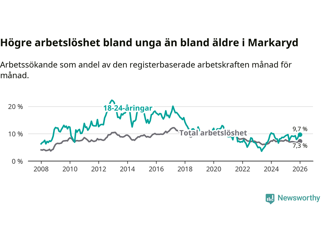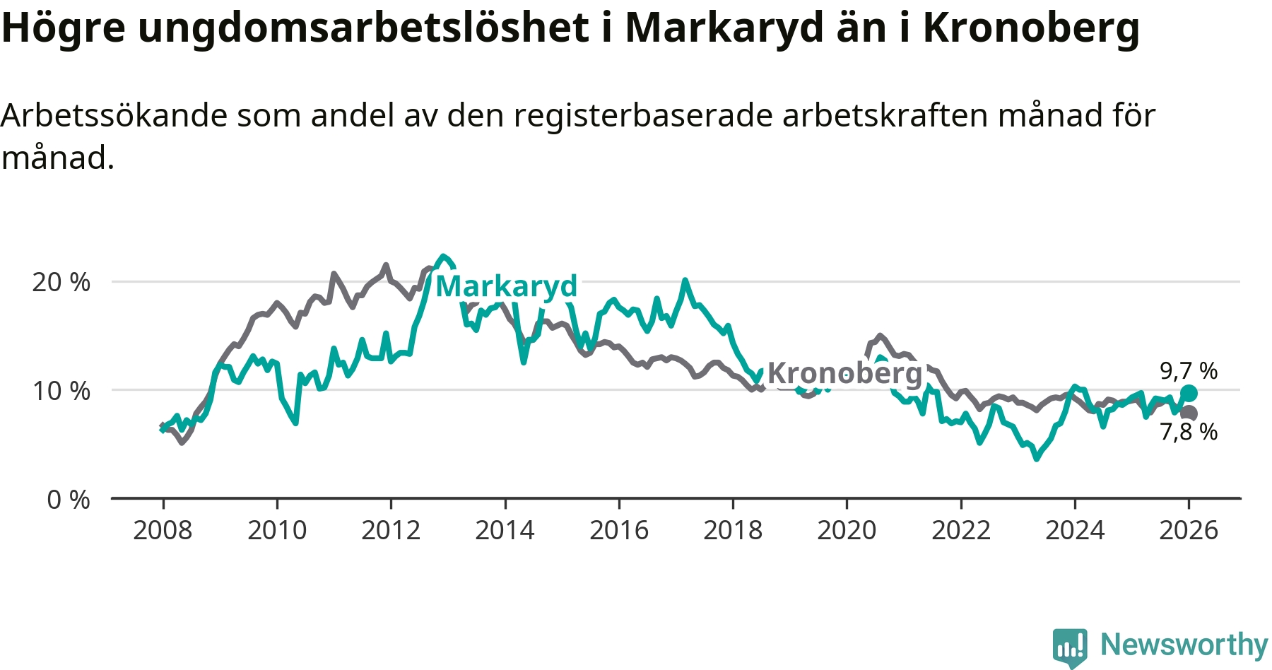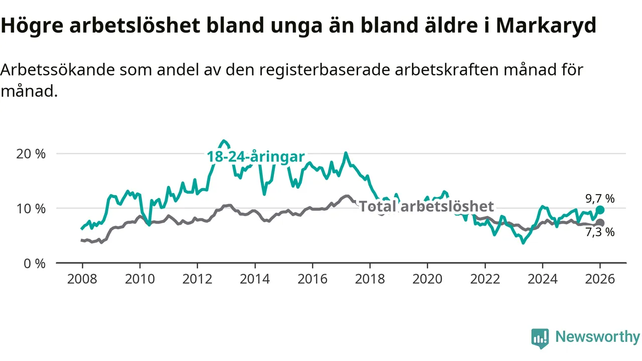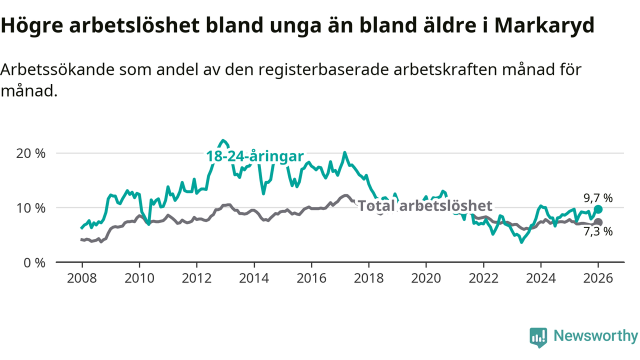 Precis som den totala arbetslösheten ligger ungdomsarbetslösheten i Markaryd högre än i Kronoberg som helhet. Skillnaden mellan kommunen och länet är 1,9 procentenheter.