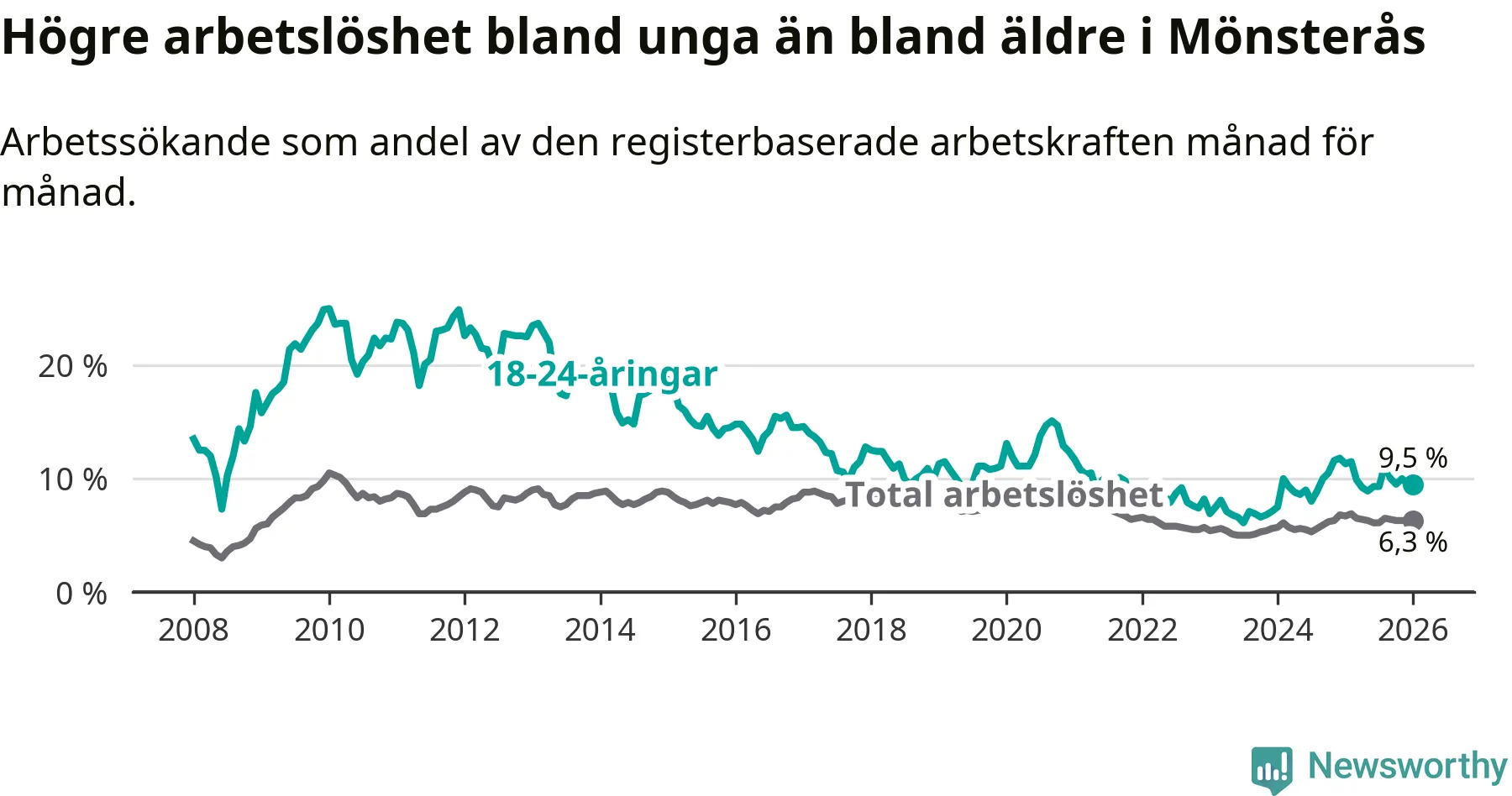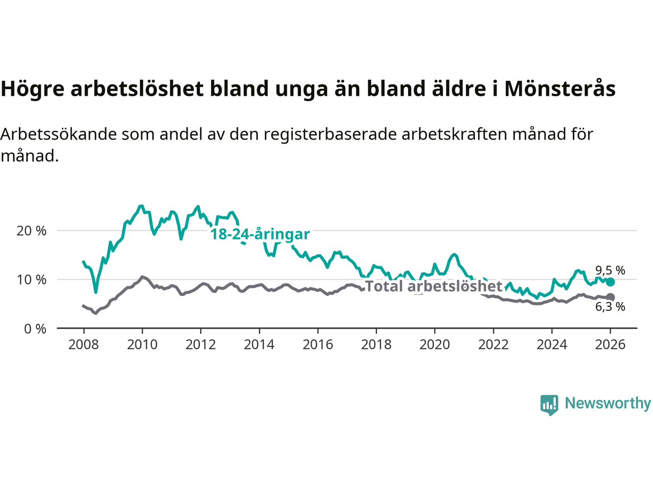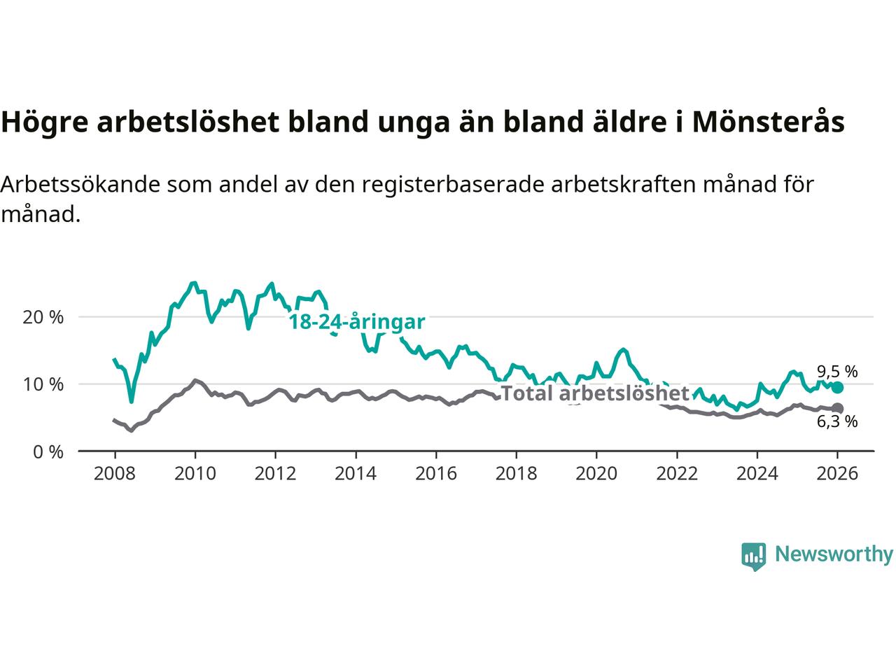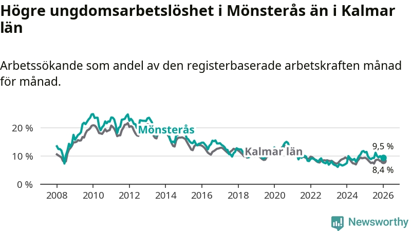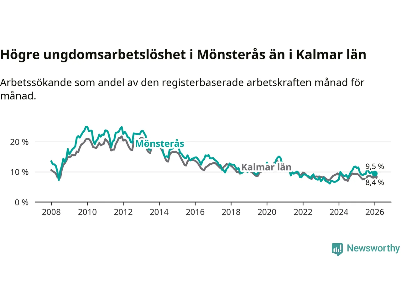 Medan Mönsterås har ungefär samma total arbetslöshet som Kalmar län, ligger ungdomsarbetslösheten 1,1 procentenheter högre i Mönsterås.