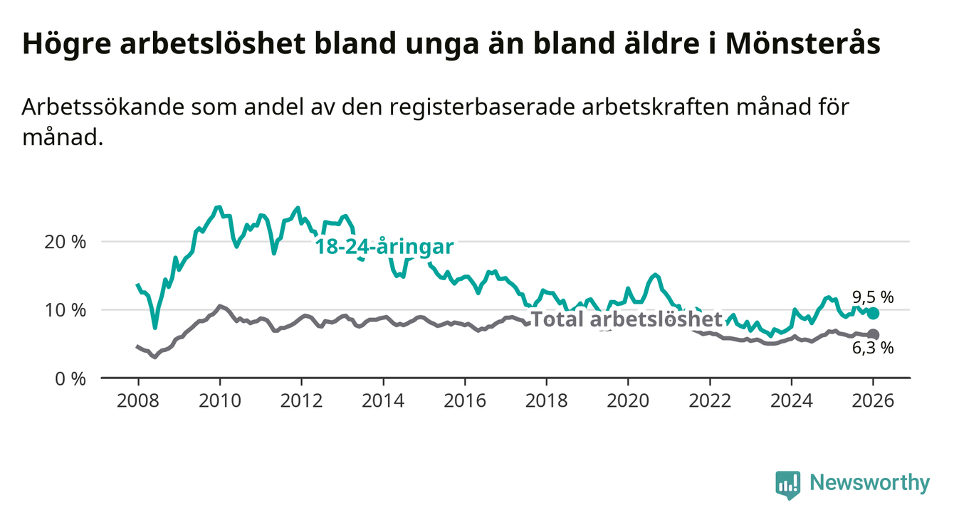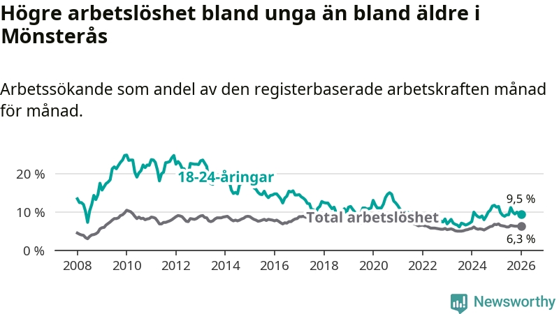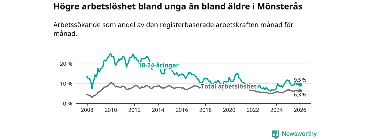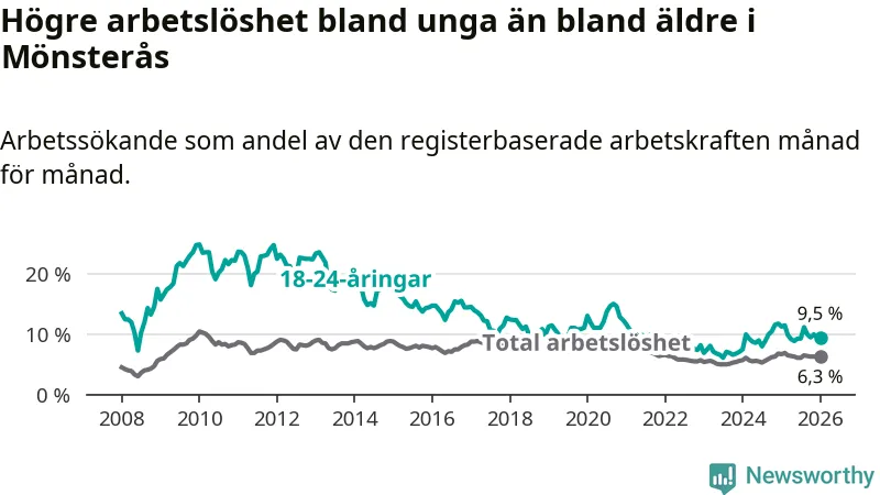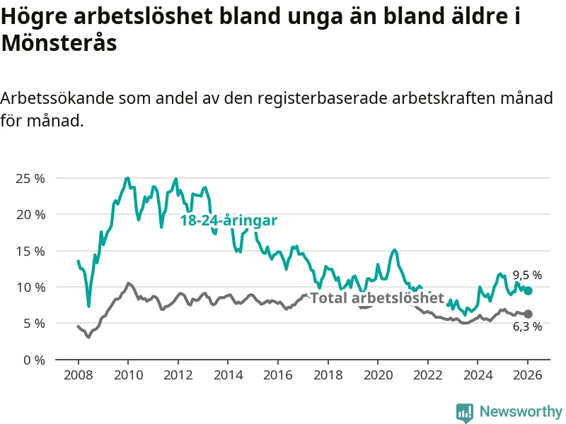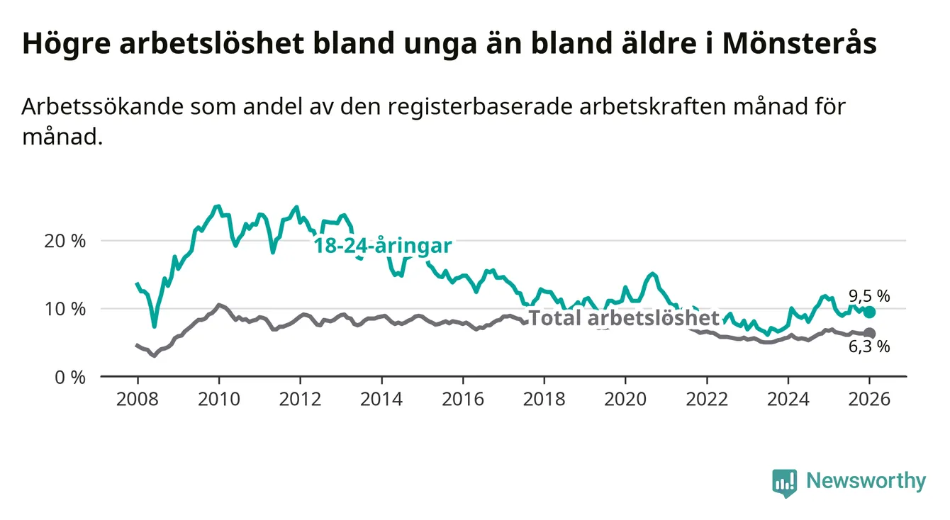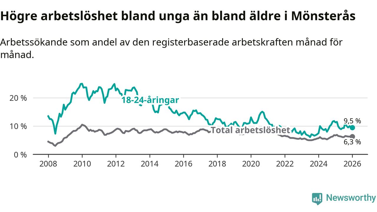 Medan Mönsterås har ungefär samma total arbetslöshet som Kalmar län, ligger ungdomsarbetslösheten 1,1 procentenheter högre i Mönsterås.