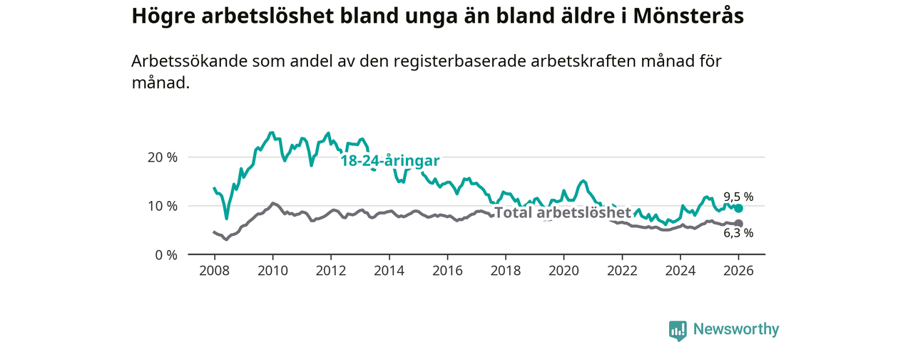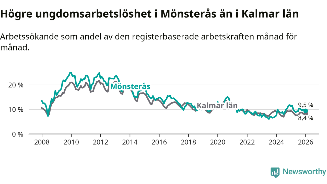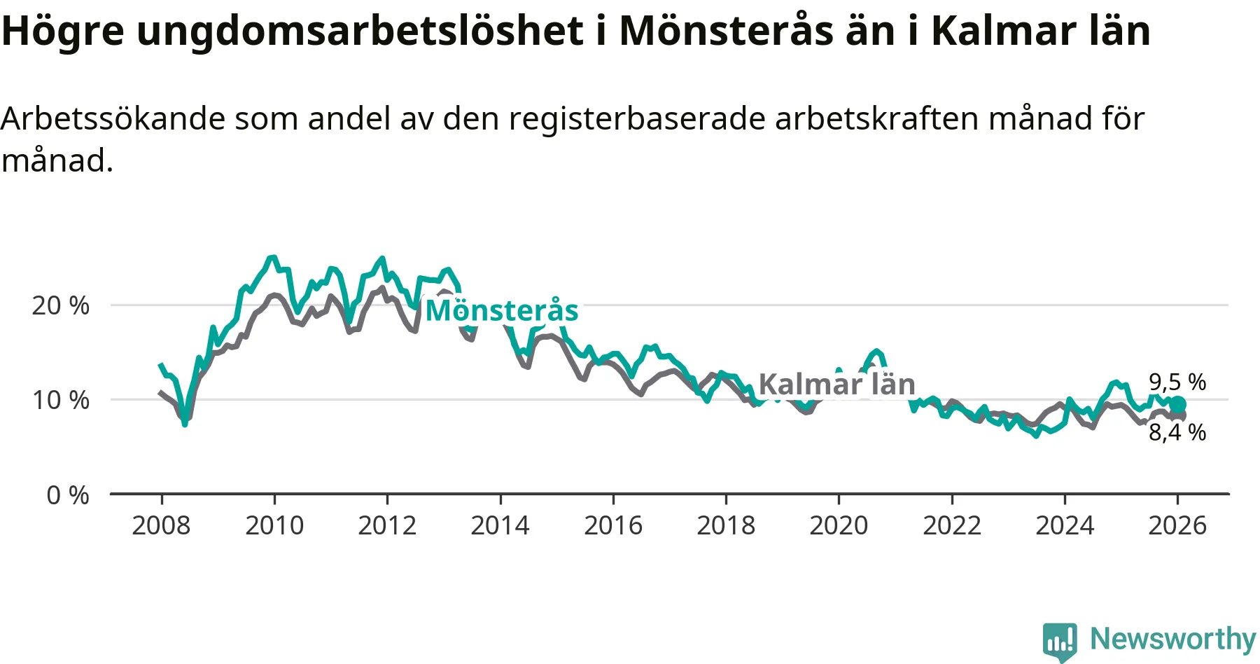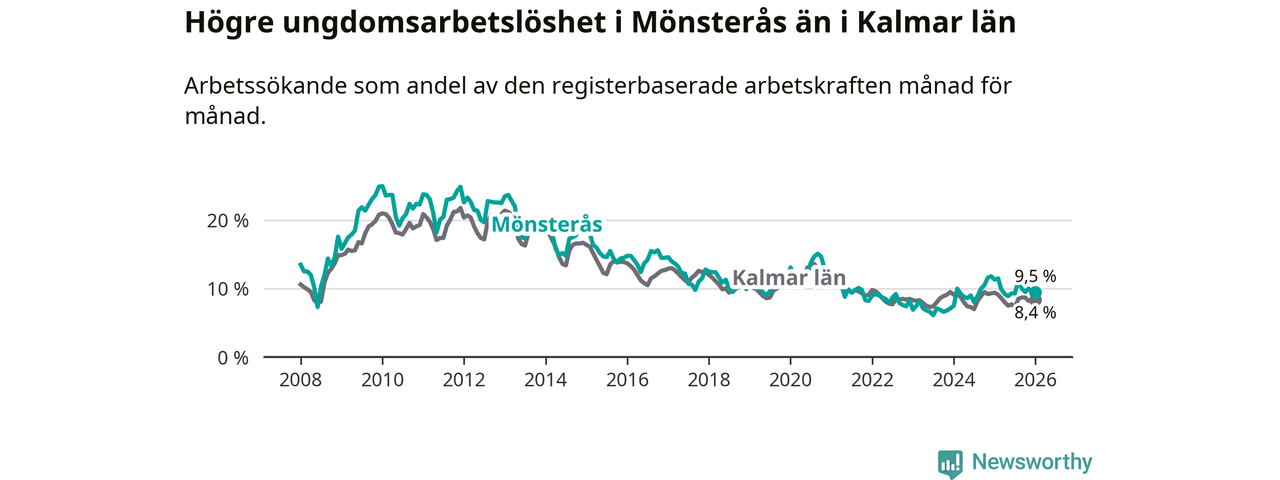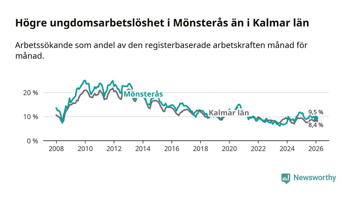 Graf: Arbetslöshet bland unga i Mönsterås kommun och Kalmar län