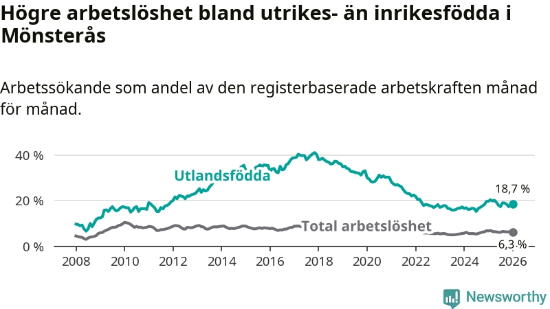 Skillnaden i arbetslöshet mellan utrikesfödda och hela befolkningen är 12,4 procentenheter i Mönsterås. Det är en mindre skillnad än för ett år sedan (−0,7 procentenheter).
