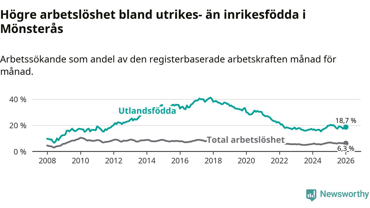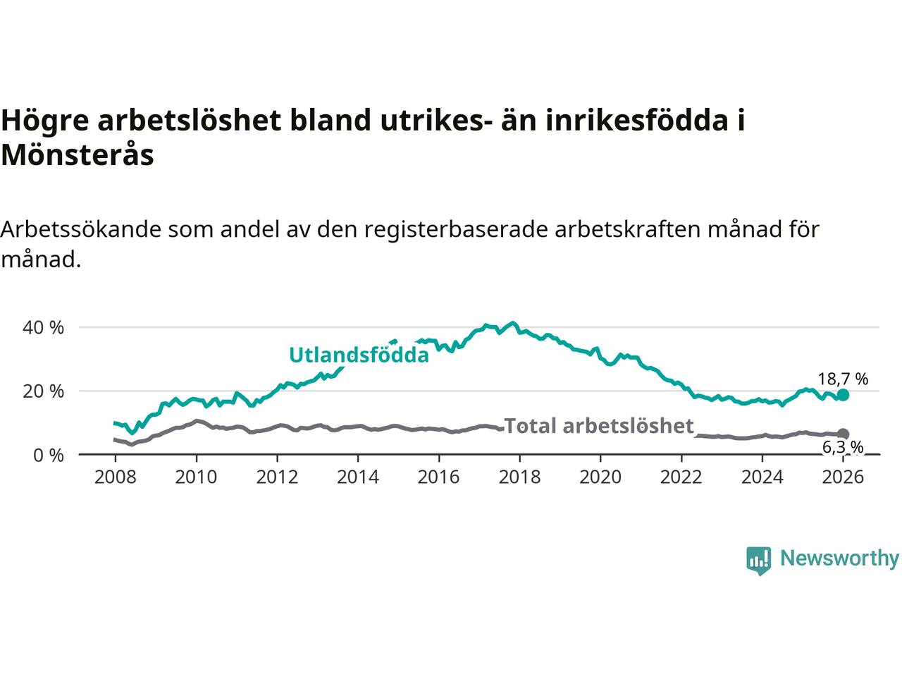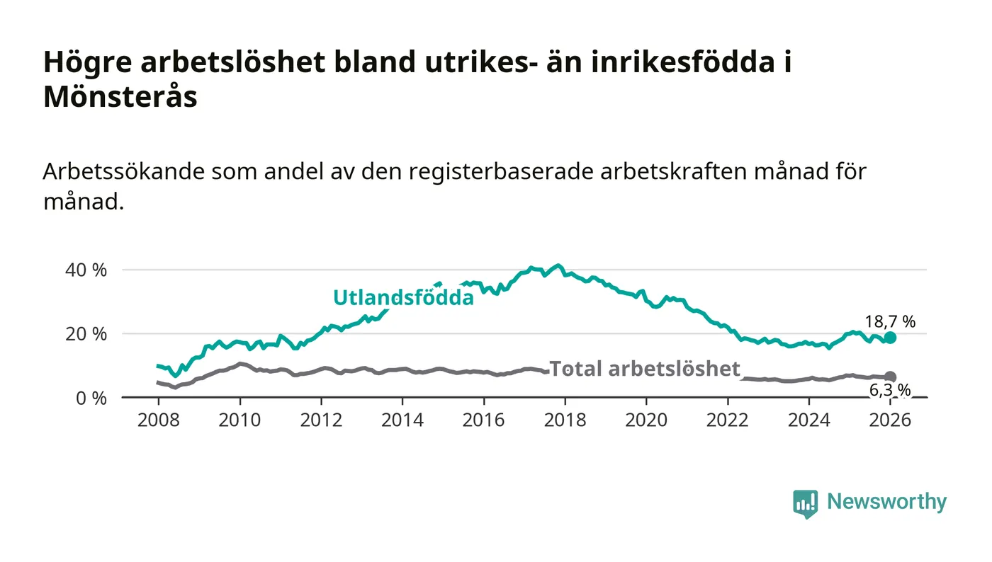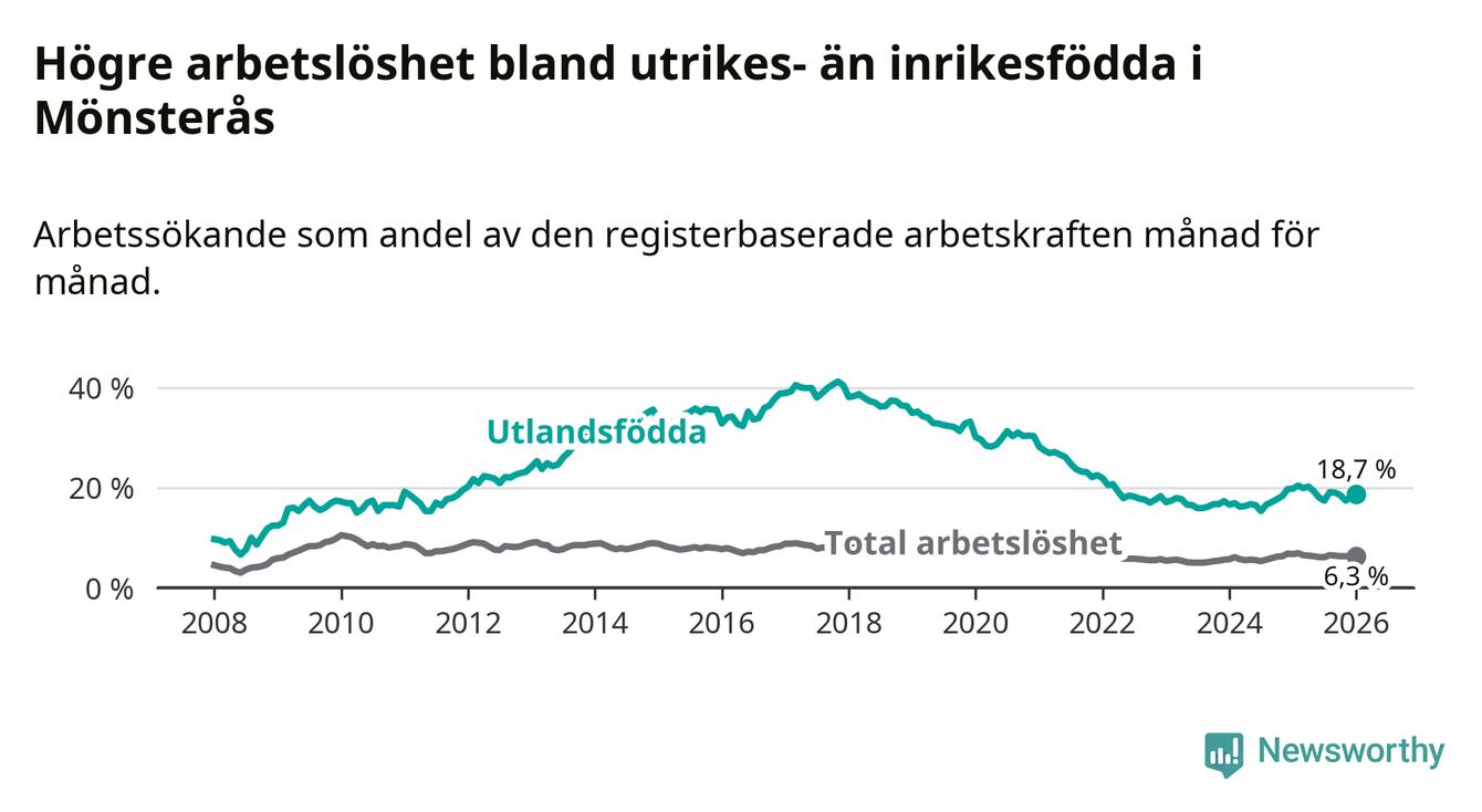 Arbetslösheten bland utlandsfödda var 18,7 procent i Mönsterås under januari månad, motsvarande 181 av 968 personer. Det är 1,1 procentenheter färre än vid samma tidpunkt i fjol (−7 om man räknar personer).