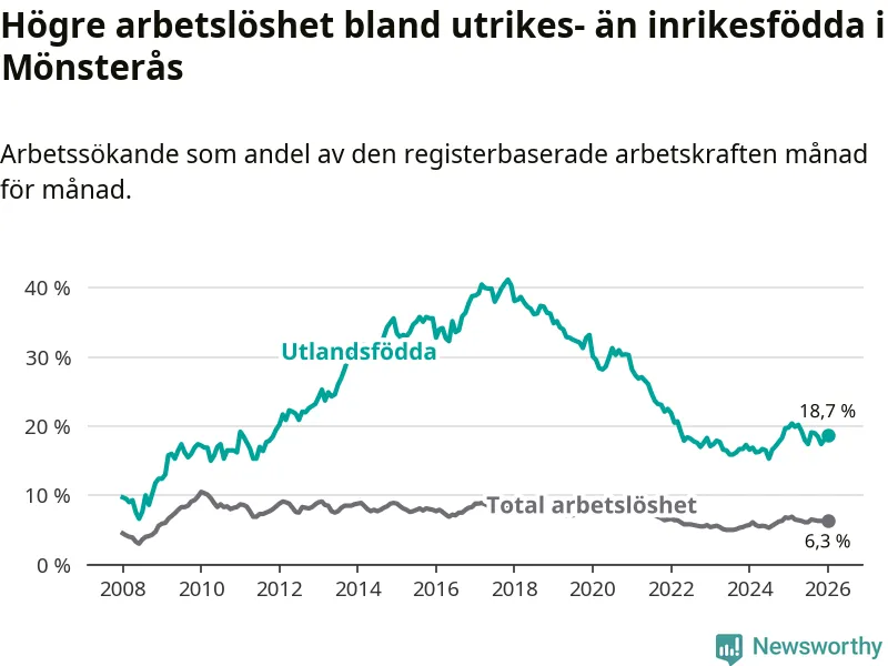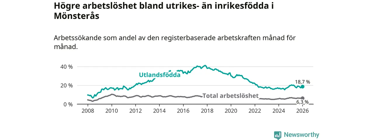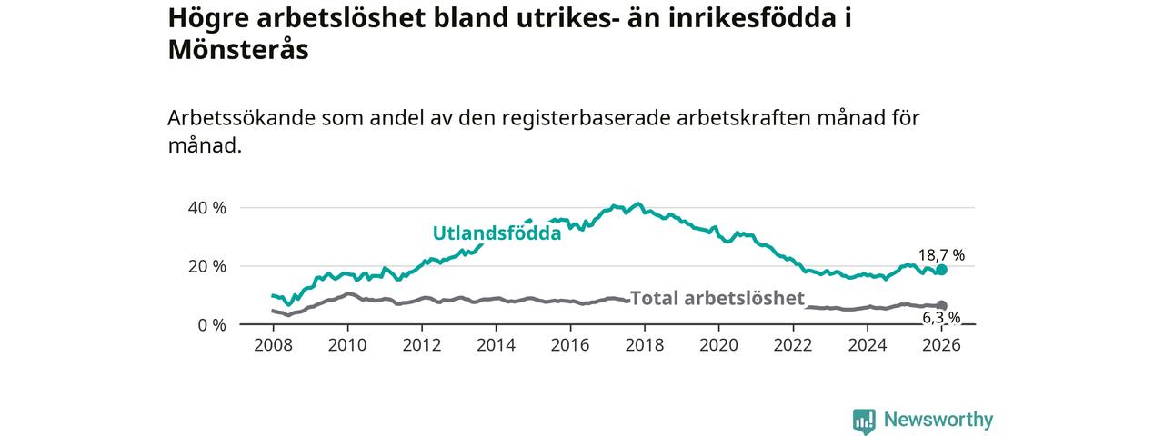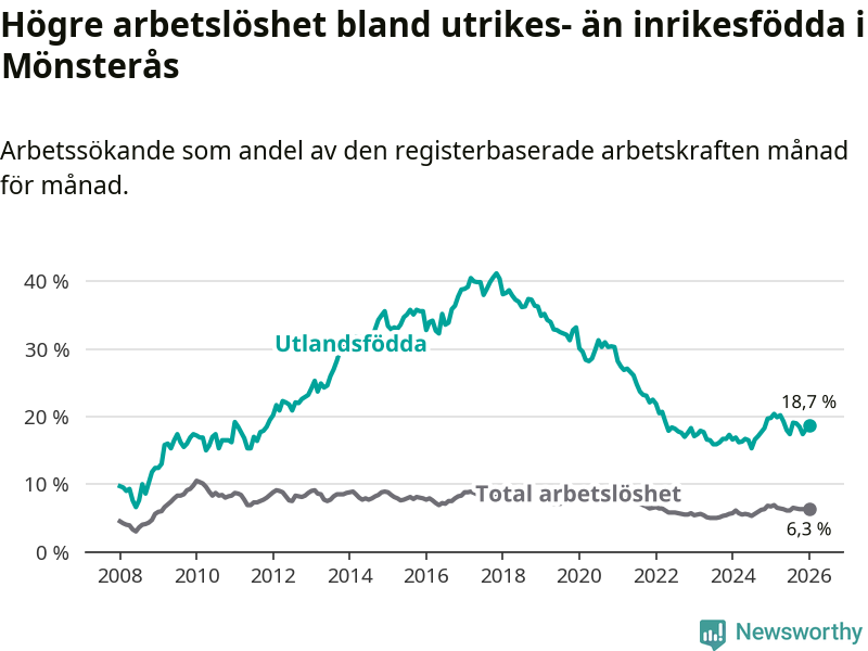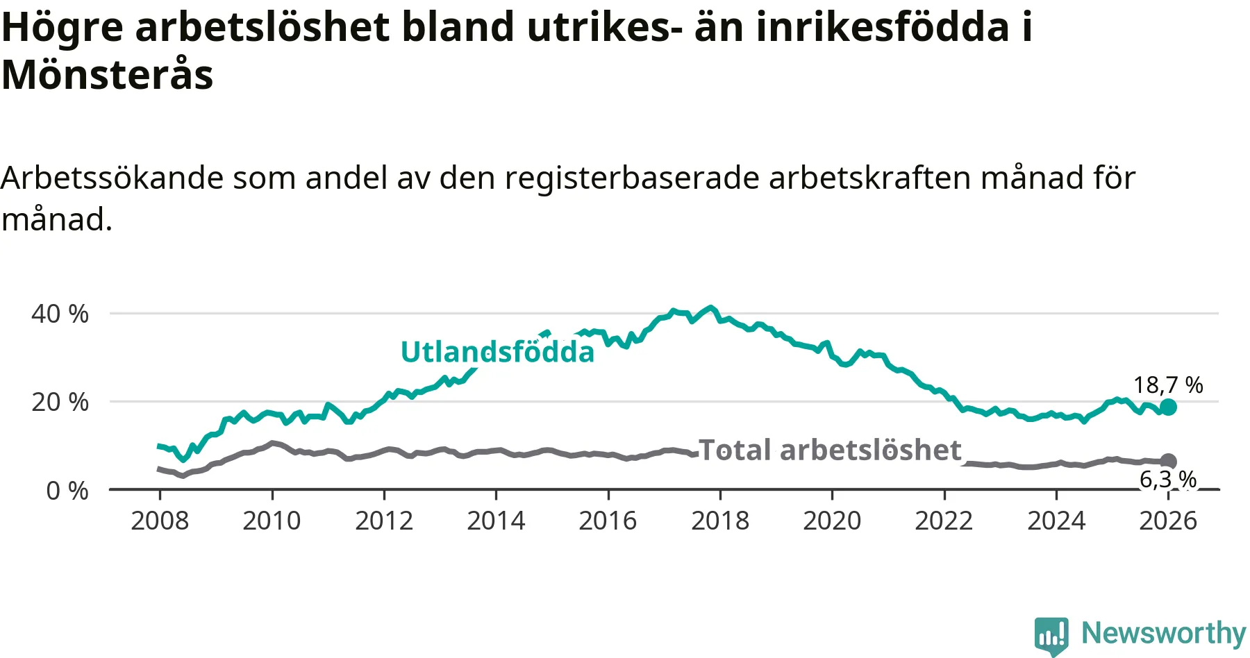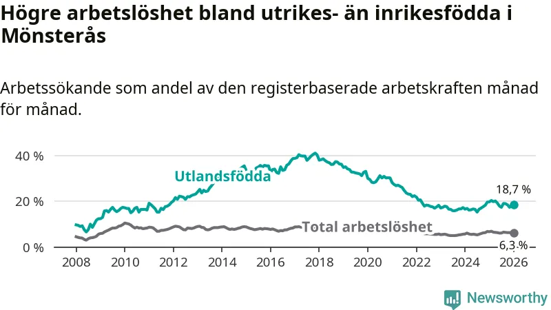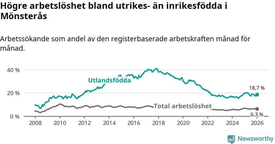 Arbetslösheten bland utlandsfödda var 18,7 procent i Mönsterås under januari månad, motsvarande 181 av 968 personer. Det är 1,1 procentenheter färre än vid samma tidpunkt i fjol (−7 om man räknar personer).