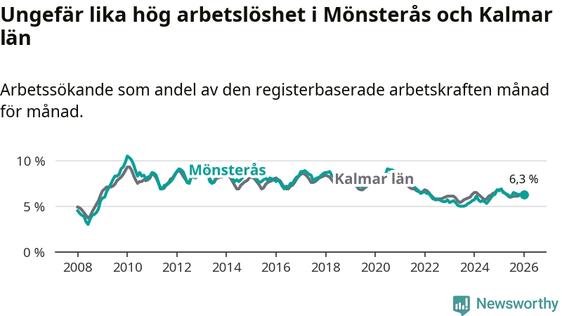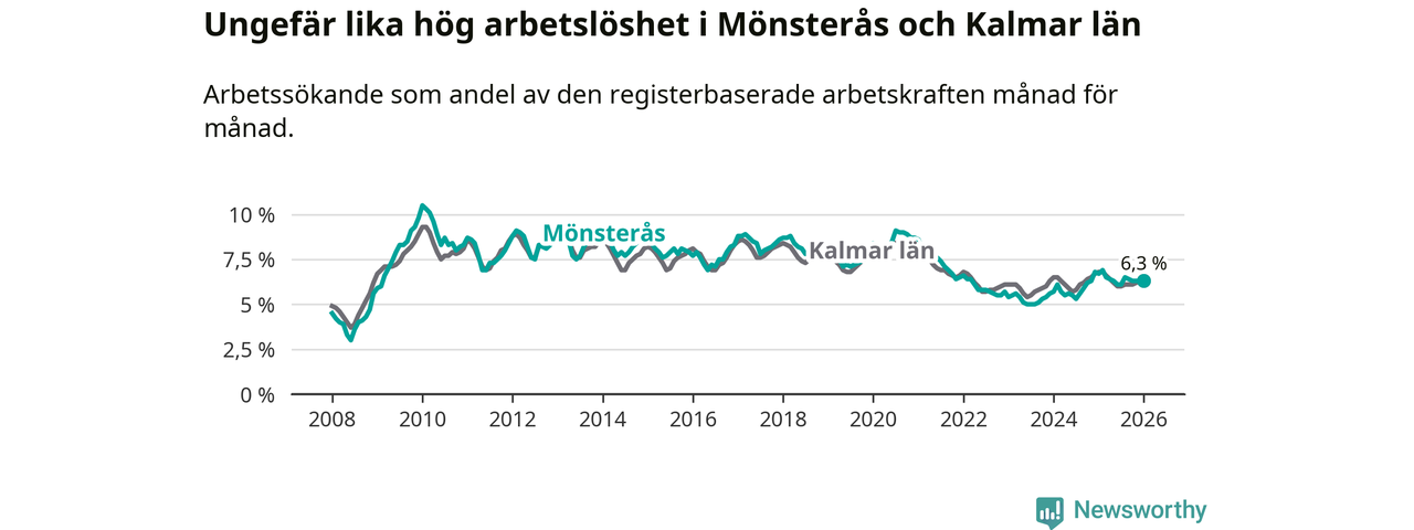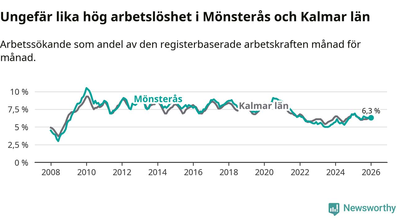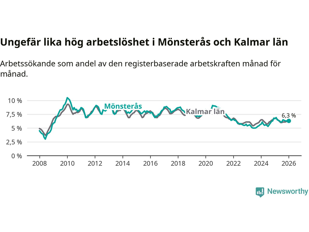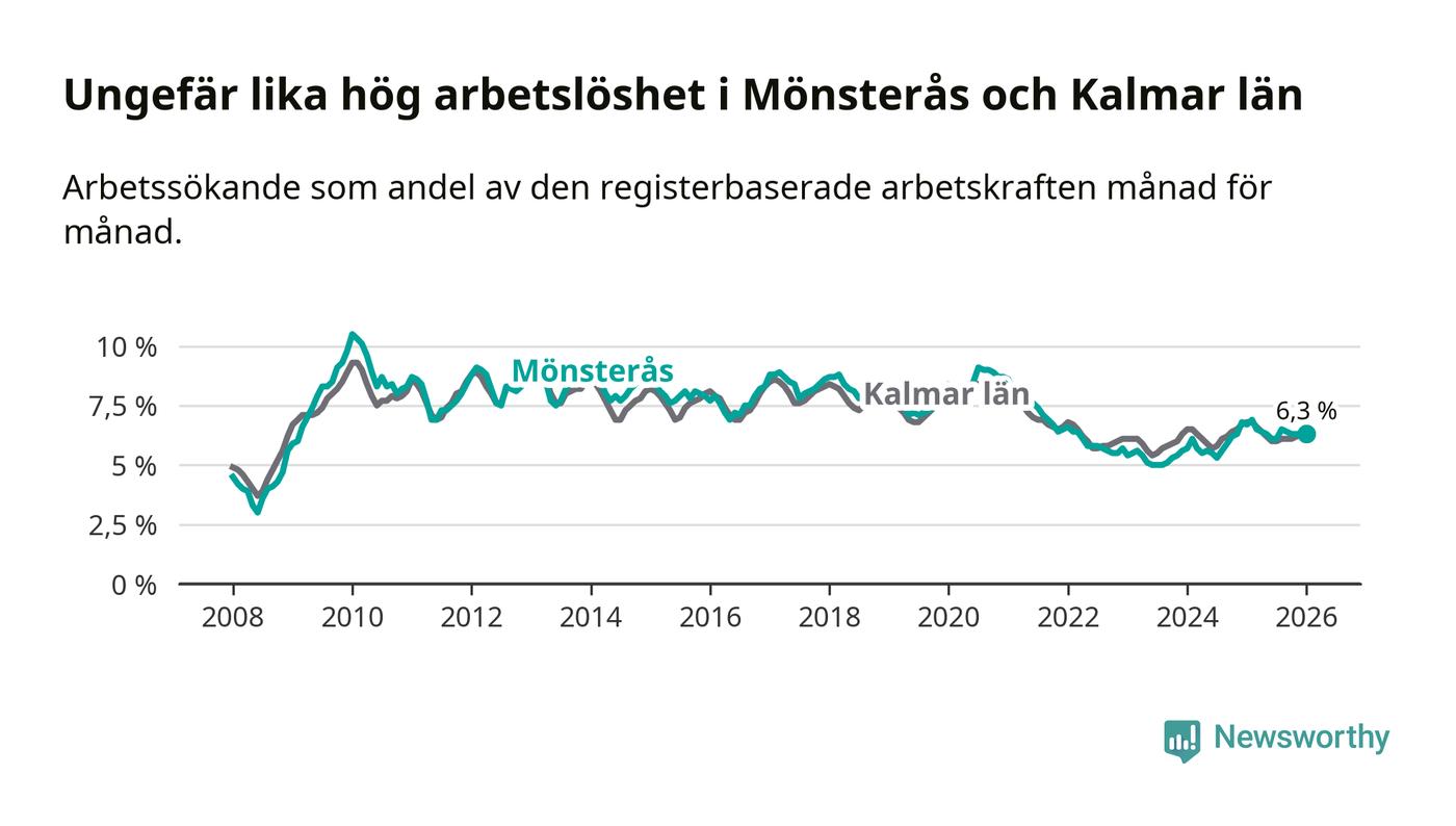 Under januari månad rapporterade Mönsterås kommun en total arbetslöshet på 6,3 procent. Det är en minskning jämfört med samma tidpunkt i fjol (−0,4 procentenheter). Även i Kalmar län sjunker arbetslösheten .