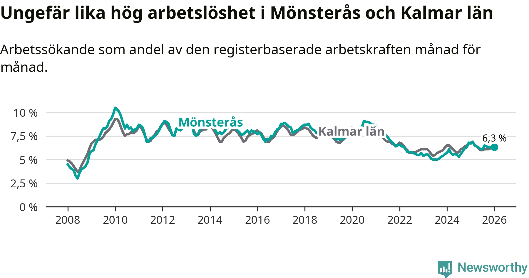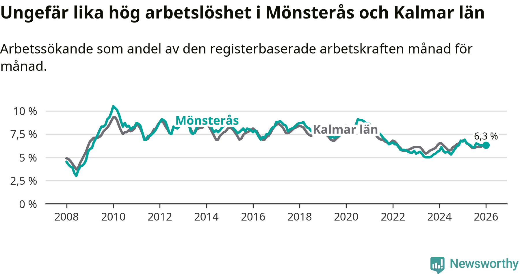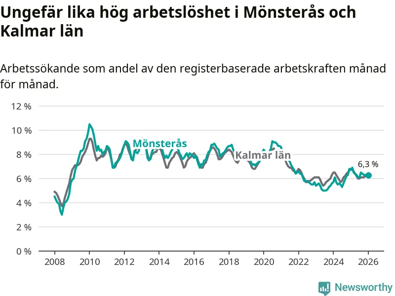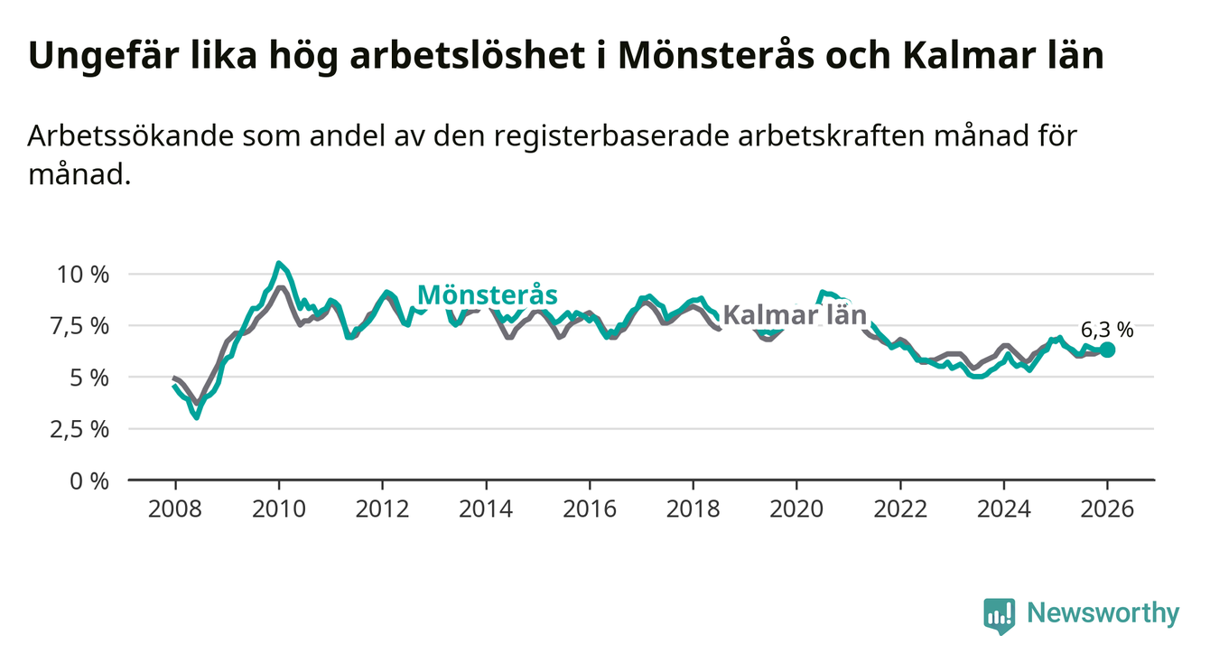 Under januari månad rapporterade Mönsterås kommun en total arbetslöshet på 6,3 procent. Det är en minskning jämfört med samma tidpunkt i fjol (−0,4 procentenheter). Även i Kalmar län sjunker arbetslösheten .