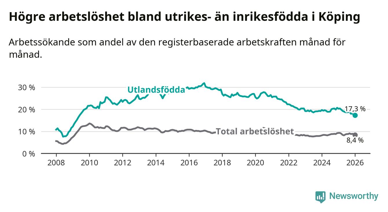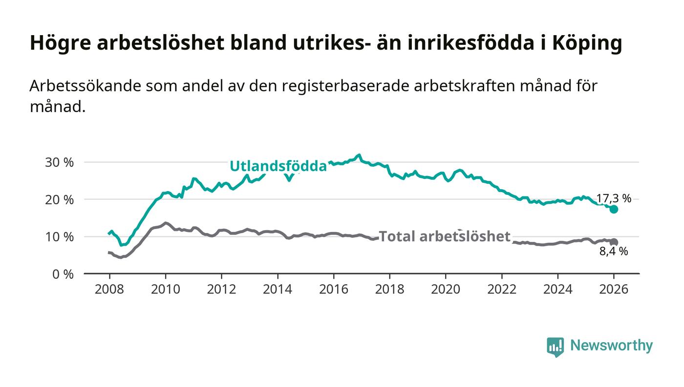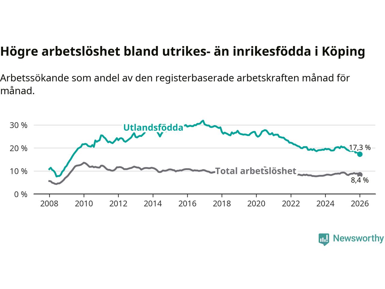 Arbetslösheten bland utlandsfödda var 17,3 procent i Köping under januari månad, motsvarande 525 av 3 035 personer. Det är 3,0 procentenheter färre än vid samma tidpunkt i fjol (−91 om man räknar personer). Därmed är de utlandsföddas arbetslöshet lägre än vid samma tidpunkt i fjol för åttonde månaden i följd. Sedan maj 2025 har arbetslösheten bland utlandsfödda minskat från 19,0 till 17,3 procent. Den nuvarande arbetslöshetsnivån är den lägsta sedan juni 2009.