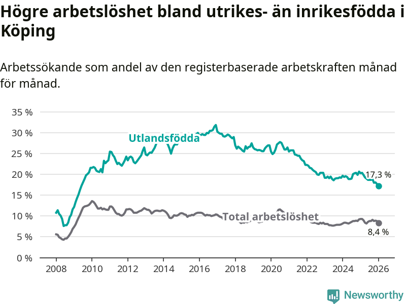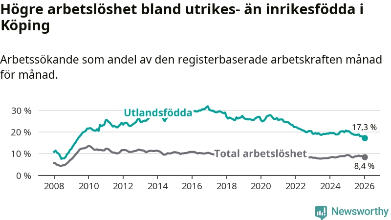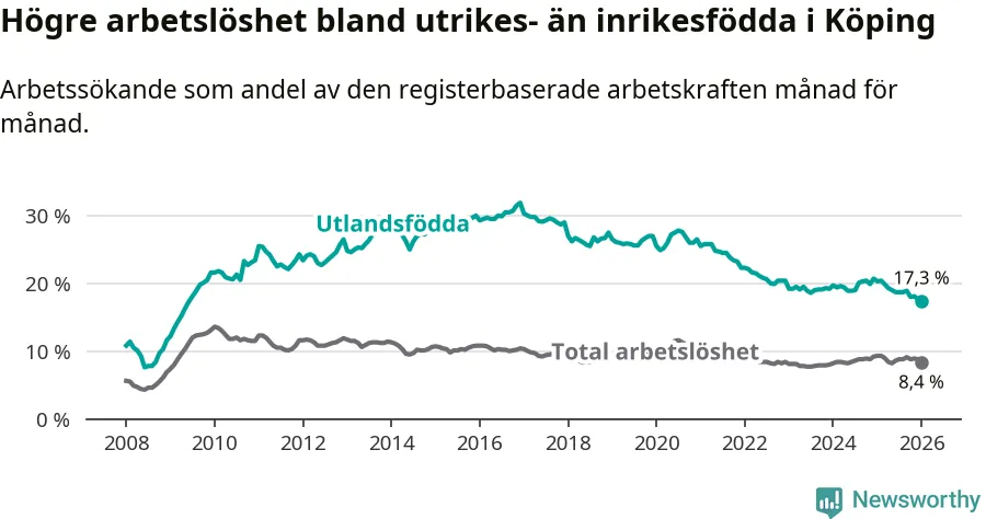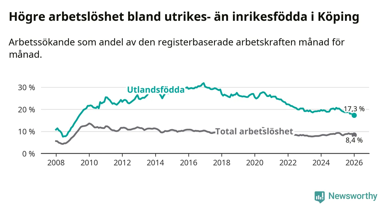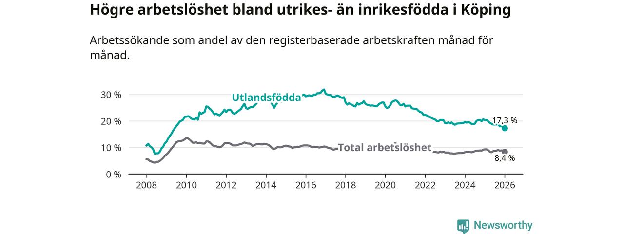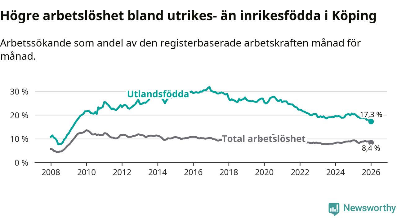 Arbetslösheten bland utlandsfödda var 17,3 procent i Köping under januari månad, motsvarande 525 av 3 035 personer. Det är 3,0 procentenheter färre än vid samma tidpunkt i fjol (−91 om man räknar personer). Därmed är de utlandsföddas arbetslöshet lägre än vid samma tidpunkt i fjol för åttonde månaden i följd. Sedan maj 2025 har arbetslösheten bland utlandsfödda minskat från 19,0 till 17,3 procent. Den nuvarande arbetslöshetsnivån är den lägsta sedan juni 2009.