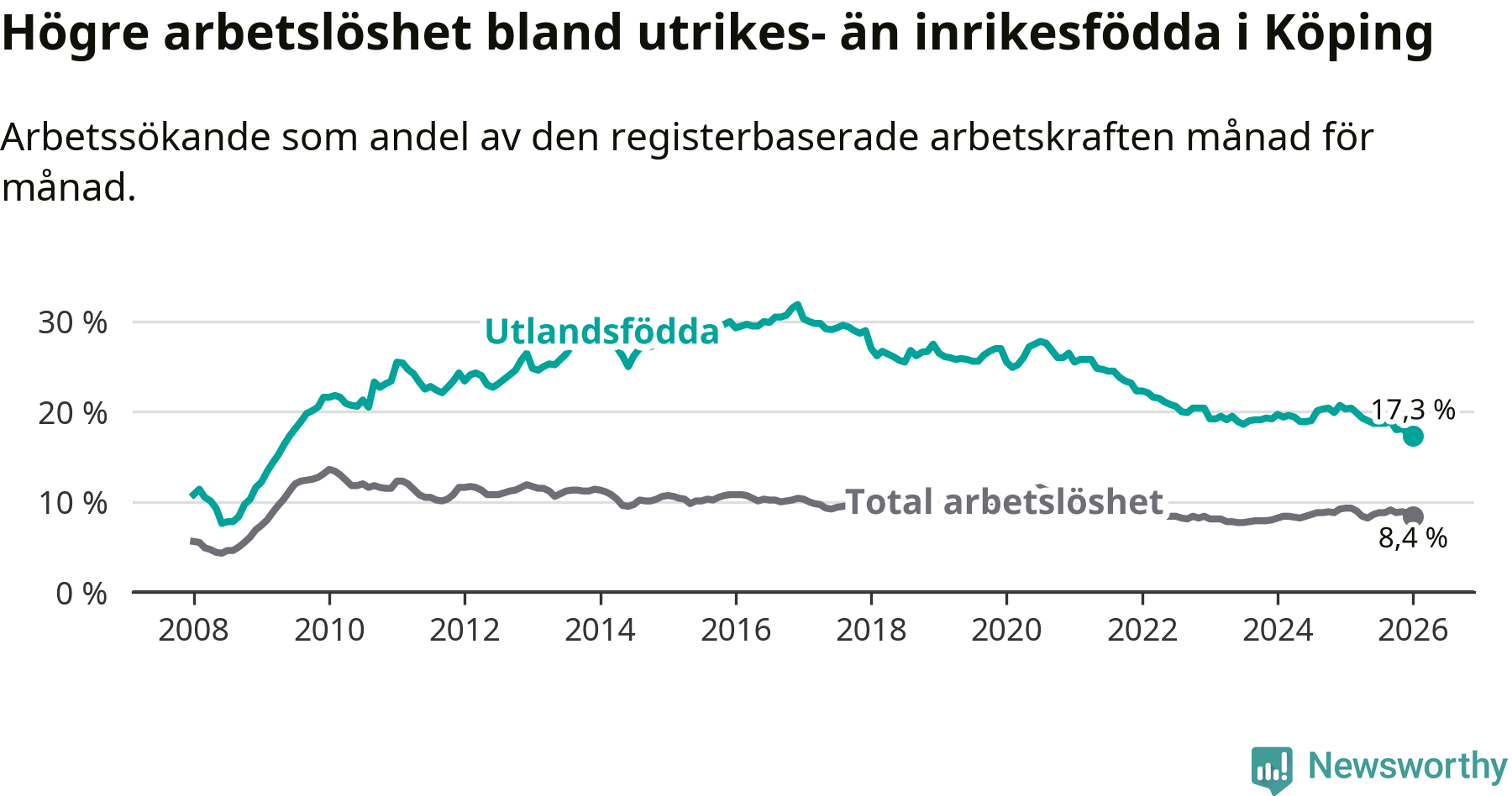 Läs mer om arbetslösheten bland utlandsfödda längre ner i den här texten.
