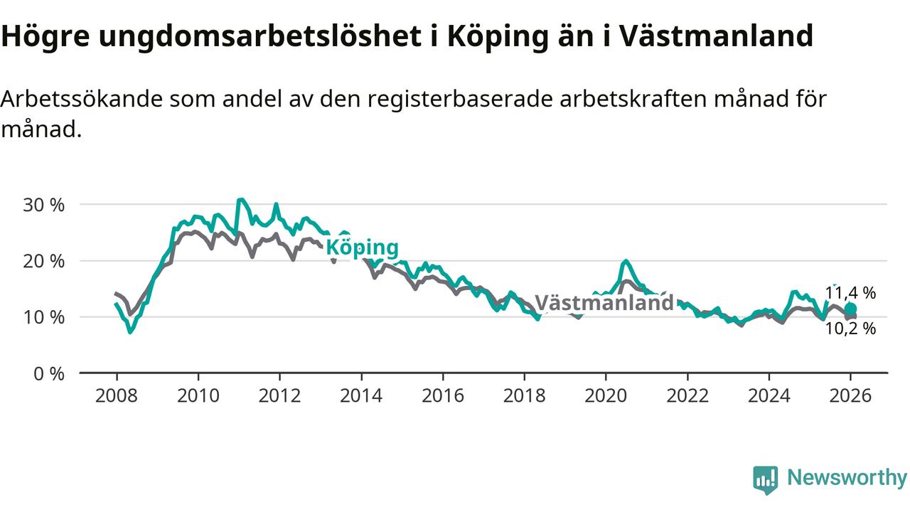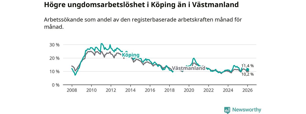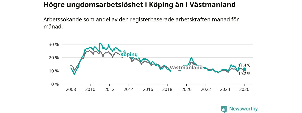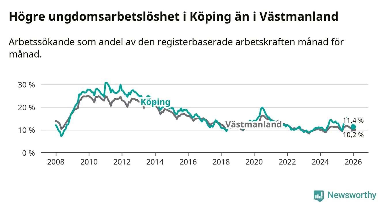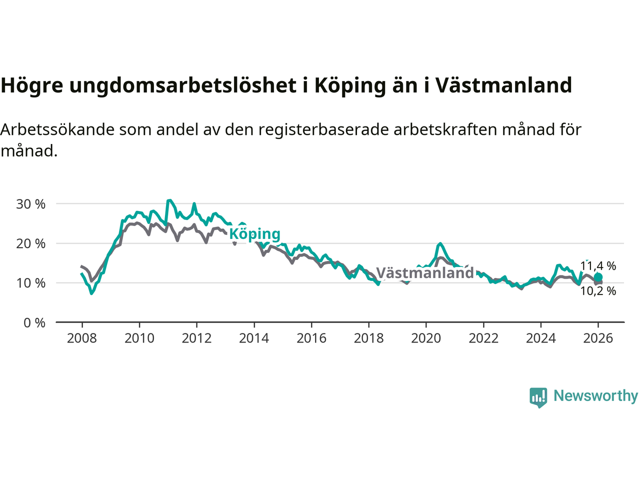 Graf: Arbetslöshet bland unga i Köpings kommun och Västmanlands län