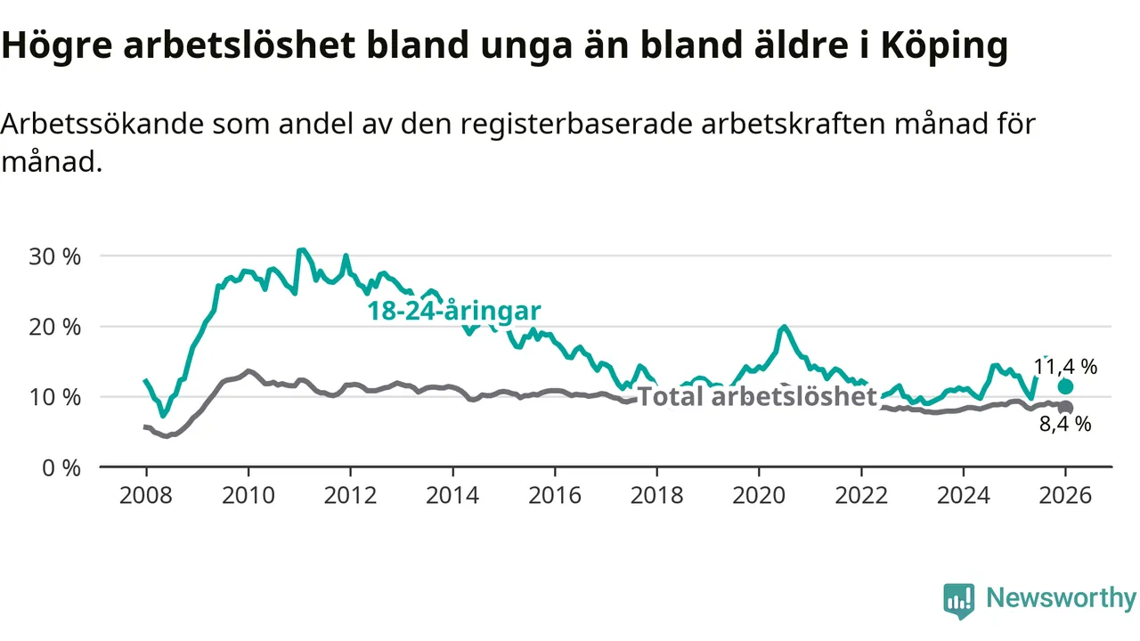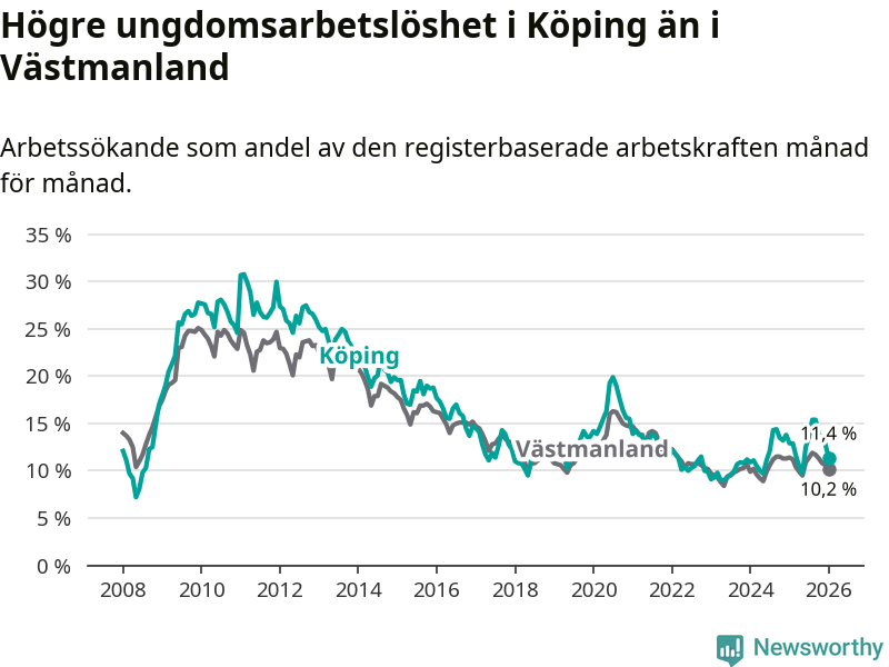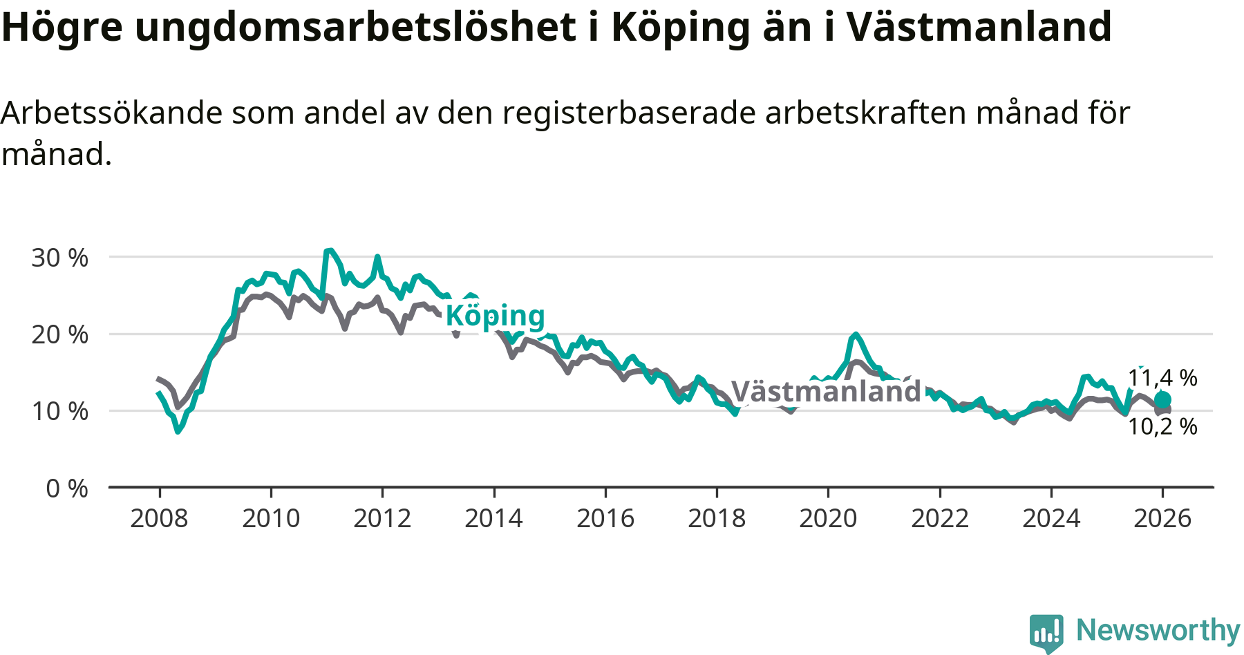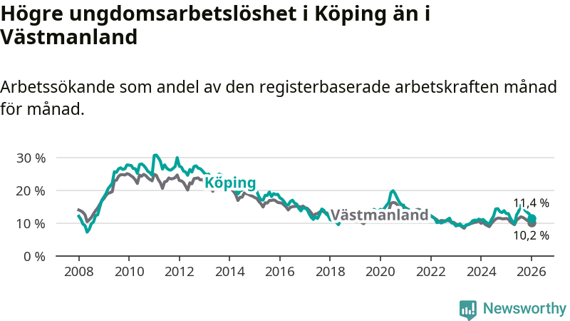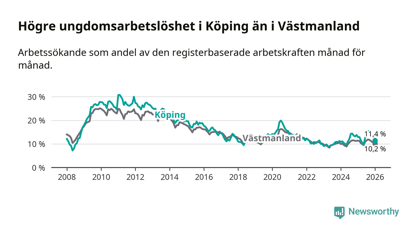 Graf: Arbetslöshet bland unga i Köpings kommun och Västmanlands län