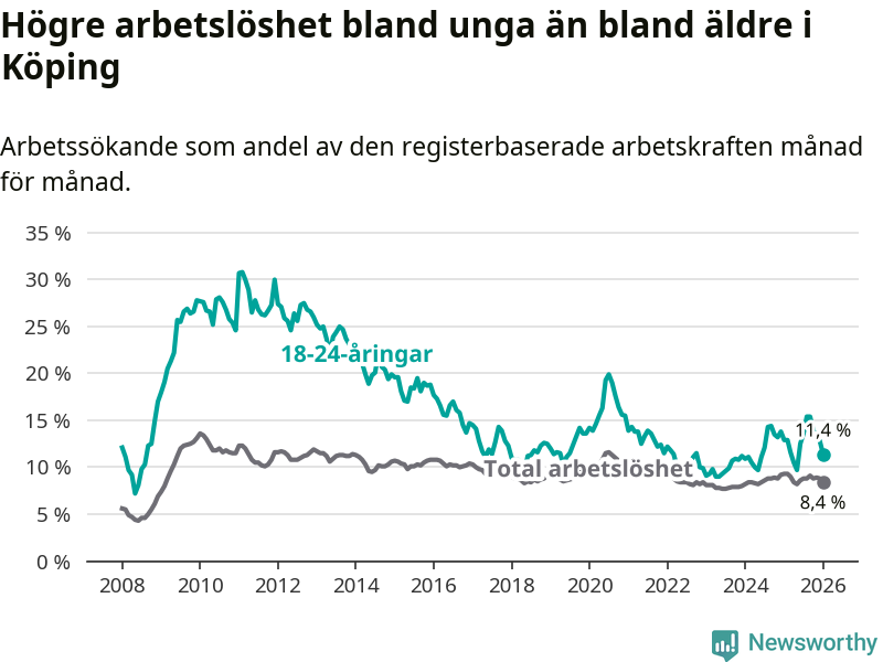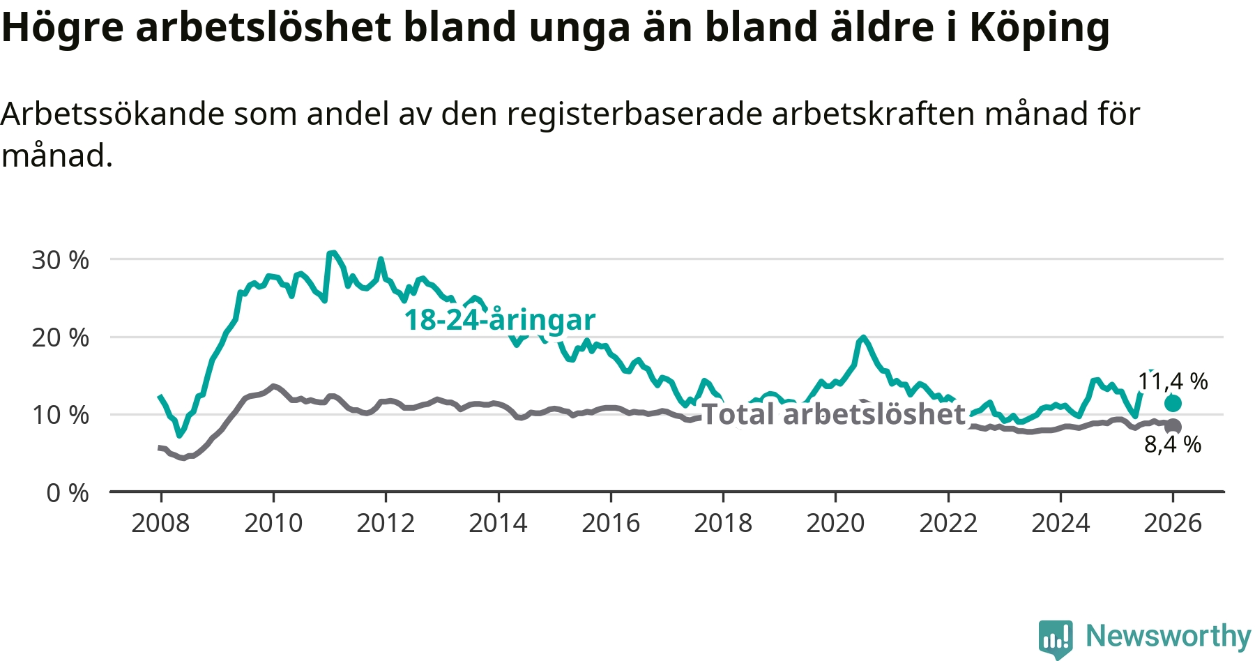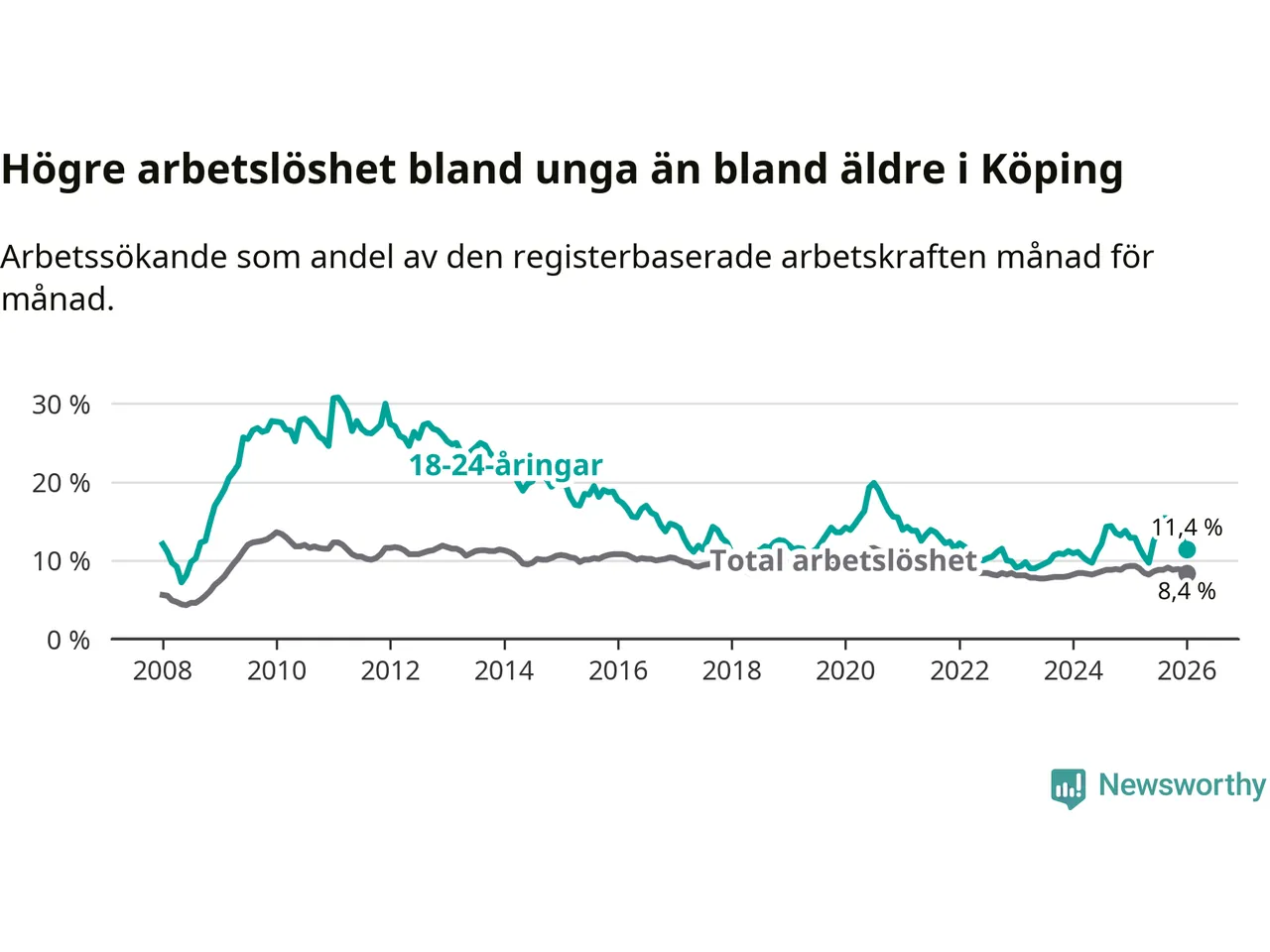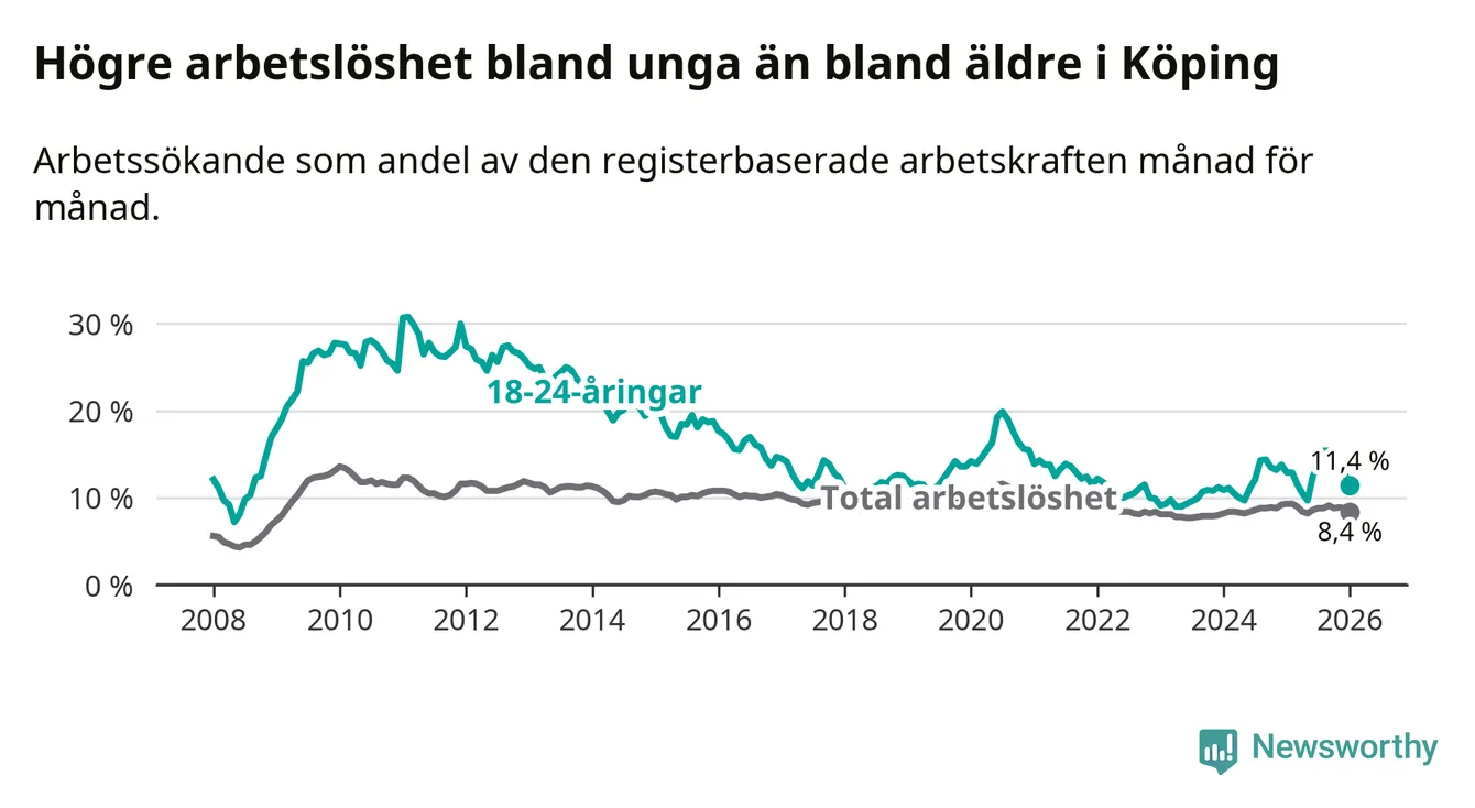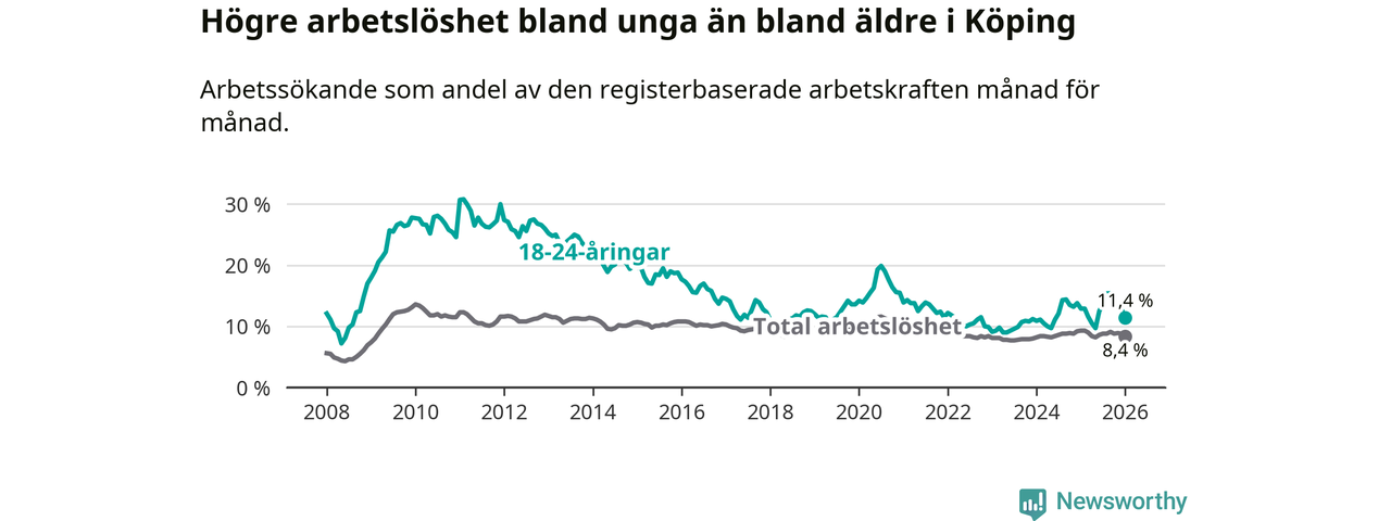 Graf: Arbetslöshet bland unga i Köpings kommun och Västmanlands län