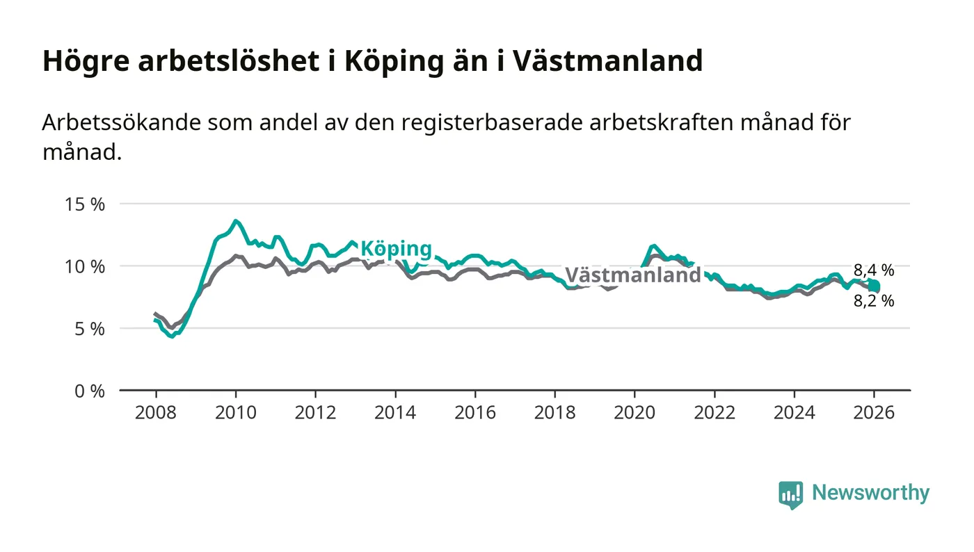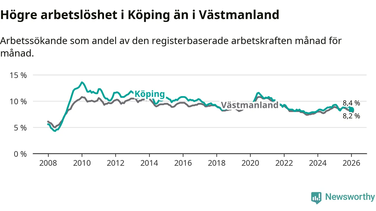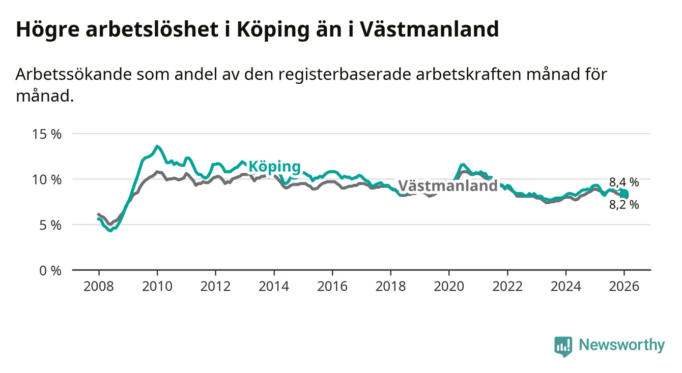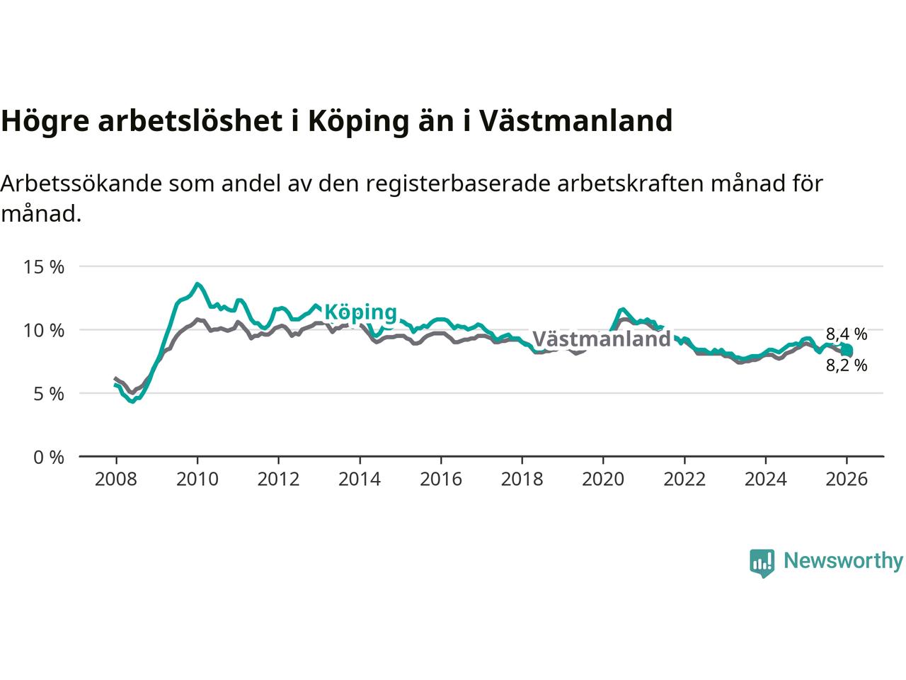 Under januari månad rapporterade Köpings kommun en total arbetslöshet på 8,4 procent. Det är en minskning jämfört med samma tidpunkt i fjol (−0,9 procentenheter). Även i Västmanlands län sjunker arbetslösheten .
