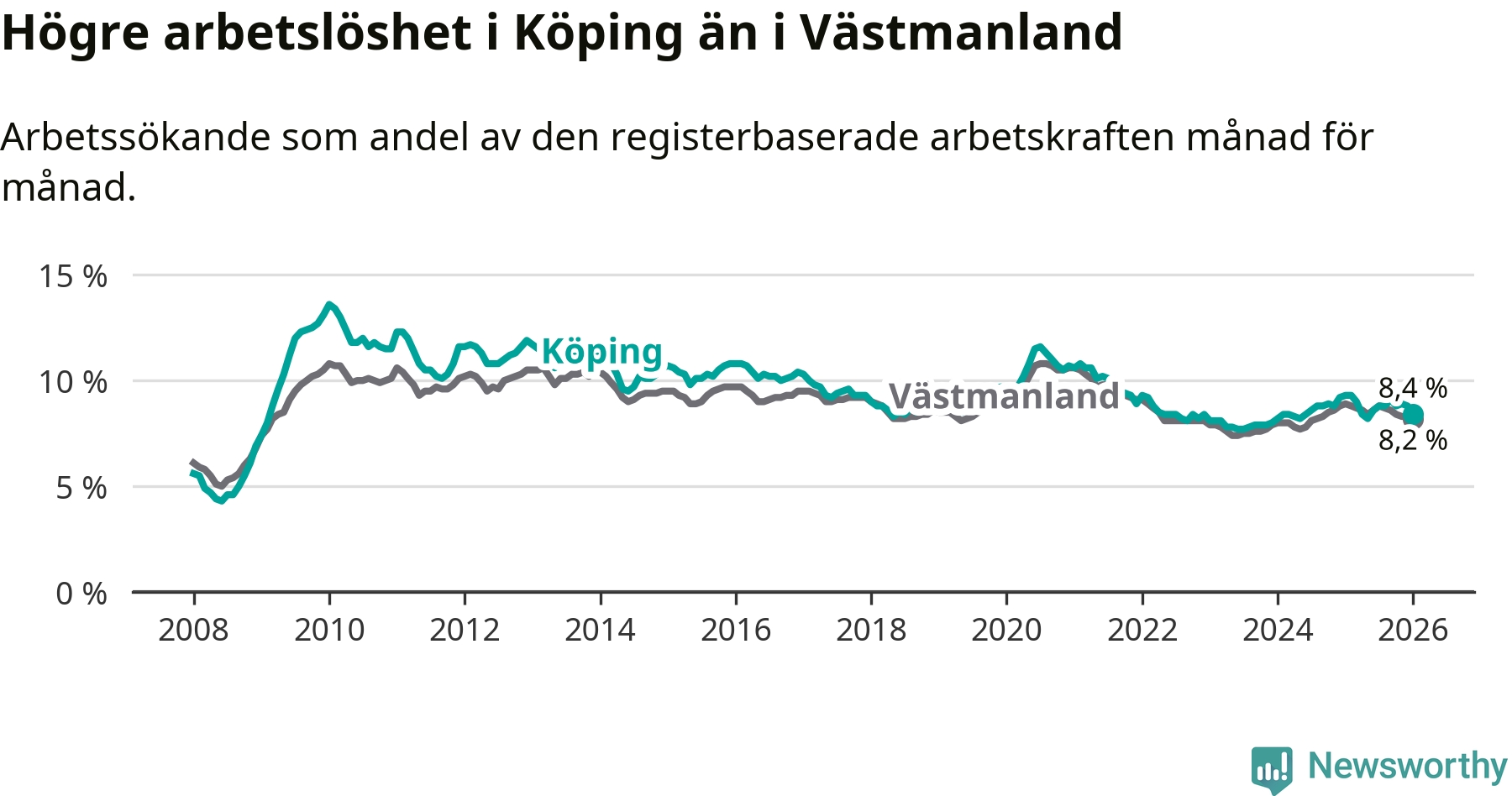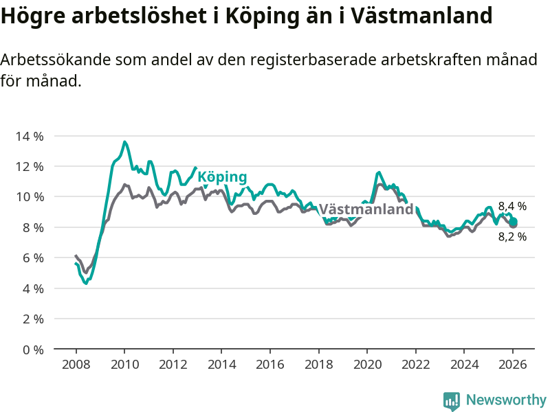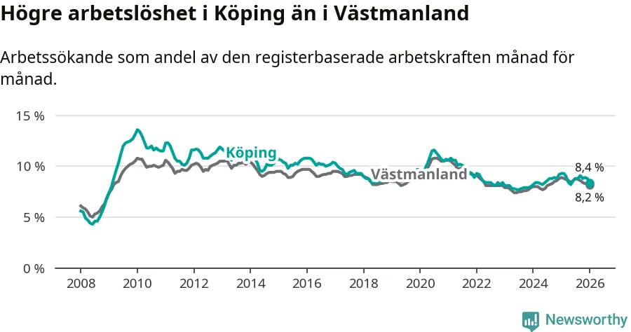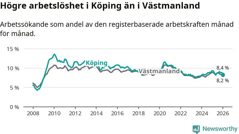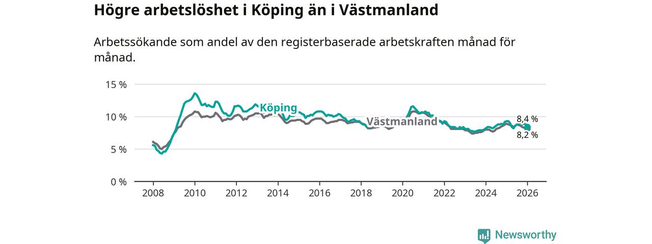 Under januari månad rapporterade Köpings kommun en total arbetslöshet på 8,4 procent. Det är en minskning jämfört med samma tidpunkt i fjol (−0,9 procentenheter). Även i Västmanlands län sjunker arbetslösheten .