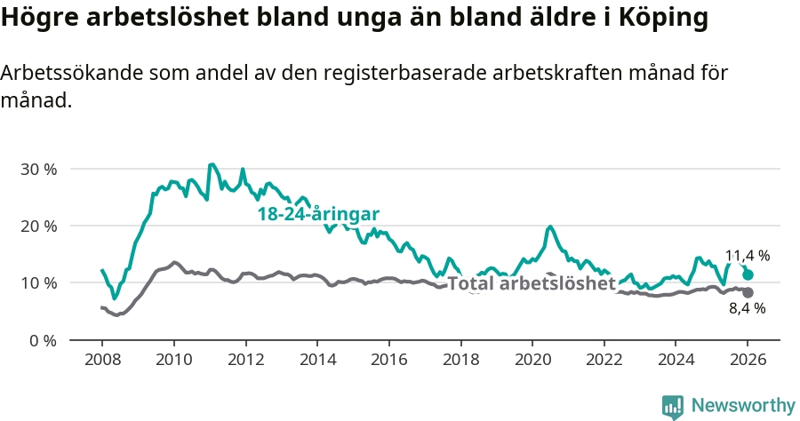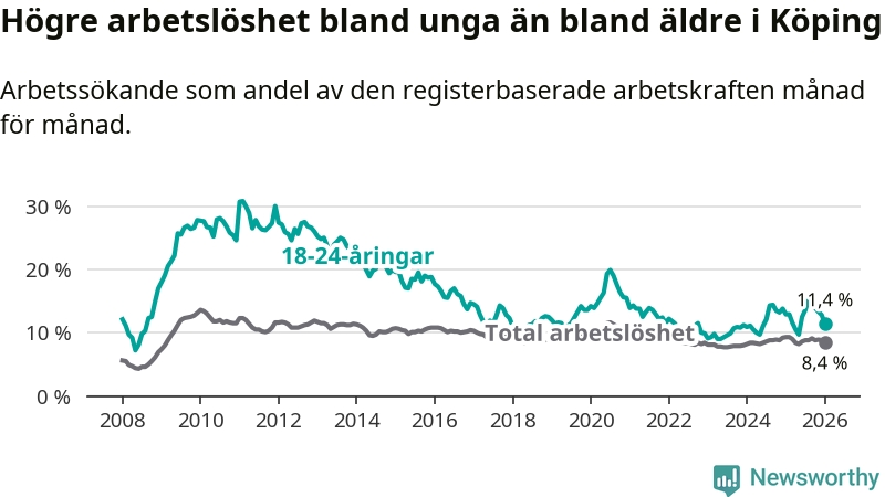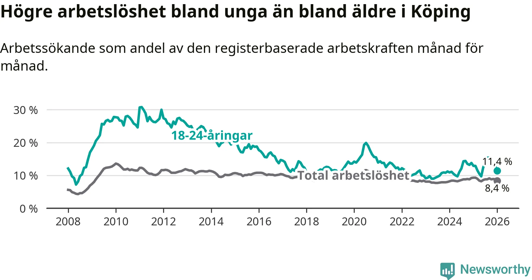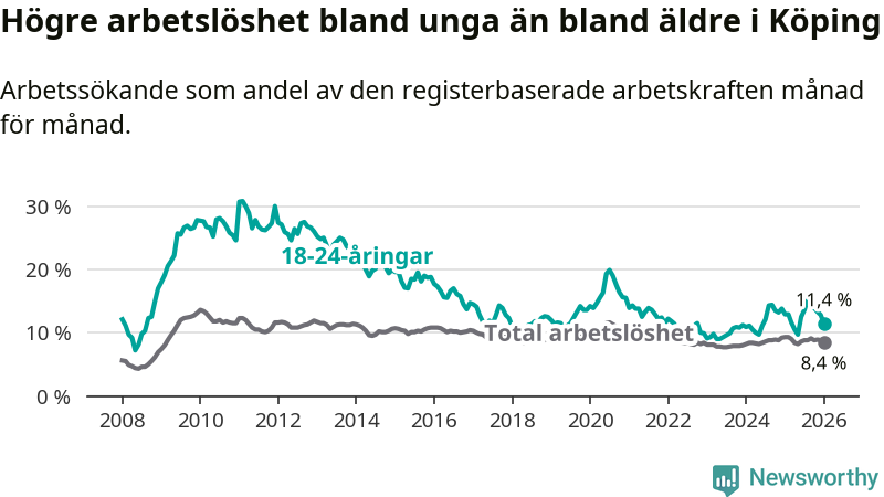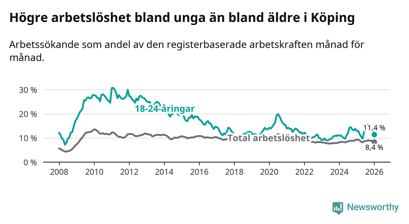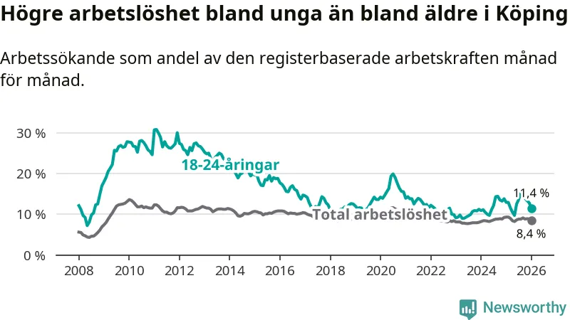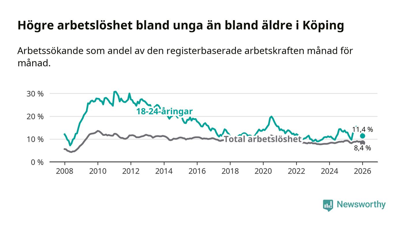 Precis som den totala arbetslösheten ligger ungdomsarbetslösheten i Köping högre än i Västmanland som helhet. Skillnaden mellan kommunen och länet är 1,2 procentenheter.