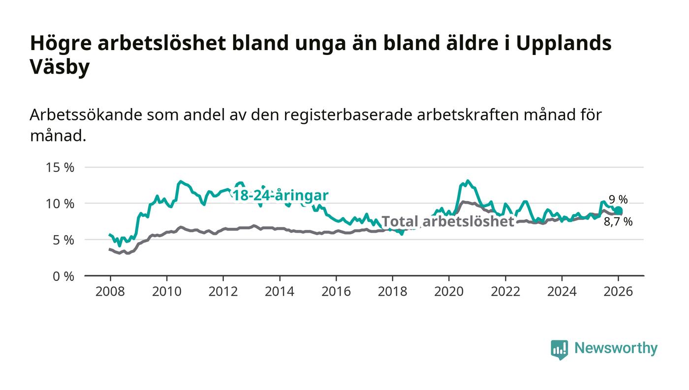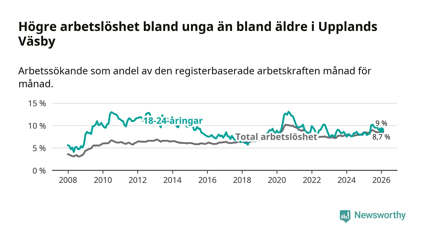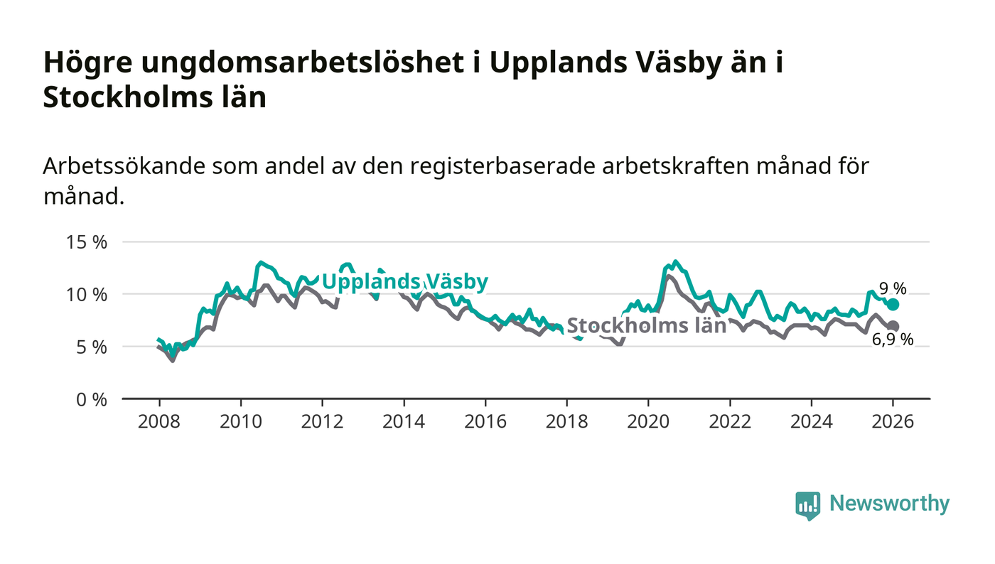 I och med den senaste månadens uppgång har de ungas arbetslöshet i Upplands Väsby stigit tio månader i följd (upp från 7,9 procent i mars 2025 till 9,0 procent nu).