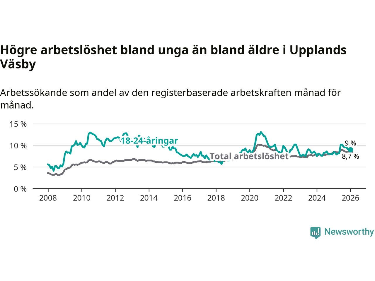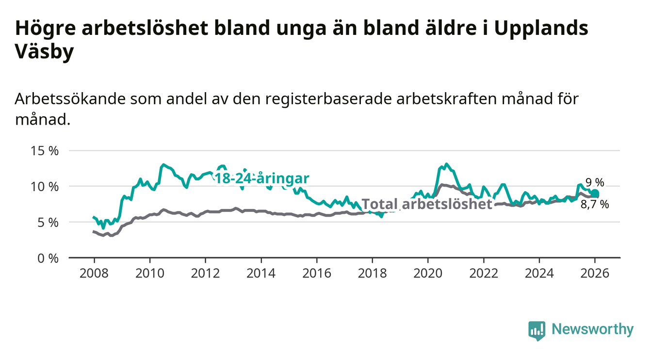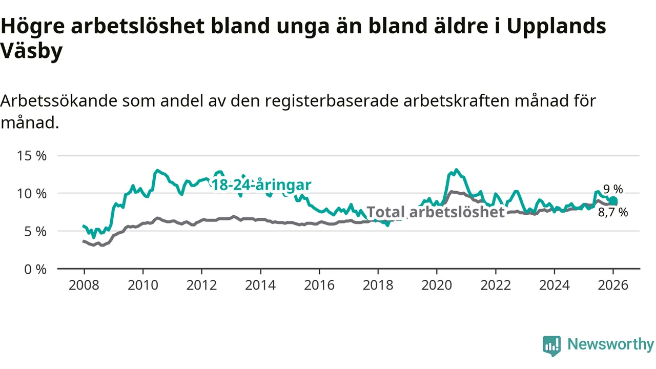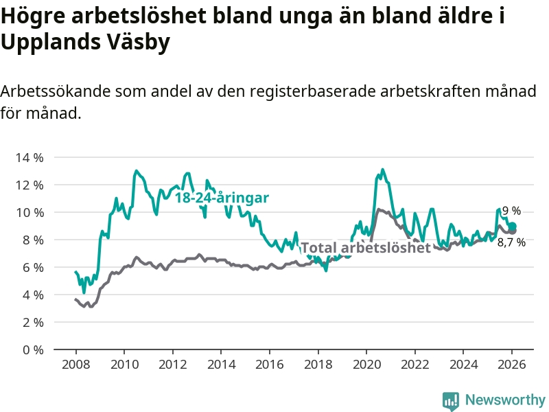 I och med den senaste månadens uppgång har de ungas arbetslöshet i Upplands Väsby stigit tio månader i följd (upp från 7,9 procent i mars 2025 till 9,0 procent nu).