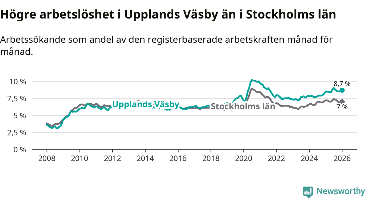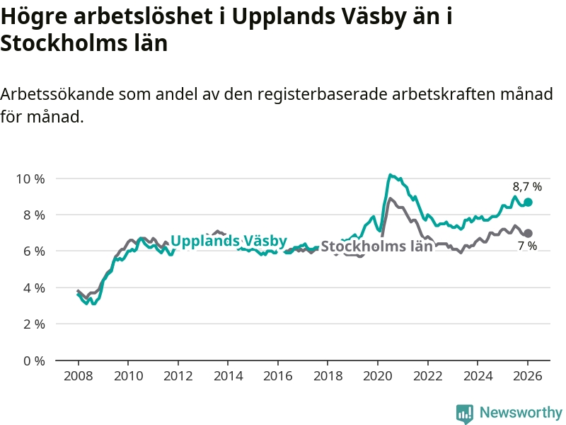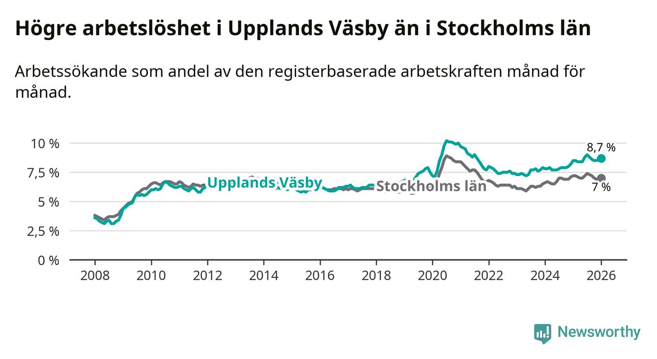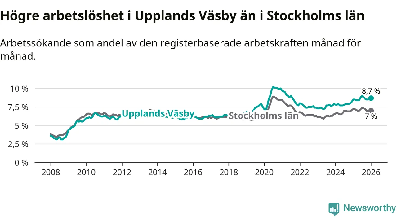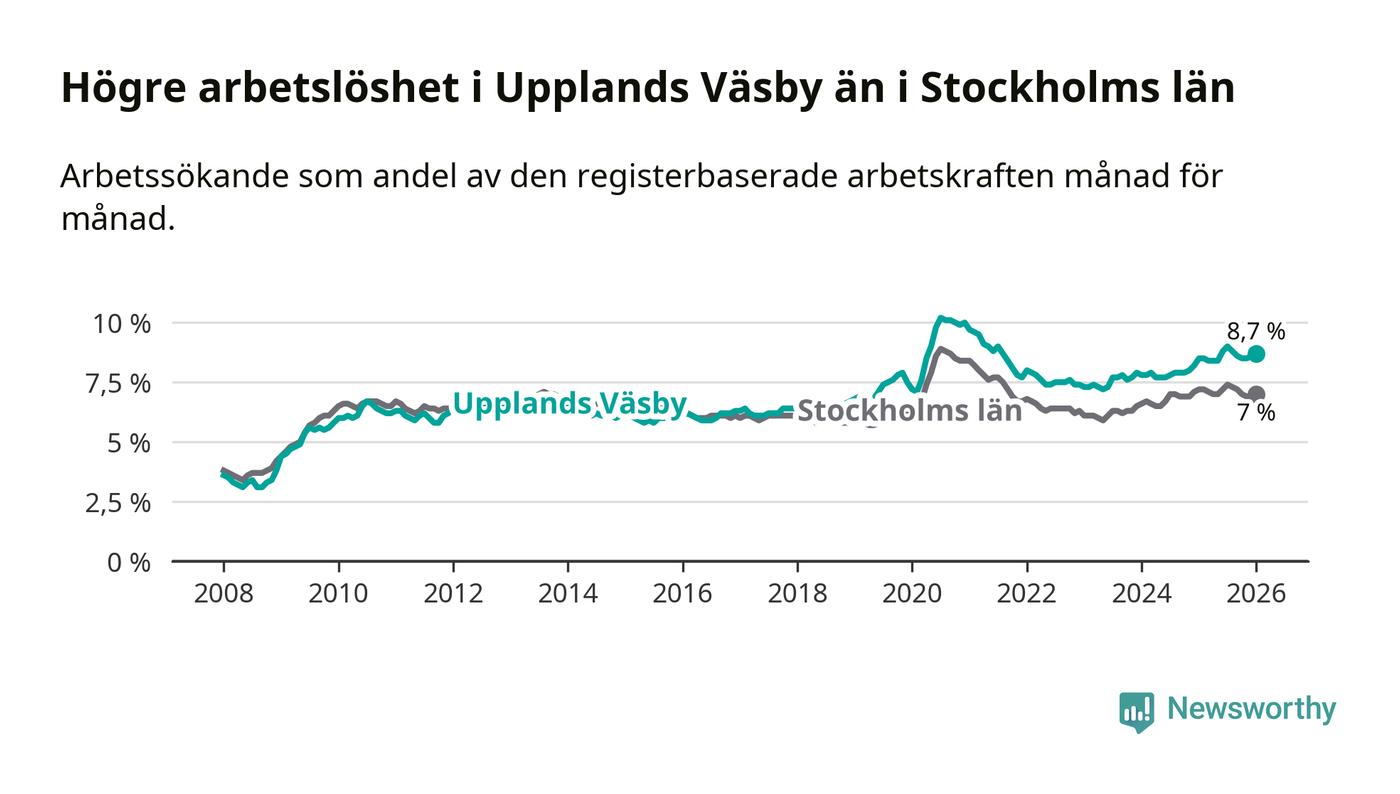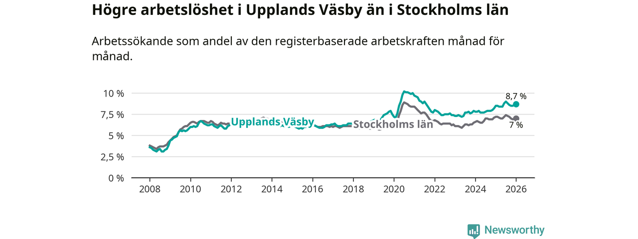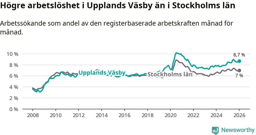 Det är 27:e månaden i följd som arbetslösheten i Upplands Väsby är högre än den var under samma tidpunkt året innan. Sedan oktober 2023 har arbetslösheten gått upp från 7,6 till 8,7 procent.