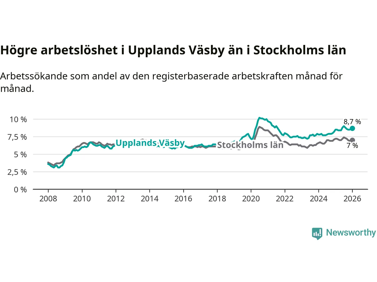 Upplands Väsby hade redan tidigare högre arbetslöshet än snittet i hela Stockholms län och nu växer klyftan (8,7 procent i kommunen, jämfört med 7,0 procent i hela länet). Ekerö har den lägsta arbetslösheten i länet (3,7 procent), medan Södertälje har den högsta (10,9 procent). För att Upplands Väsby skulle komma ner i samma arbetslöshetsnivå som Ekerö skulle 1 311 personer behöva sysselsättas.