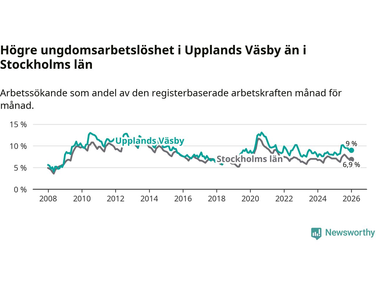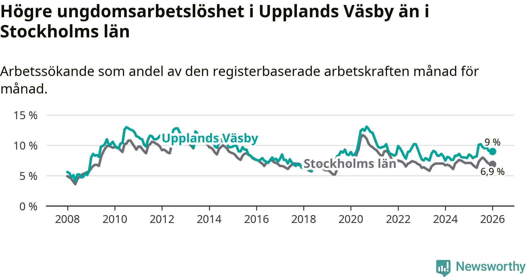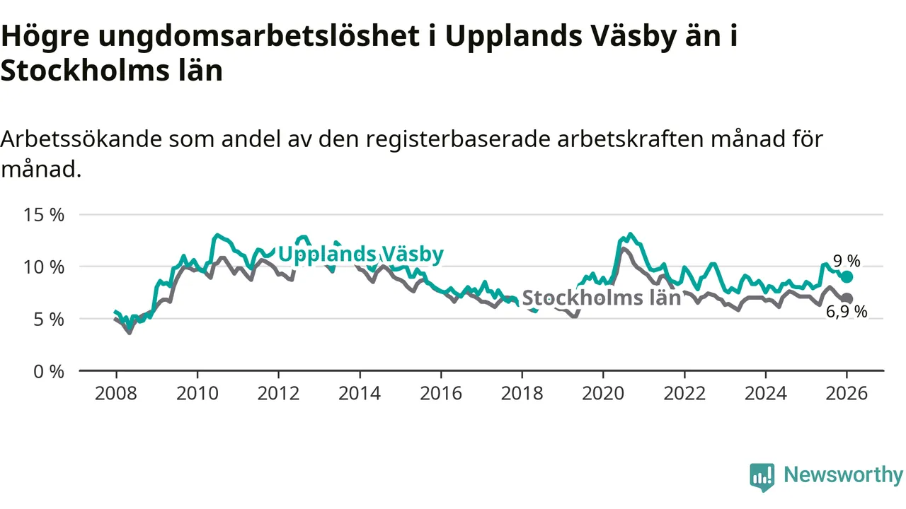 Precis som den totala arbetslösheten ligger ungdomsarbetslösheten i Upplands Väsby högre än i Stockholms län som helhet. Skillnaden mellan kommunen och länet är 2,1 procentenheter.