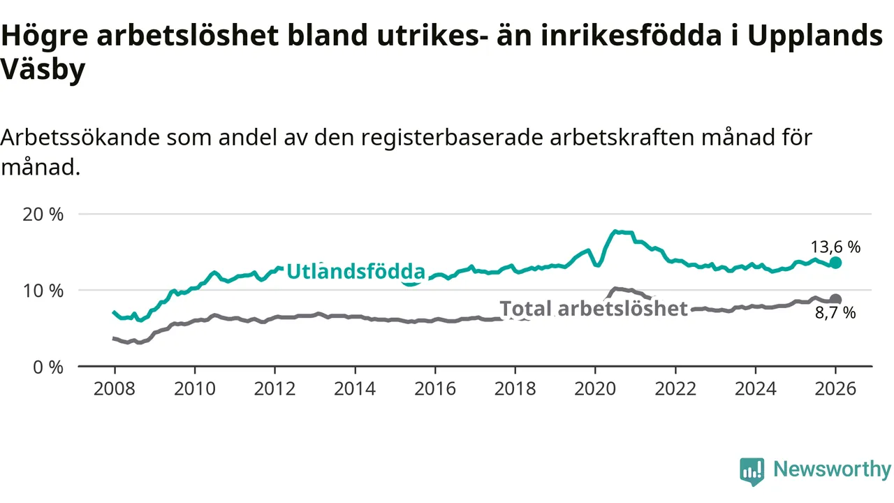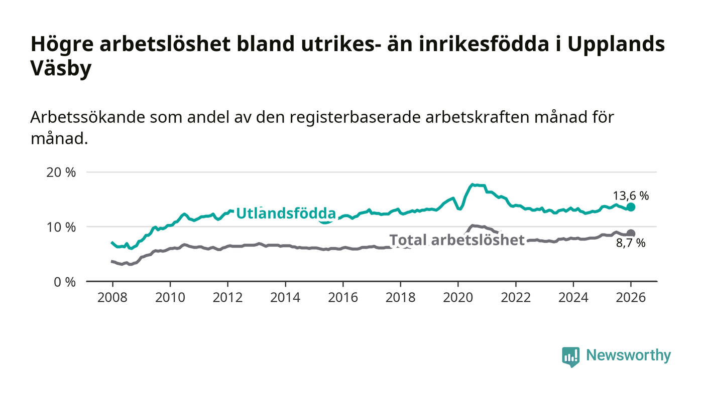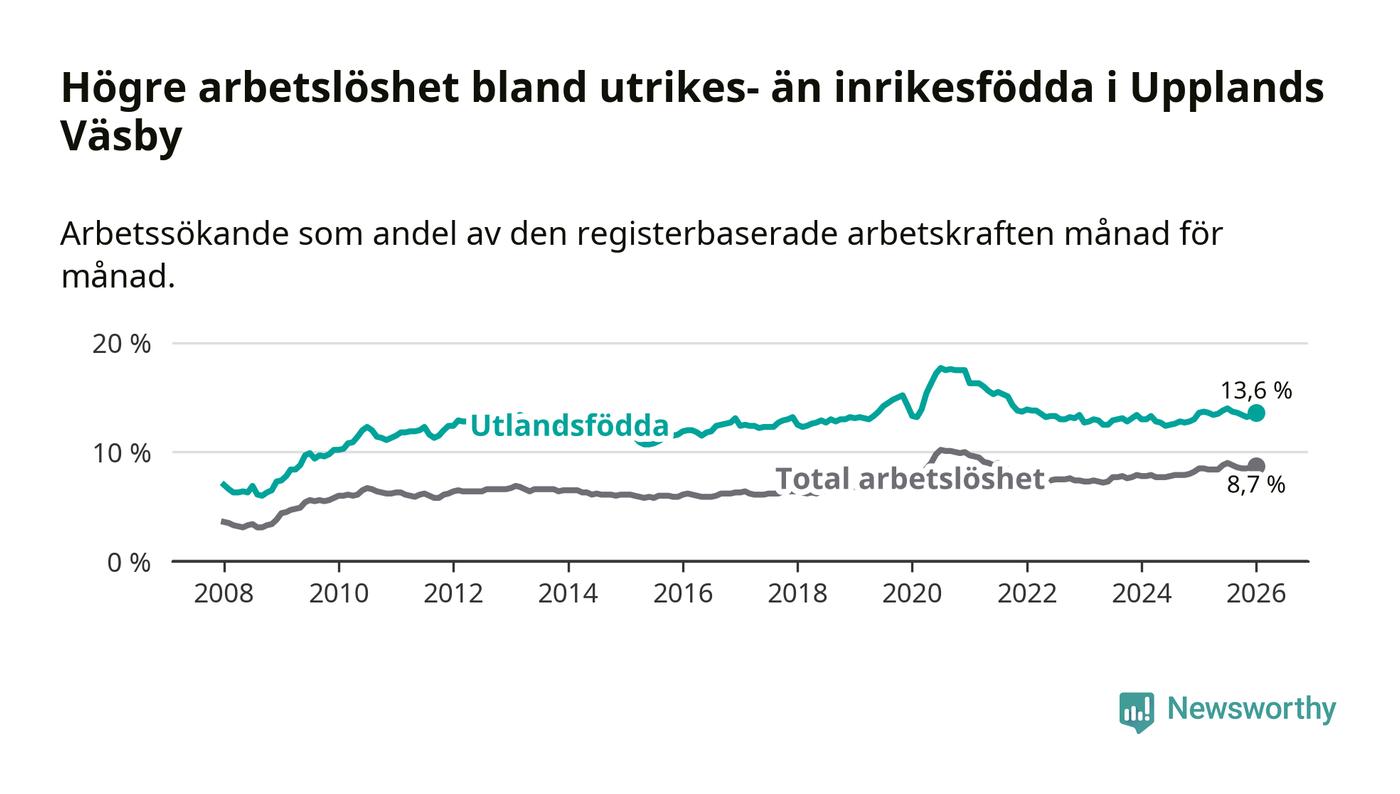 Arbetslösheten bland utlandsfödda var 13,6 procent i Upplands Väsby under januari månad, motsvarande 1 557 av 11 449 personer. Det är i stort sett lika stor andel som i fjol.