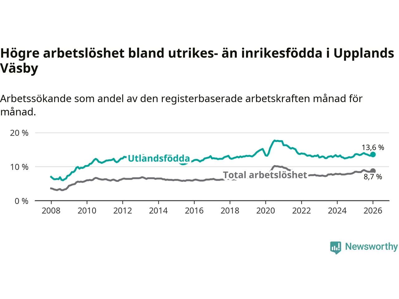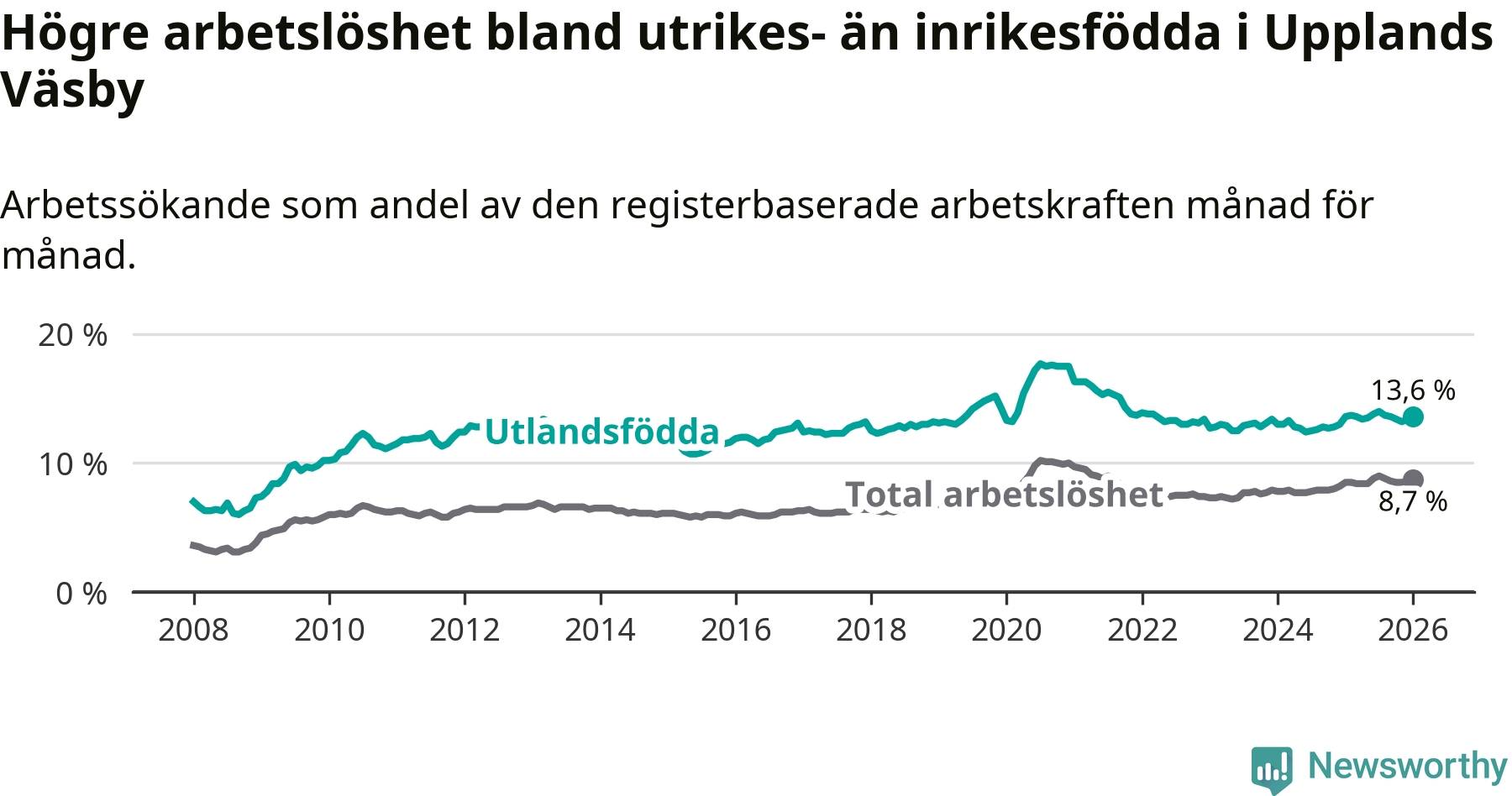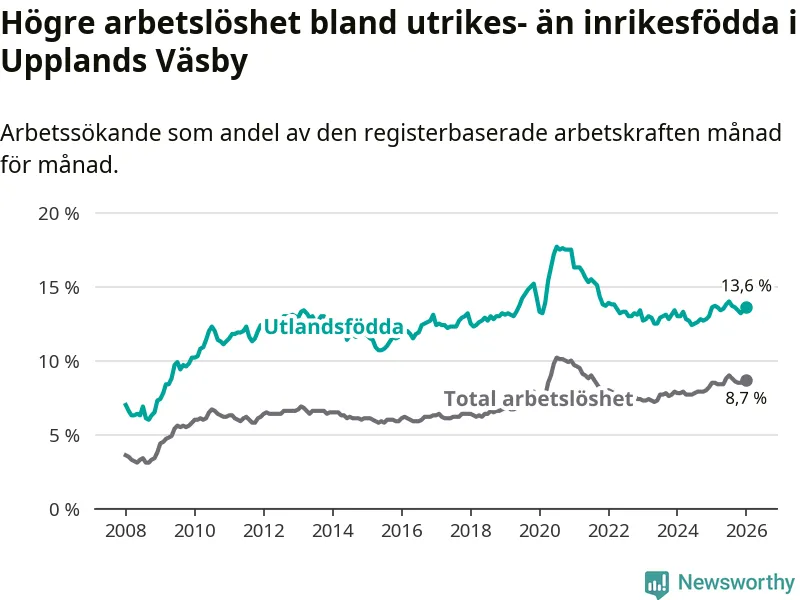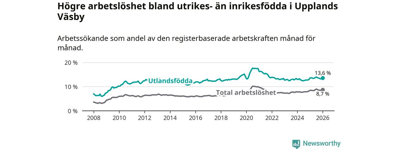 Arbetslösheten bland utlandsfödda var 13,6 procent i Upplands Väsby under januari månad, motsvarande 1 557 av 11 449 personer. Det är i stort sett lika stor andel som i fjol.