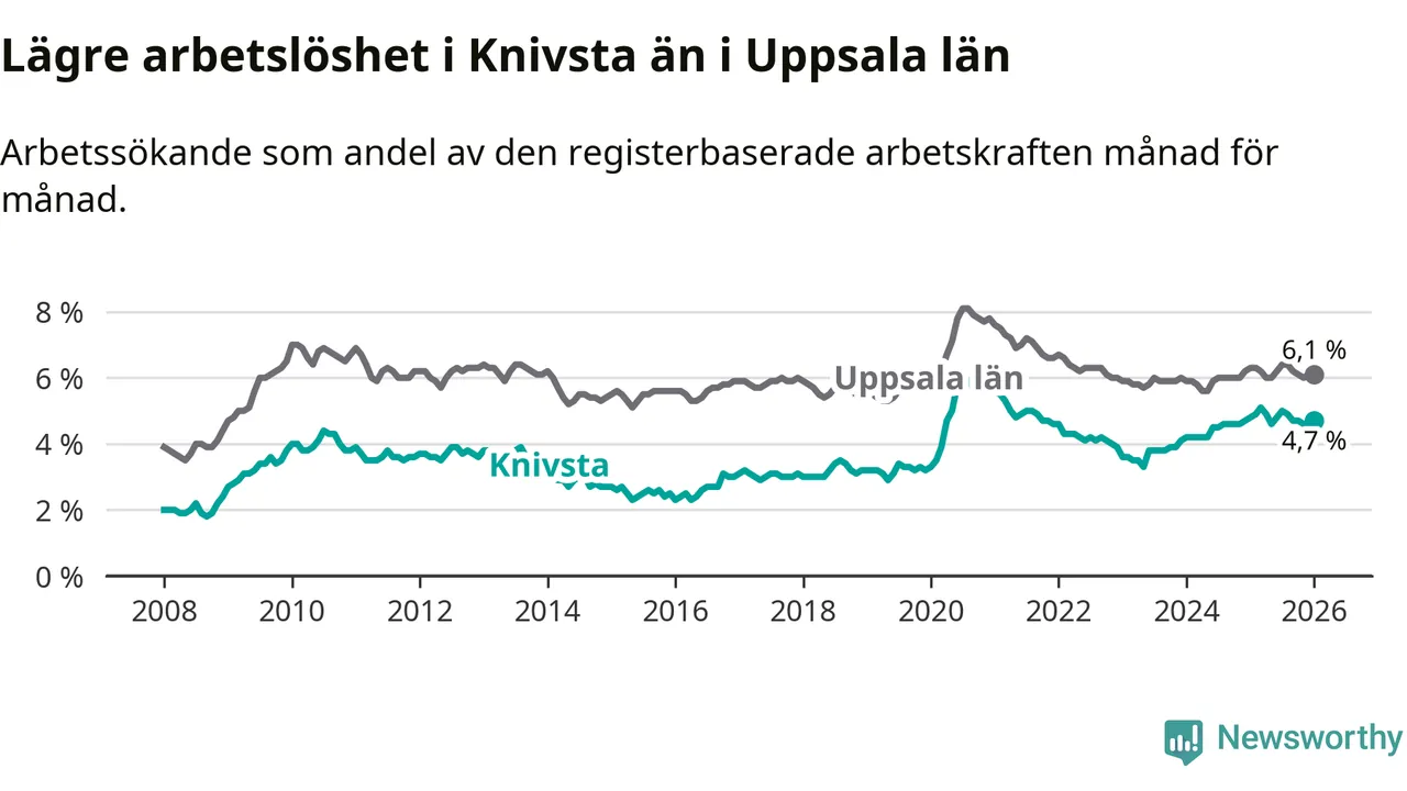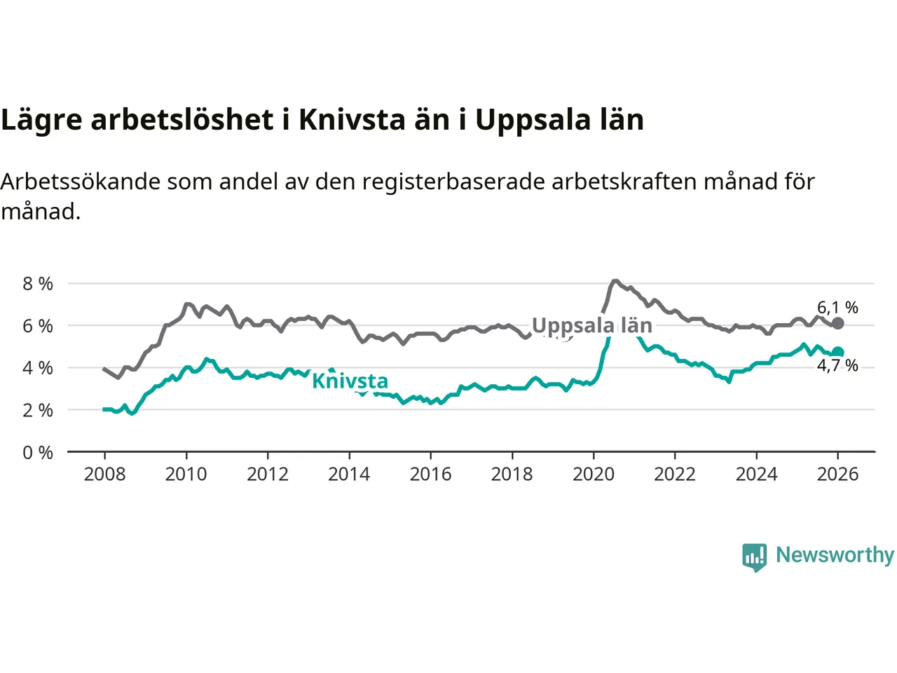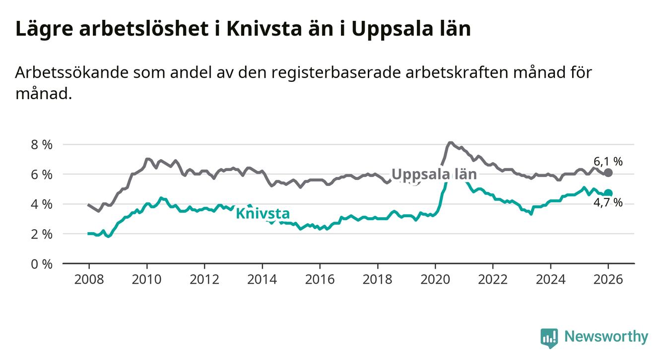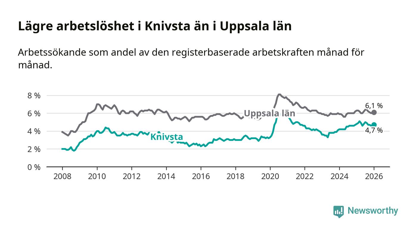 Under januari månad rapporterade Knivsta kommun en total arbetslöshet på 4,7 procent. Det är en minskning jämfört med samma tidpunkt i fjol (−0,1 procentenheter). Även i Uppsala län sjunker arbetslösheten .