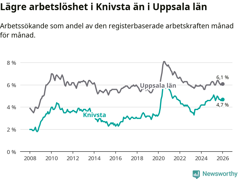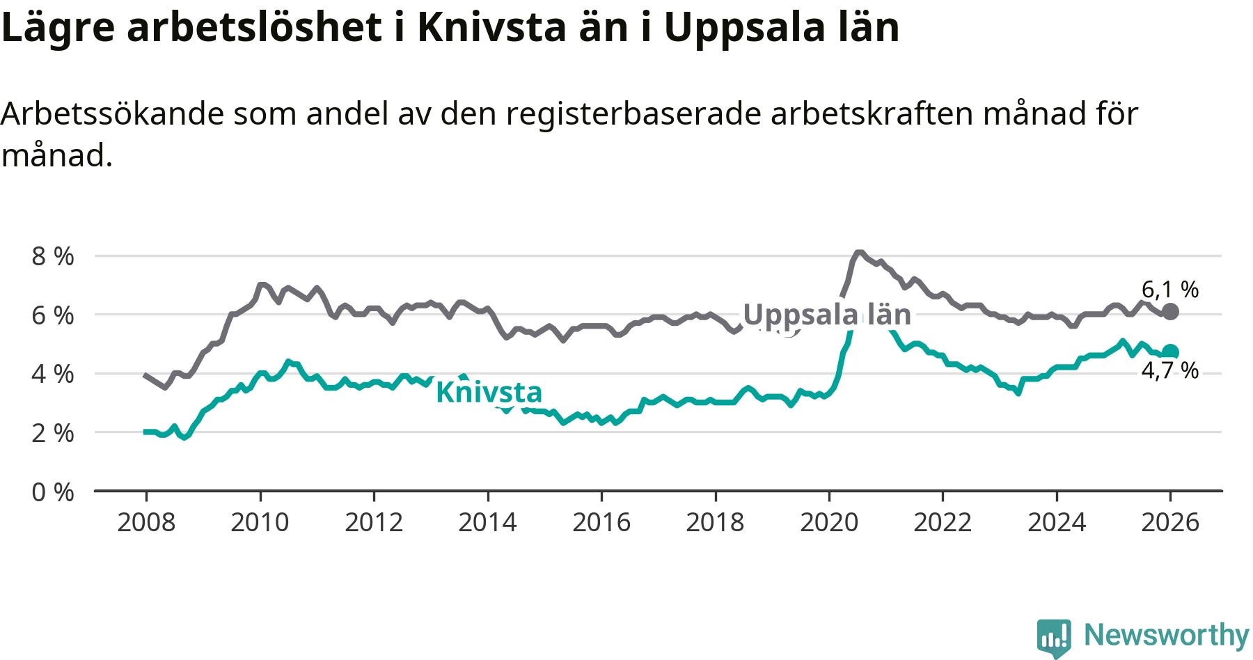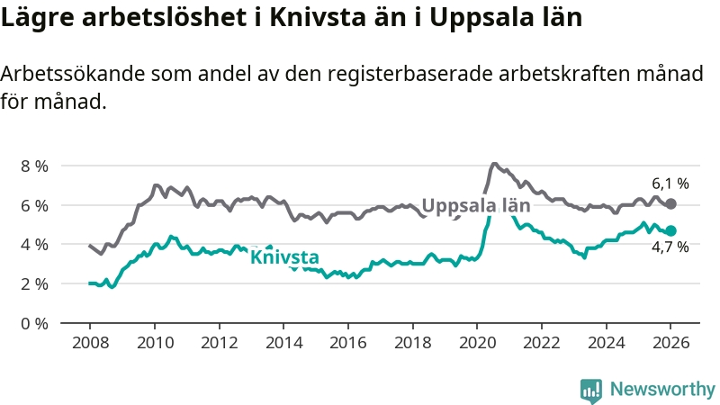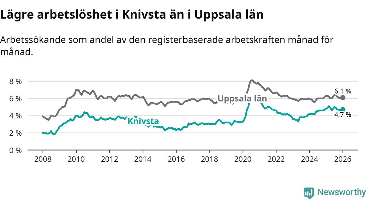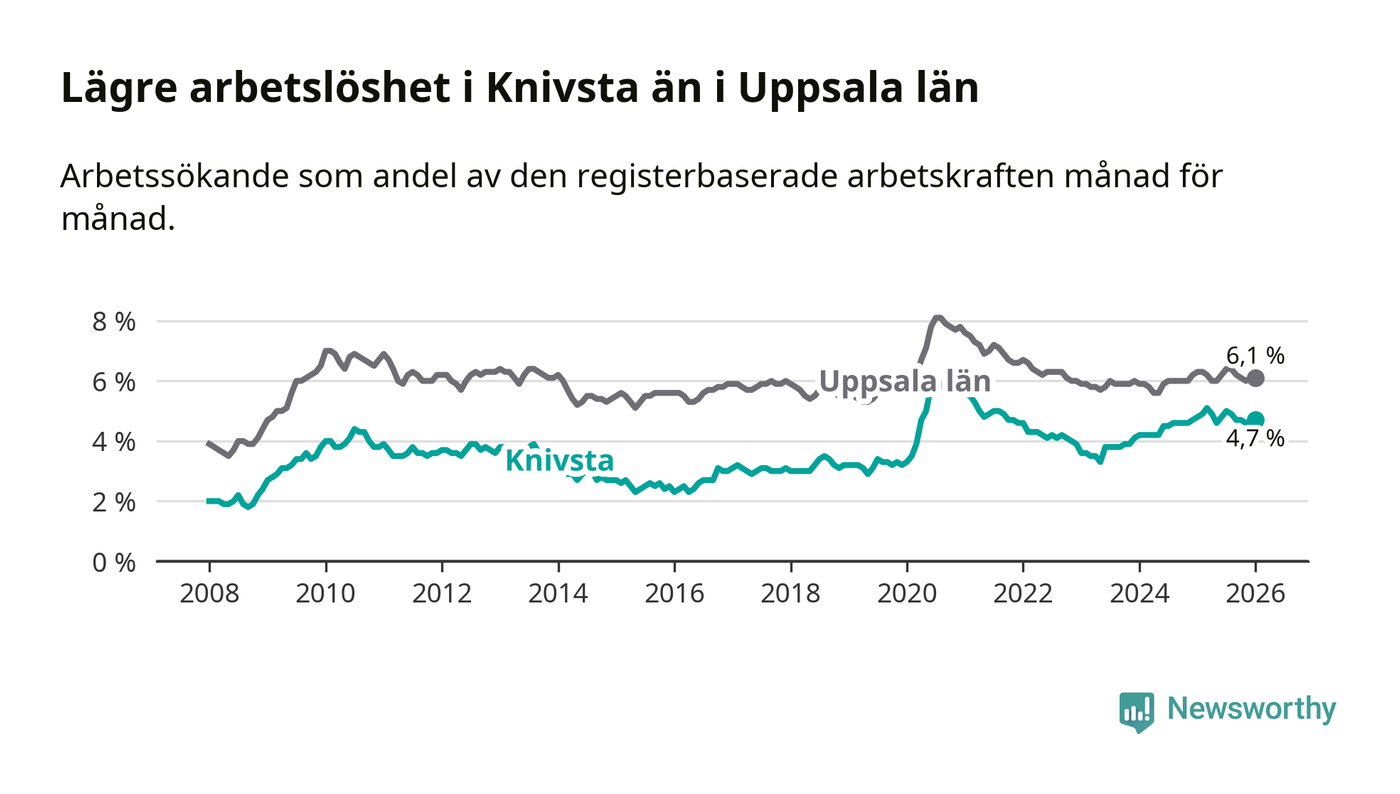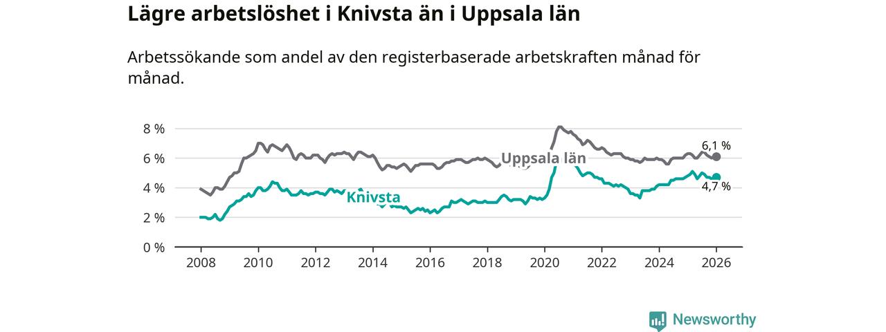 Under januari månad rapporterade Knivsta kommun en total arbetslöshet på 4,7 procent. Det är en minskning jämfört med samma tidpunkt i fjol (−0,1 procentenheter). Även i Uppsala län sjunker arbetslösheten .