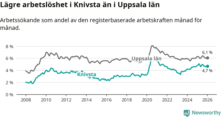 Knivsta hade redan tidigare lägre arbetslöshet än snittet i hela Uppsala län och nu växer klyftan (4,7 procent i kommunen, jämfört med 6,1 procent i hela länet). Östhammar har den lägsta arbetslösheten i länet (4,3 procent), medan Älvkarleby har den högsta (7,7 procent). För att Knivsta skulle komma ner i samma arbetslöshetsnivå som Östhammar skulle 46 personer behöva sysselsättas.