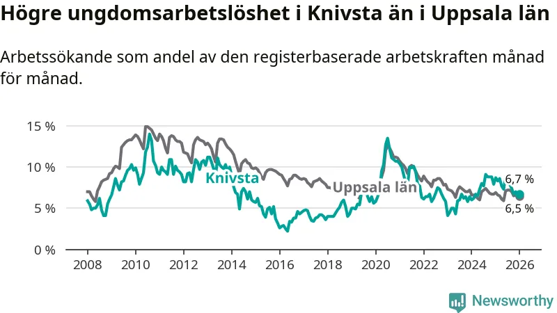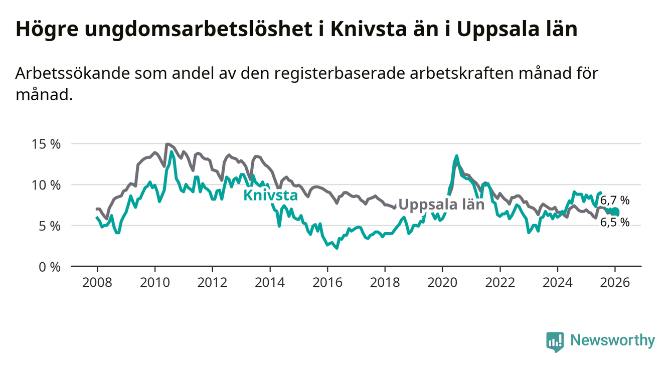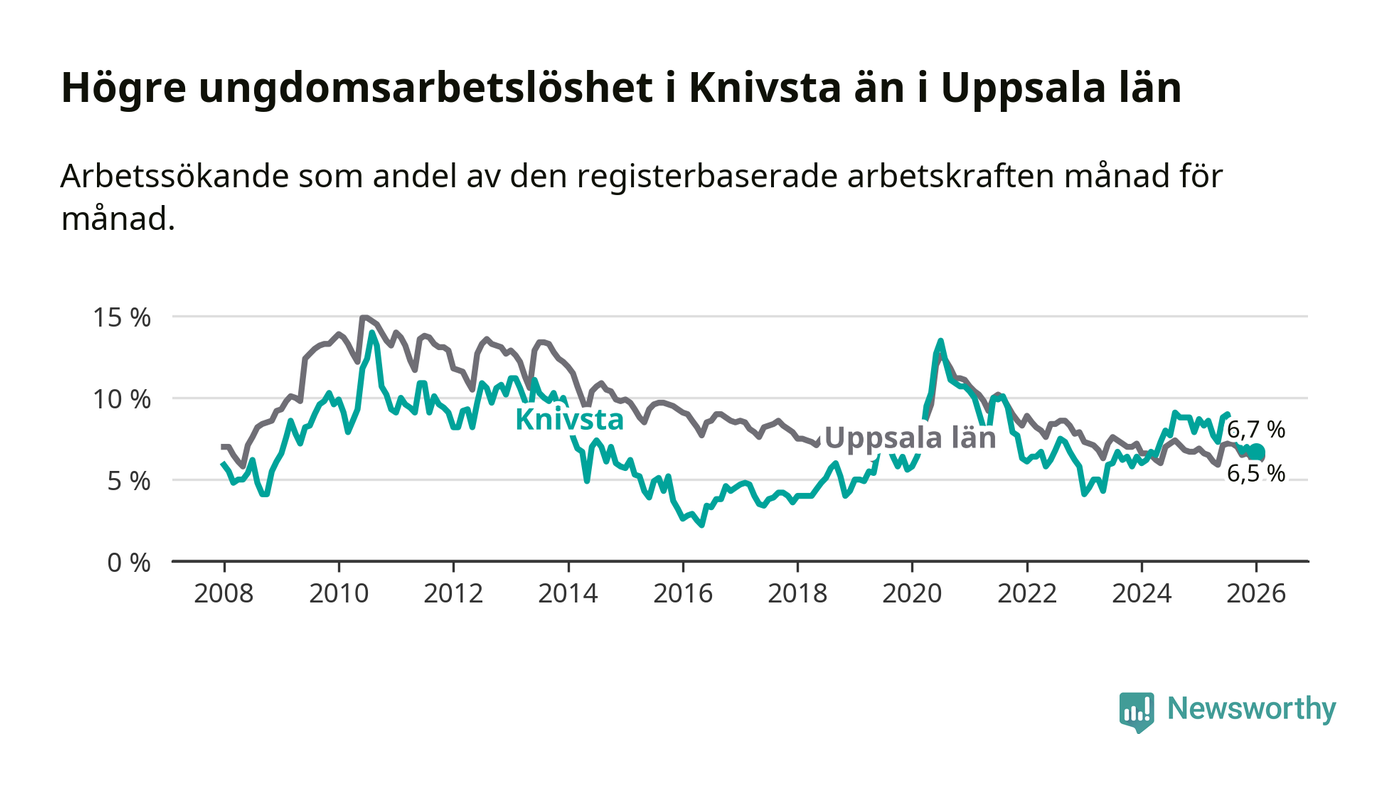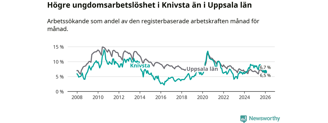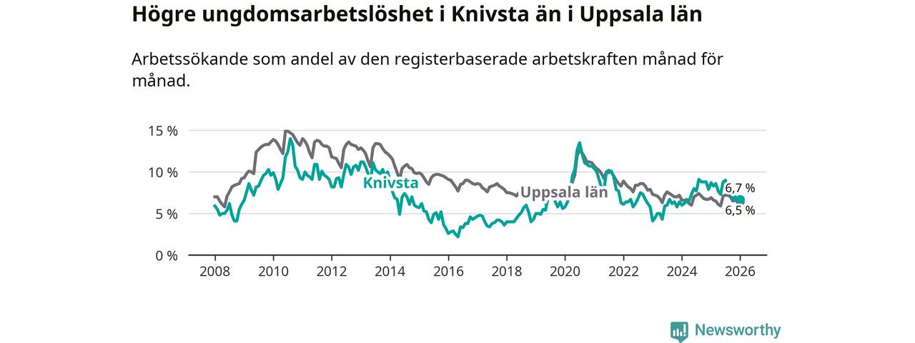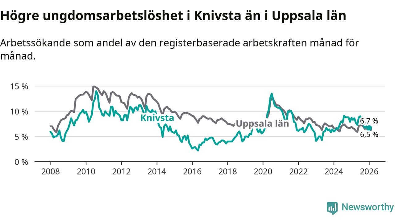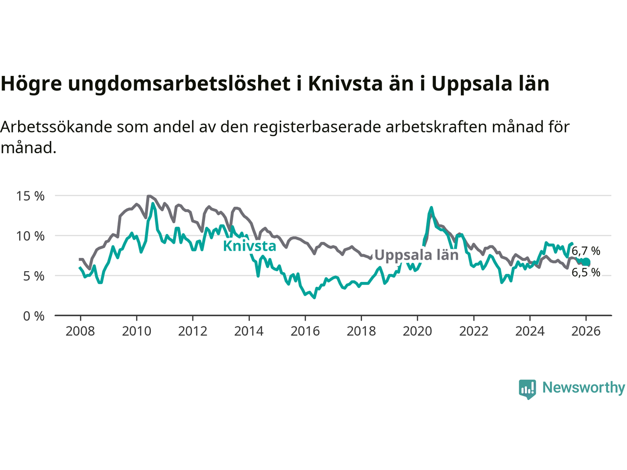 Medan Knivsta har lägre total arbetslöshet än Uppsala, ligger ungdomsarbetslösheten 0,2 procentenheter högre i Knivsta.