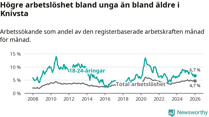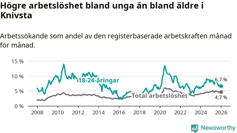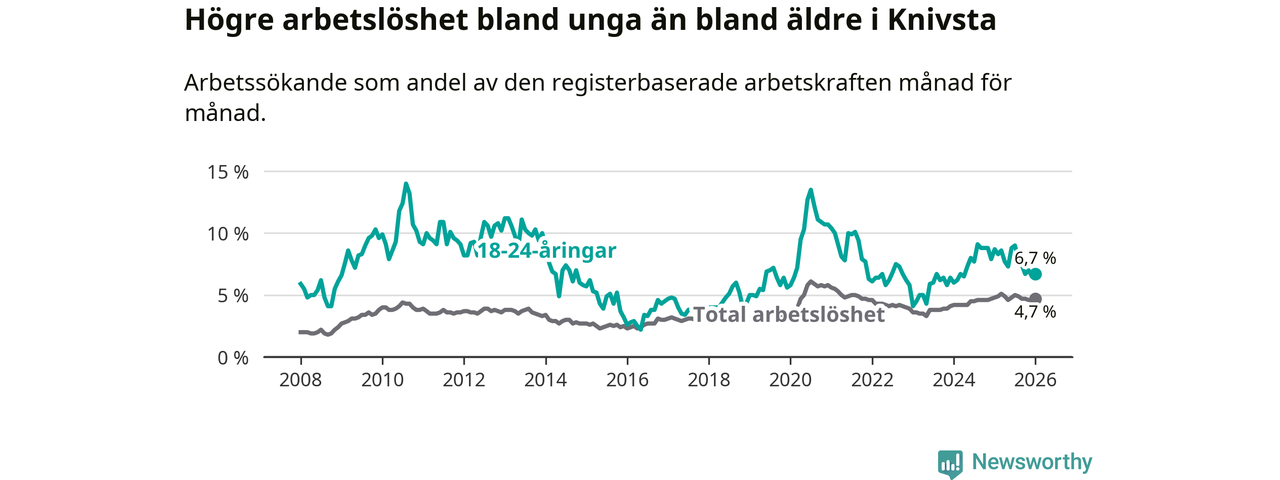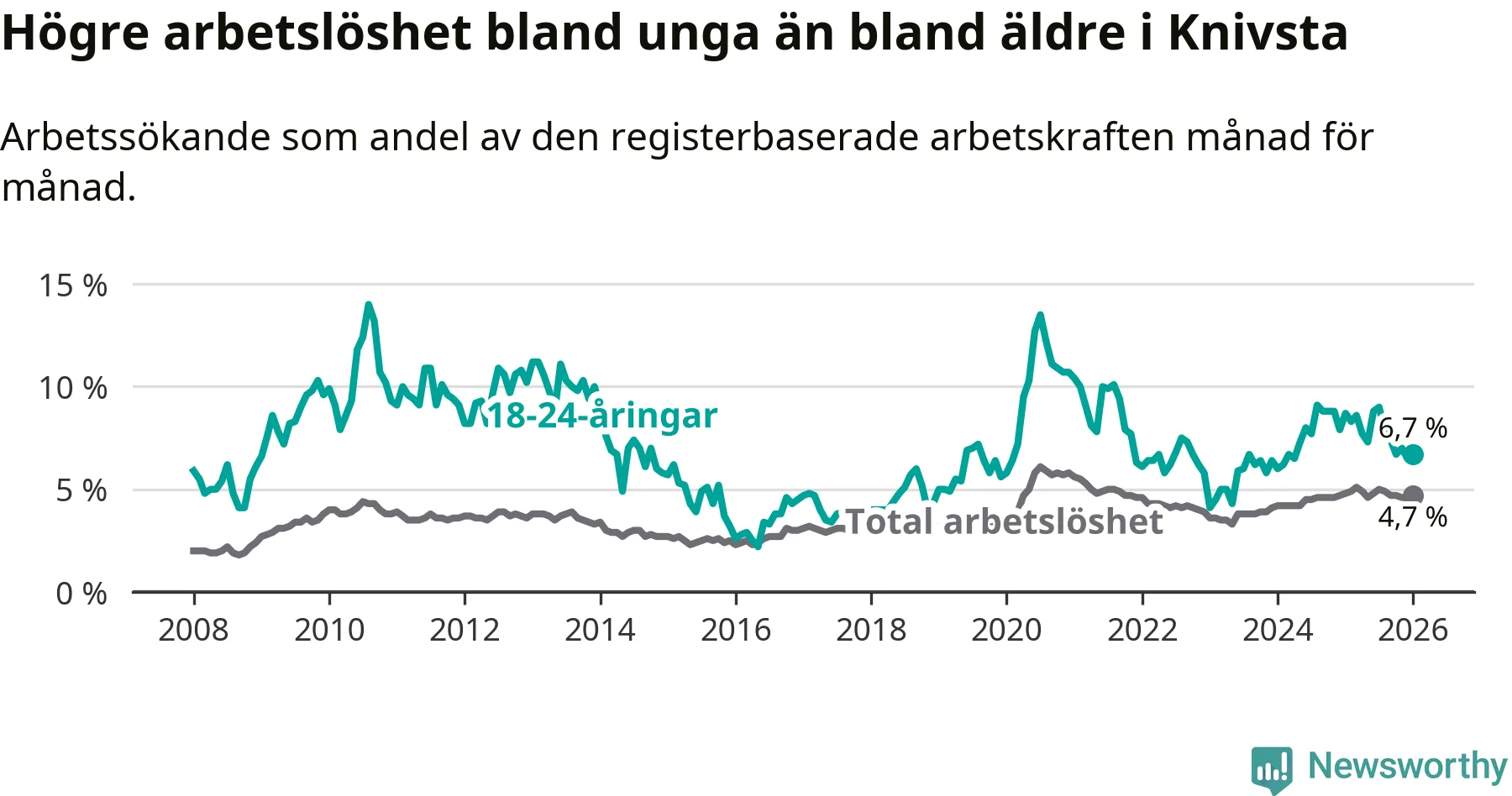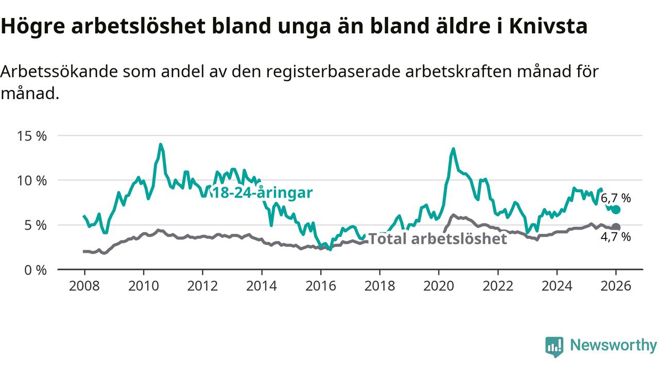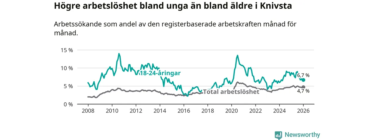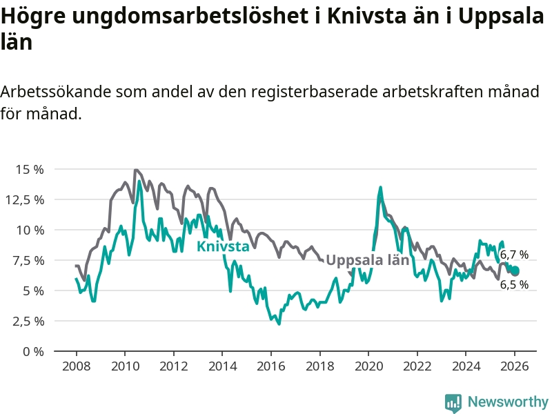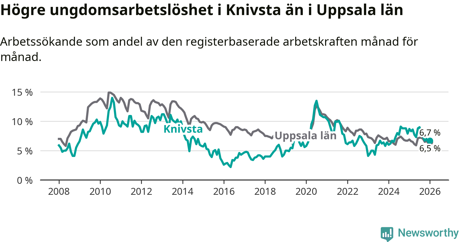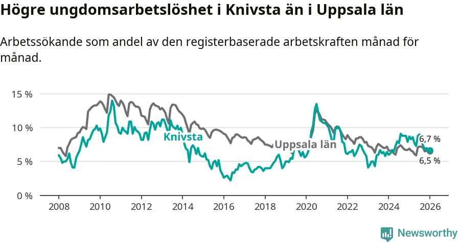 Medan Knivsta har lägre total arbetslöshet än Uppsala, ligger ungdomsarbetslösheten 0,2 procentenheter högre i Knivsta.