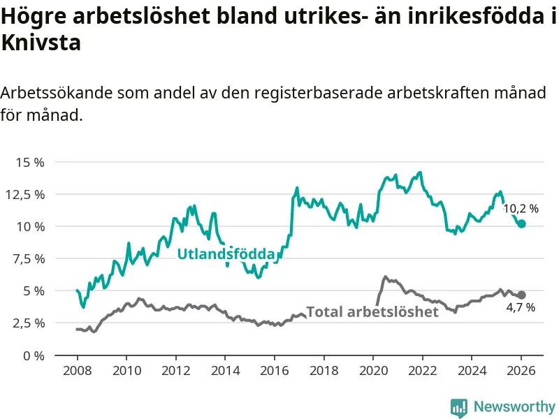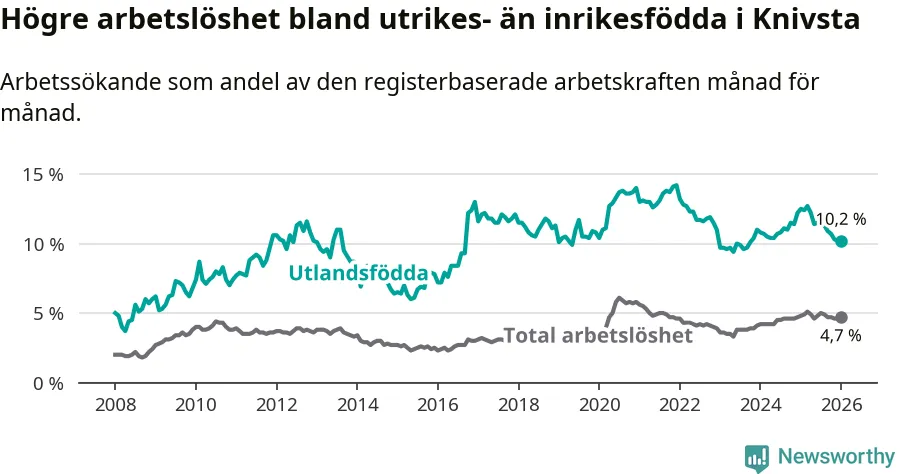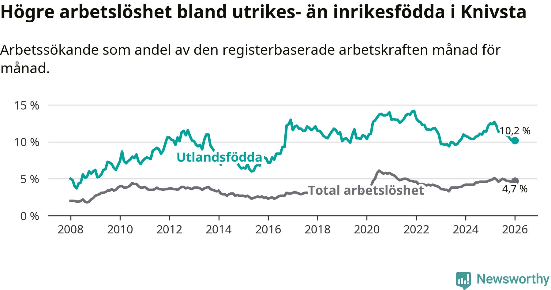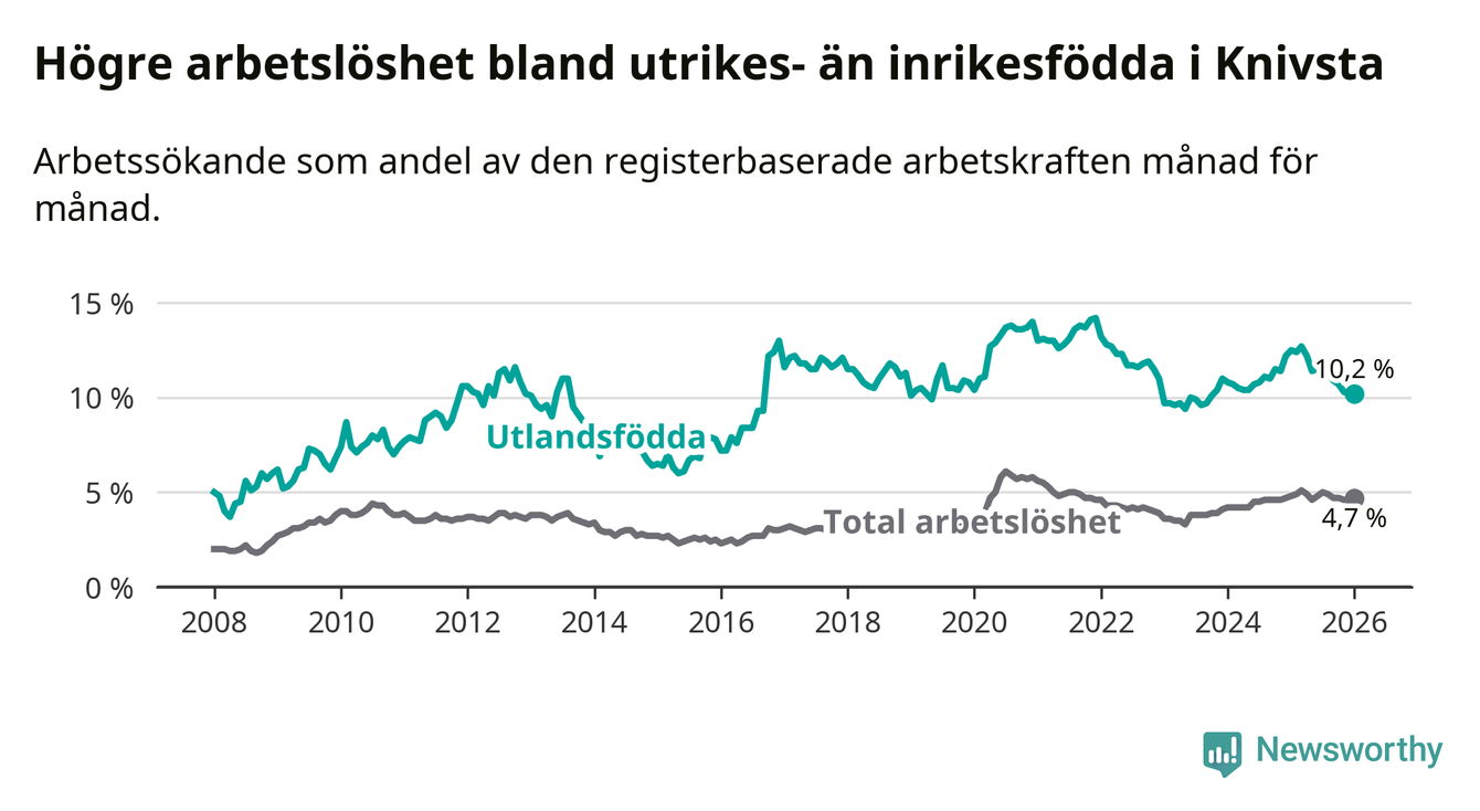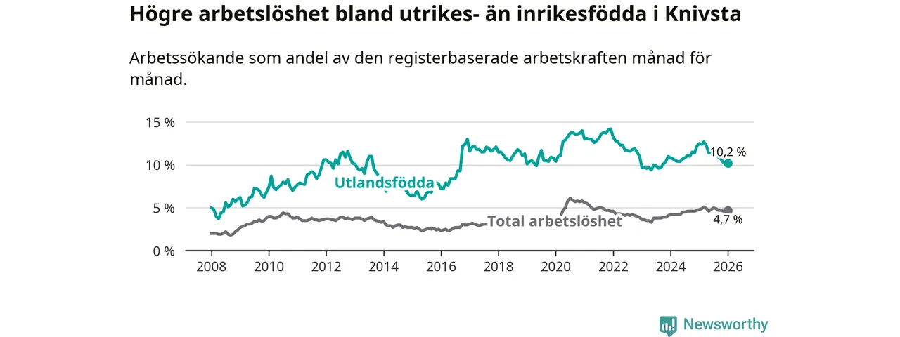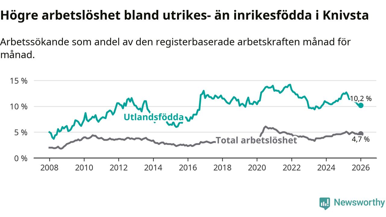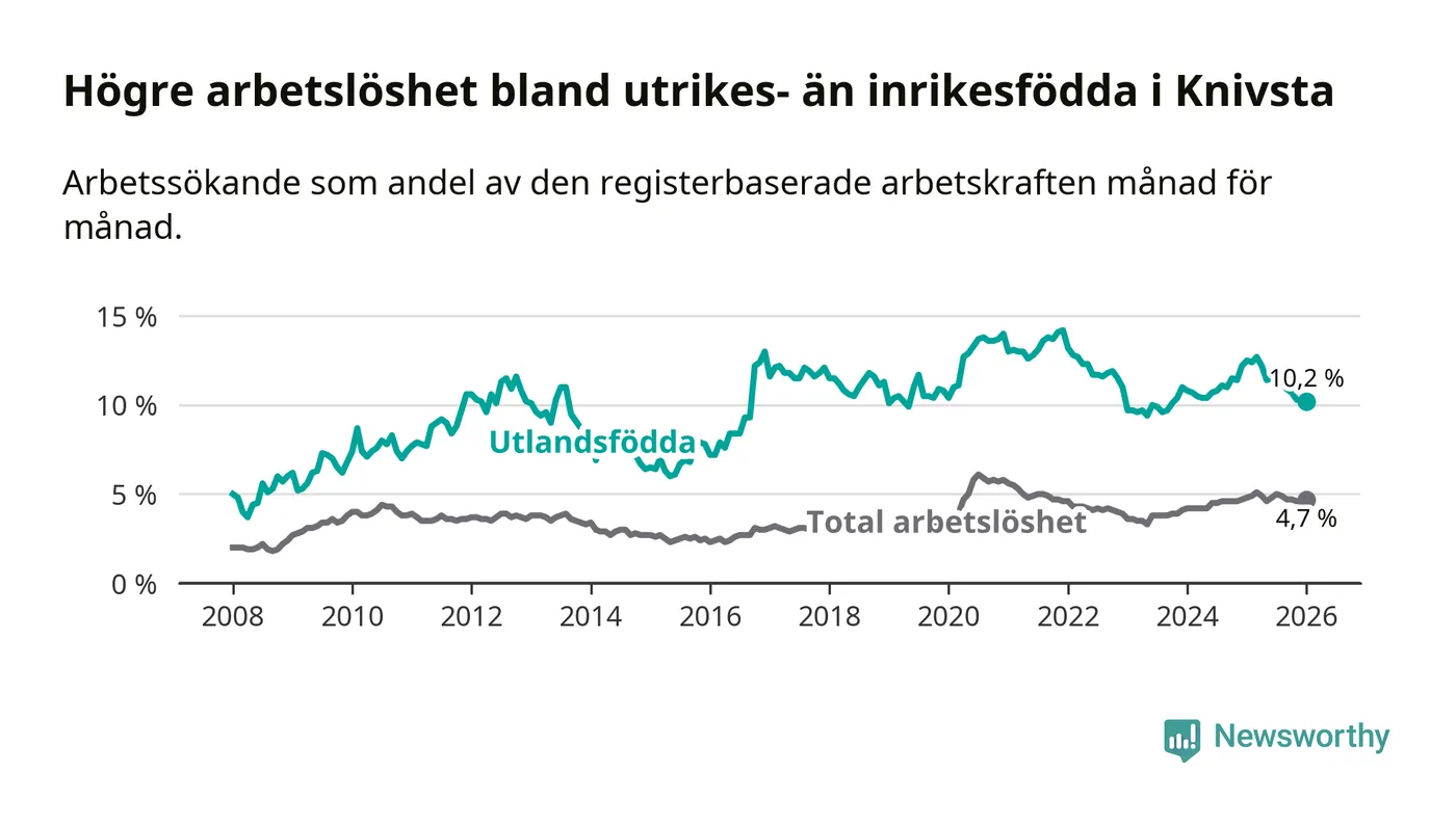 Arbetslösheten bland utlandsfödda var 10,2 procent i Knivsta under januari månad, motsvarande 257 av 2 520 personer. Det är 2,3 procentenheter färre än vid samma tidpunkt i fjol (−30 om man räknar personer).