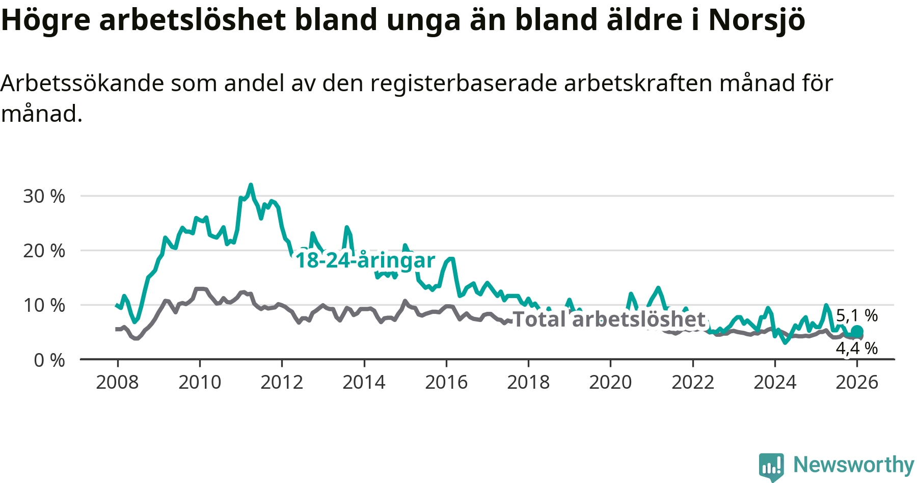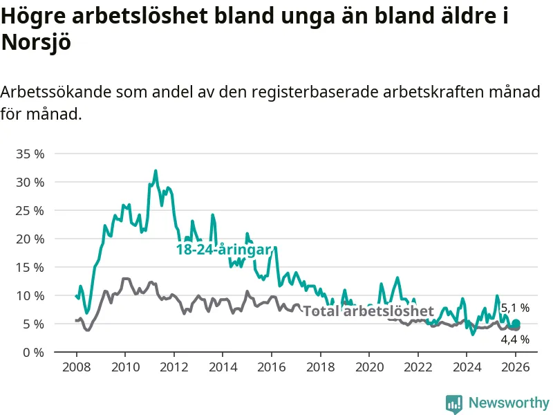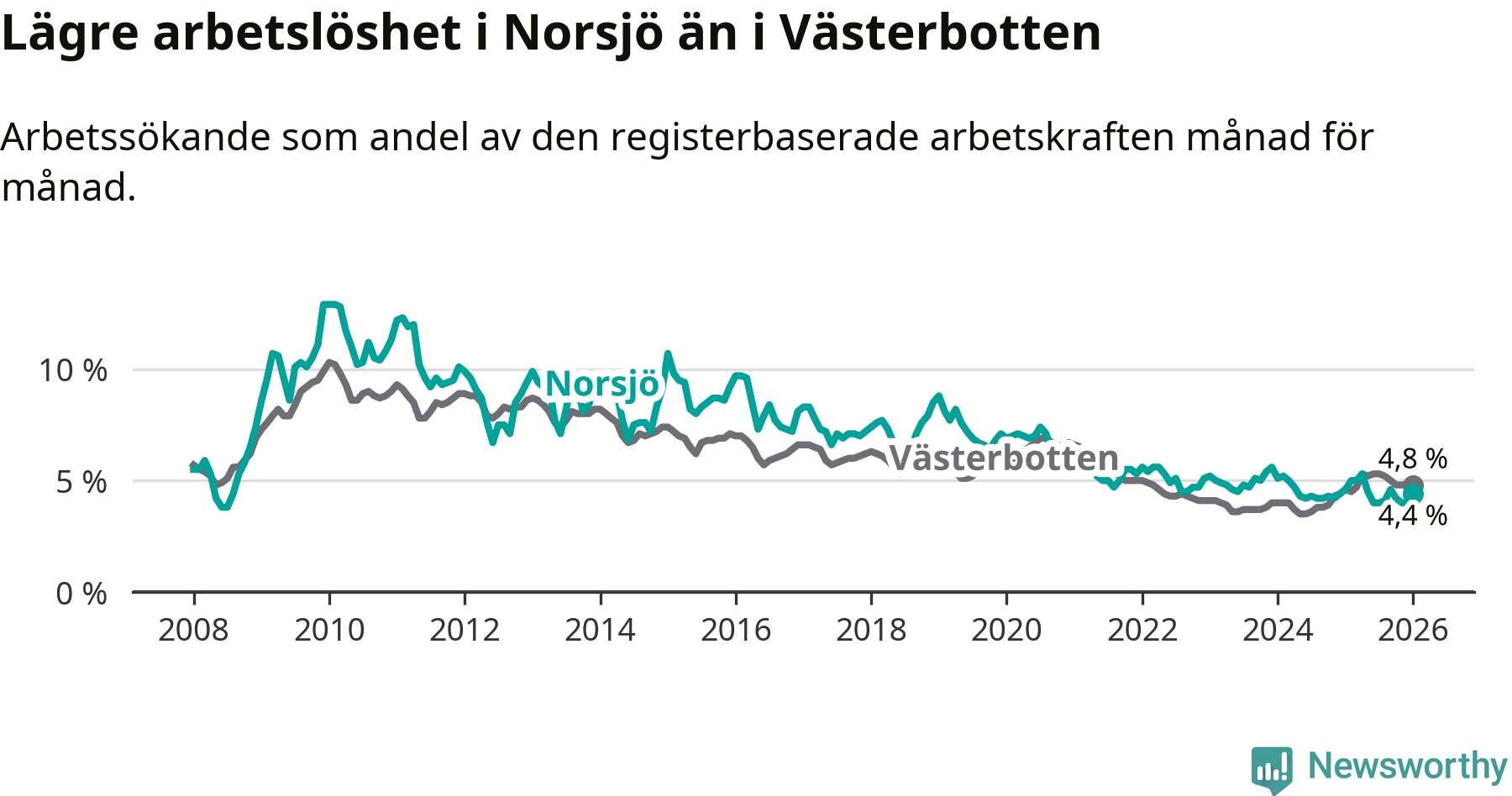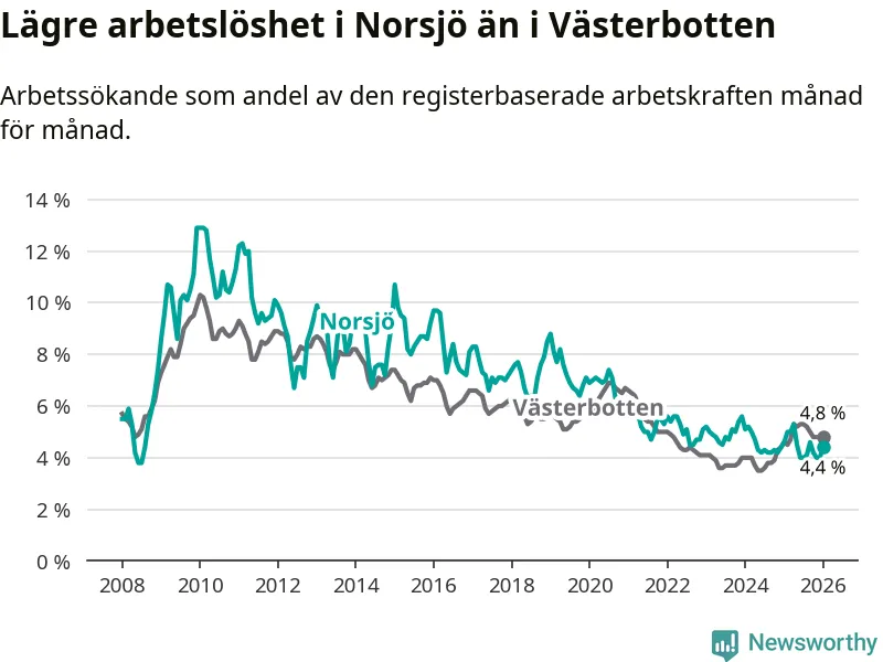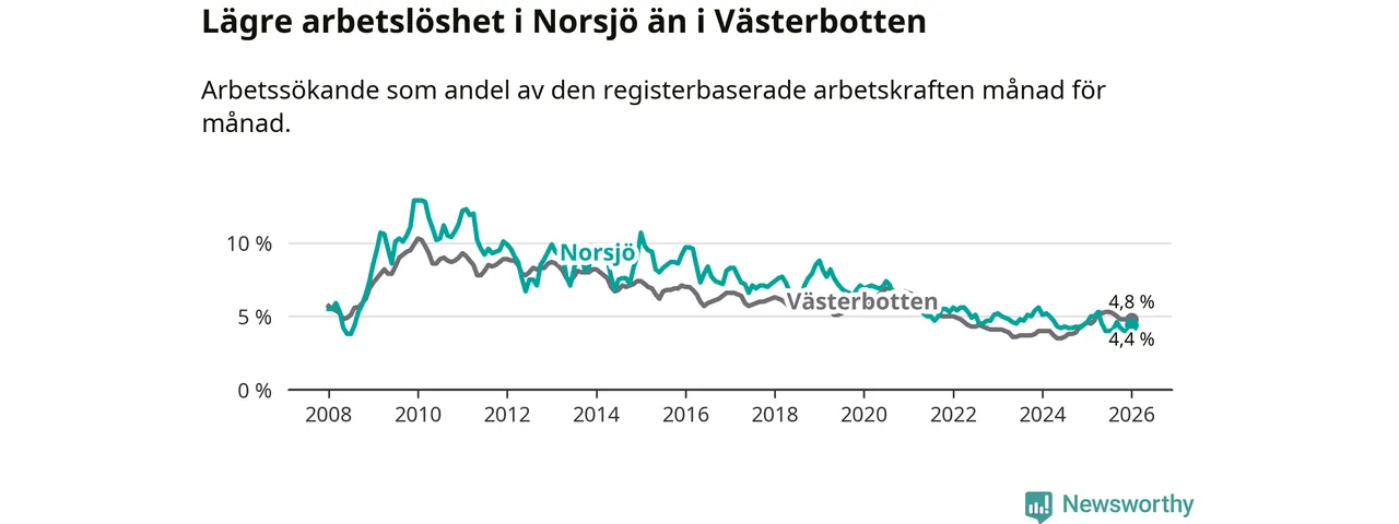 Under januari månad rapporterade Norsjö kommun en total arbetslöshet på 4,4 procent. Det är en minskning jämfört med samma tidpunkt i fjol (−0,2 procentenheter). I Västerbottens län däremot stiger arbetslösheten .