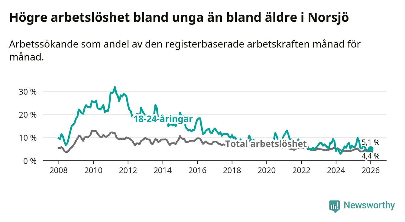 Precis som den totala arbetslösheten sjunker arbetslösheten bland unga (−0,8 procentenheter). I januari var 5,1 procent av 18–24-åringarna inskrivna som arbetssökande (motsvarande åtta personer). Mäter vi antalet inskrivna ser vi en minskning med ett personer på ett års sikt.