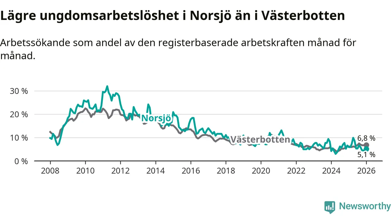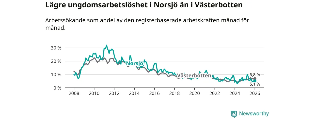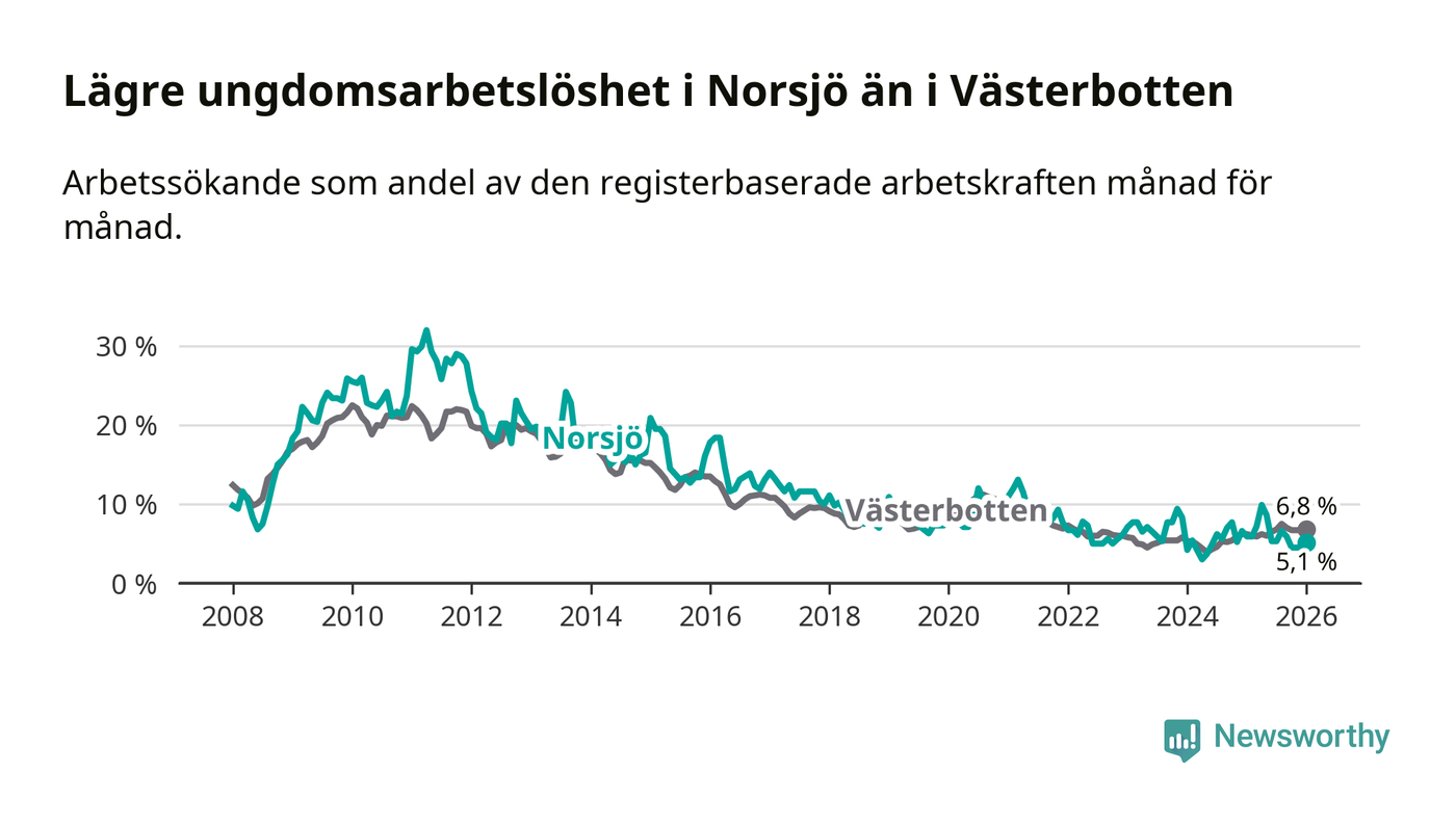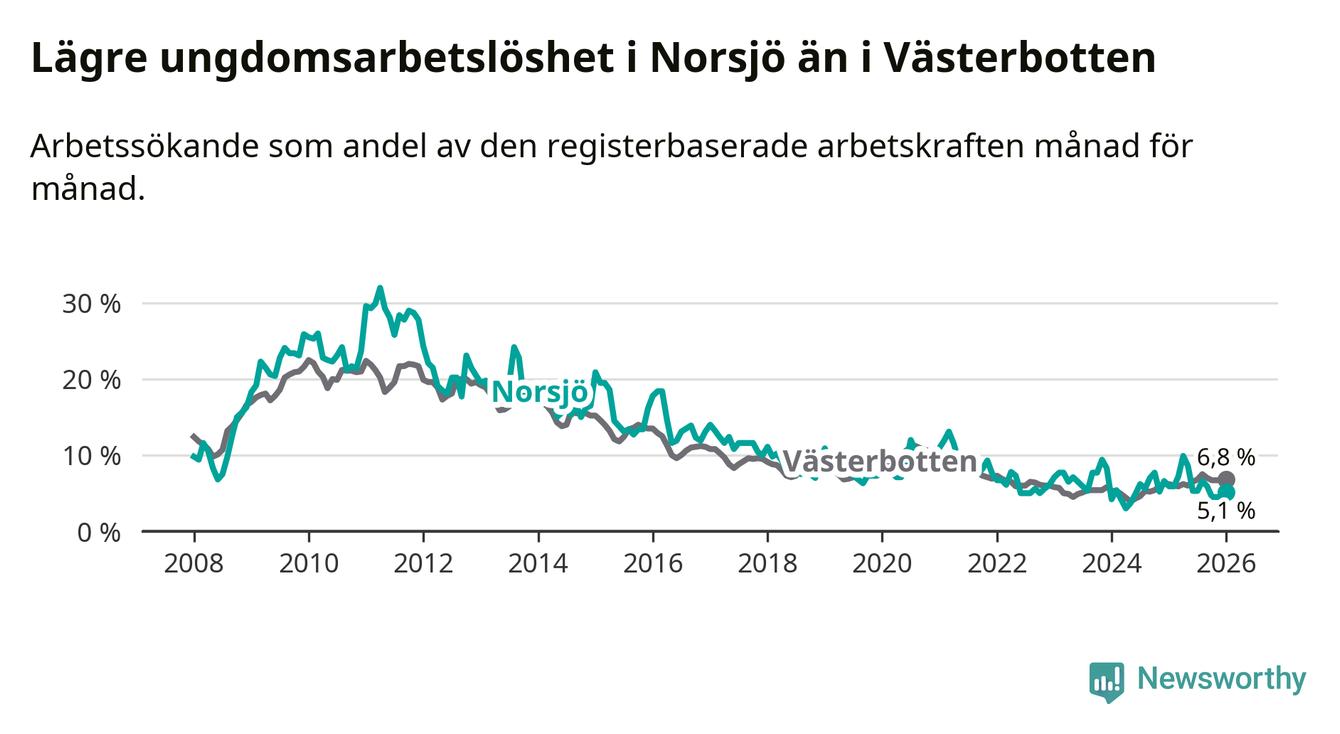 Precis som den totala arbetslösheten ligger ungdomsarbetslösheten i Norsjö lägre än i Västerbotten som helhet. Skillnaden mellan kommunen och länet är 1,7 procentenheter.