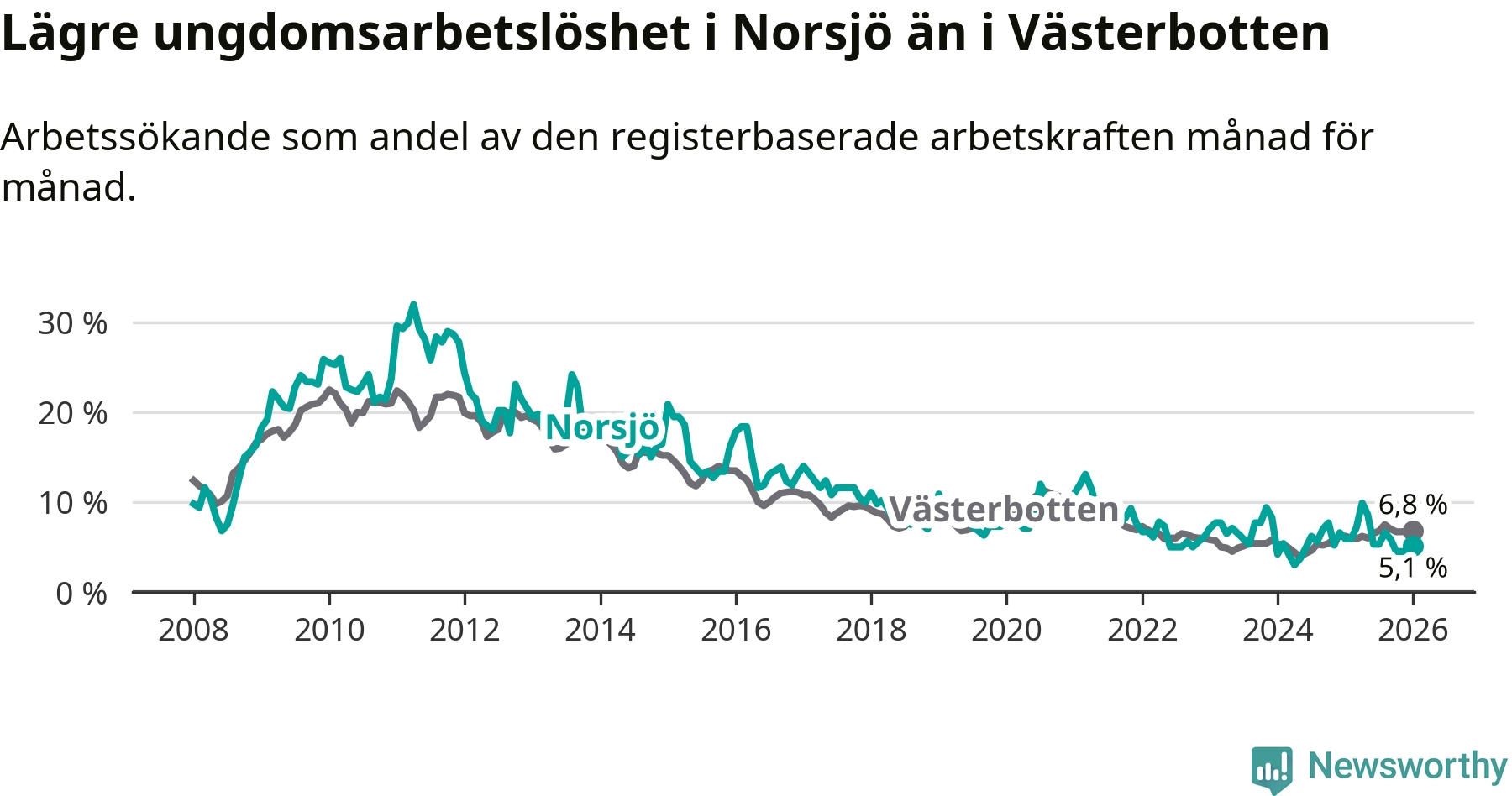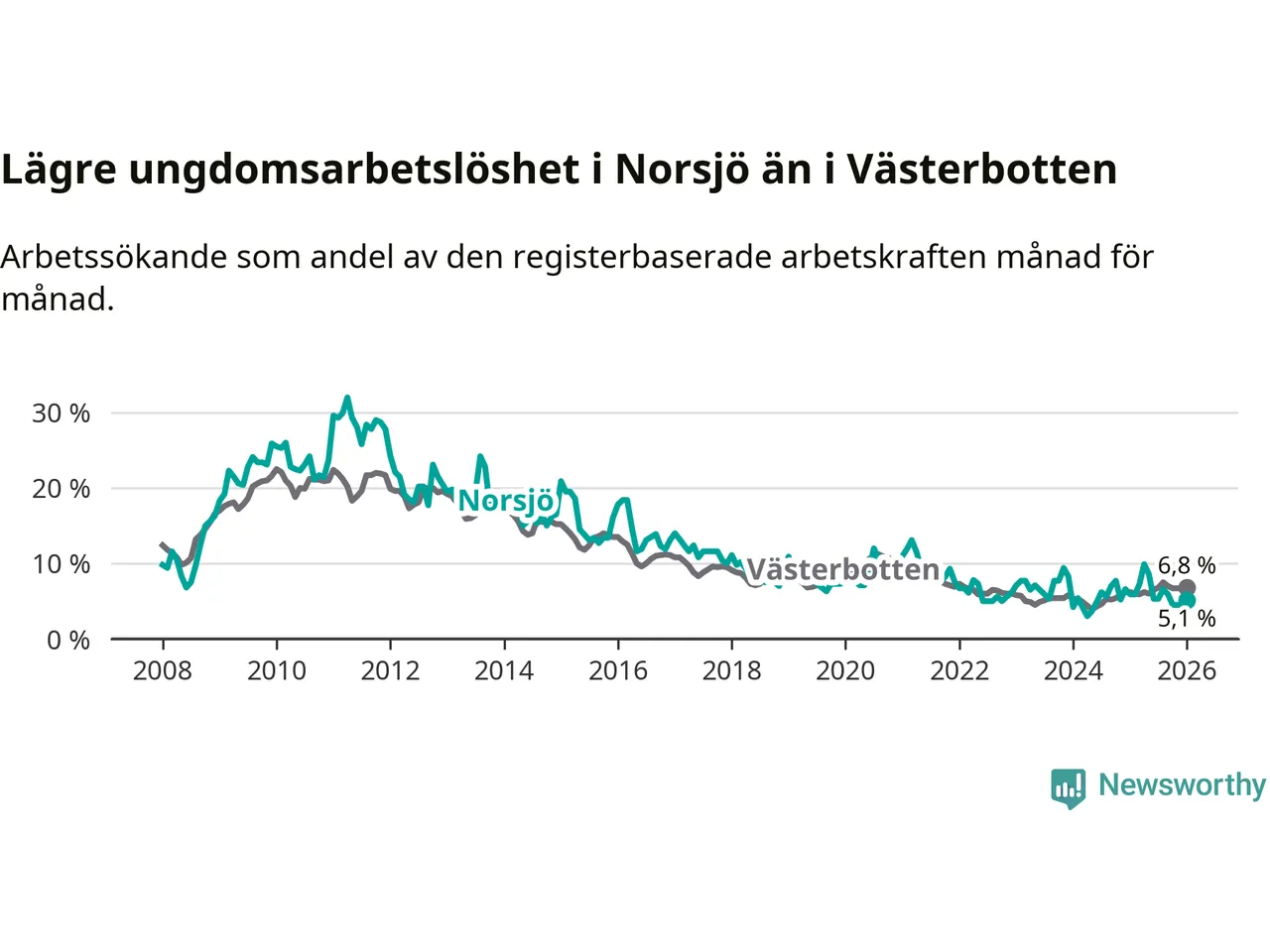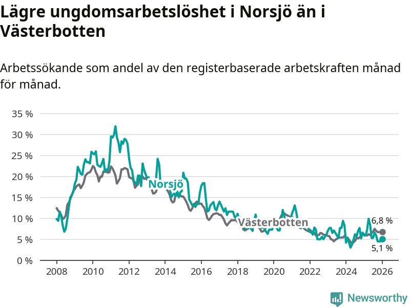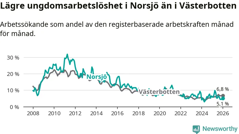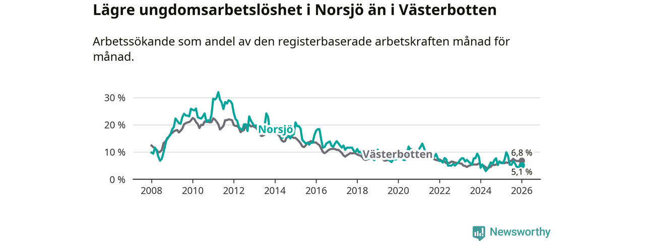 Precis som den totala arbetslösheten ligger ungdomsarbetslösheten i Norsjö lägre än i Västerbotten som helhet. Skillnaden mellan kommunen och länet är 1,7 procentenheter.