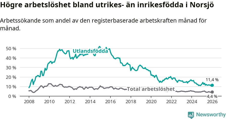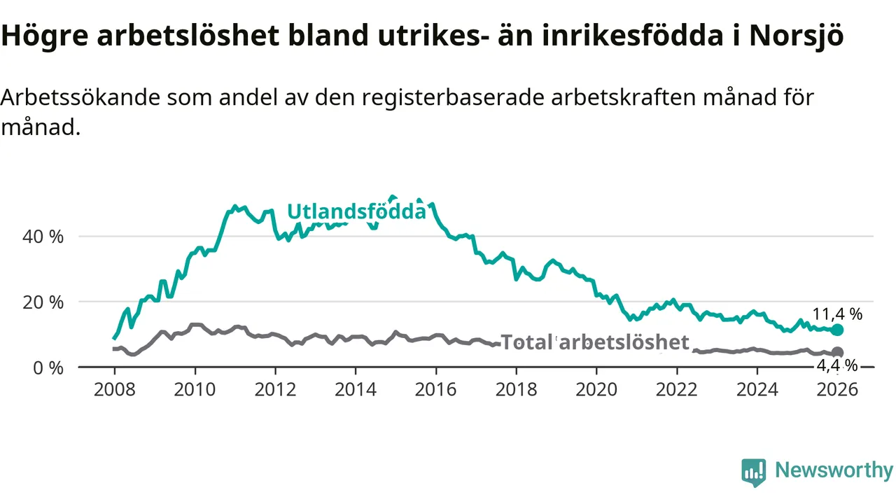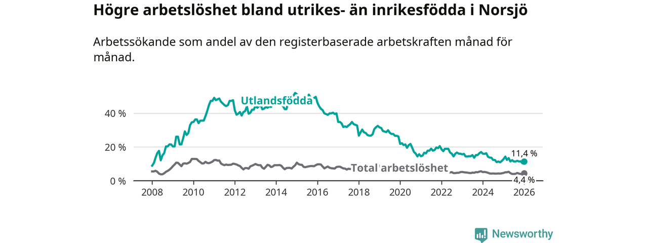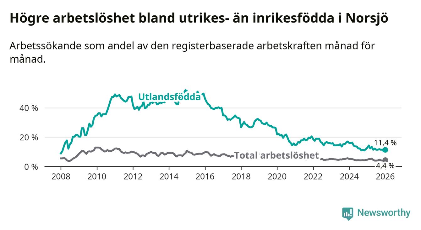 Arbetslösheten bland utlandsfödda var 11,4 procent i Norsjö under januari månad, motsvarande 29 av 254 personer. Det är 1,4 procentenheter färre än vid samma tidpunkt i fjol (−3 om man räknar personer).