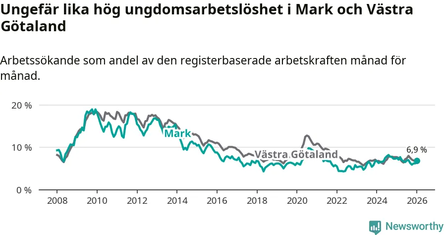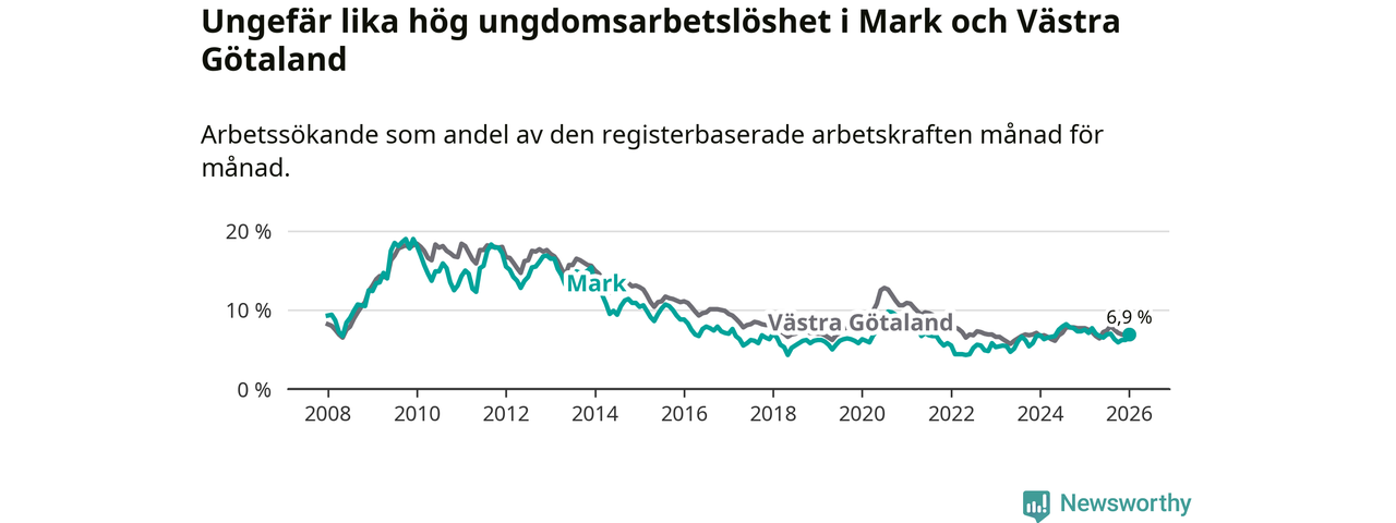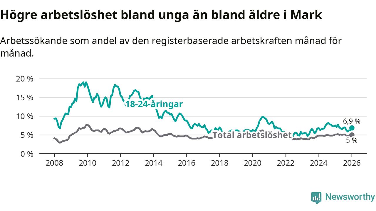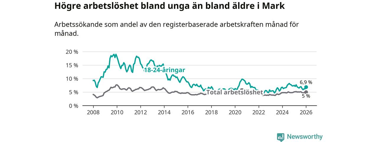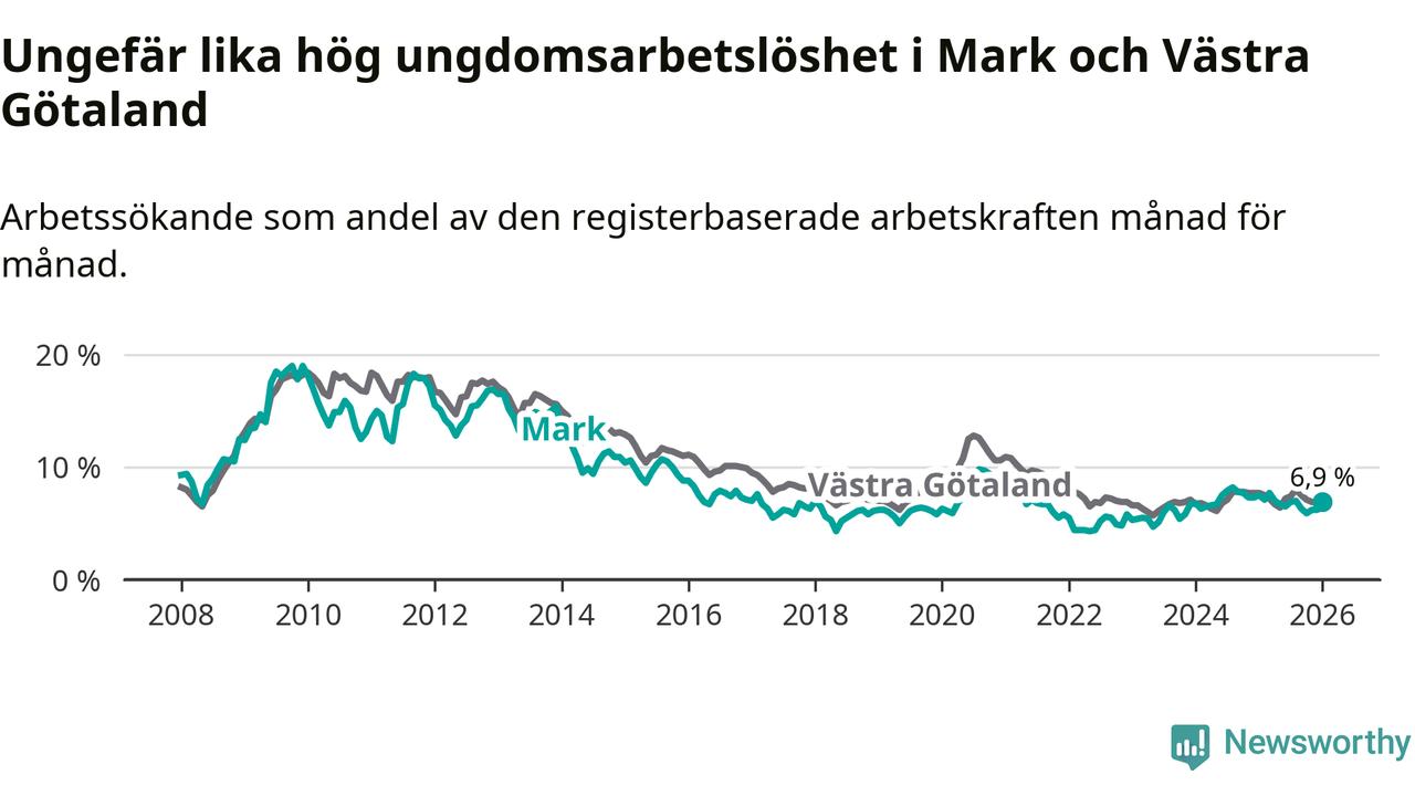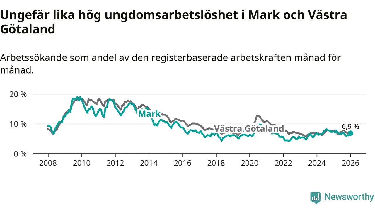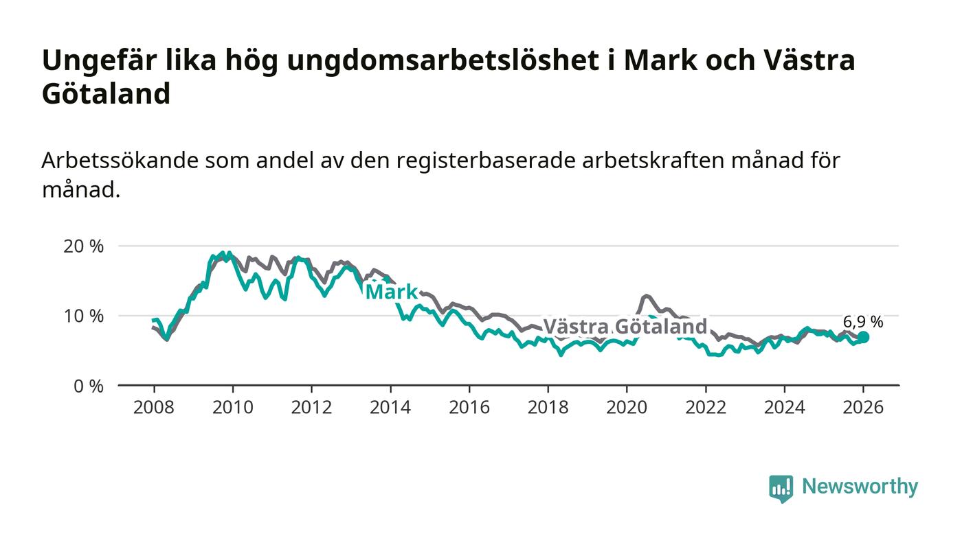 Medan Mark har lägre total arbetslöshet än Västra Götaland, ligger ungdomsarbetslösheten på i stort sett samma nivå.