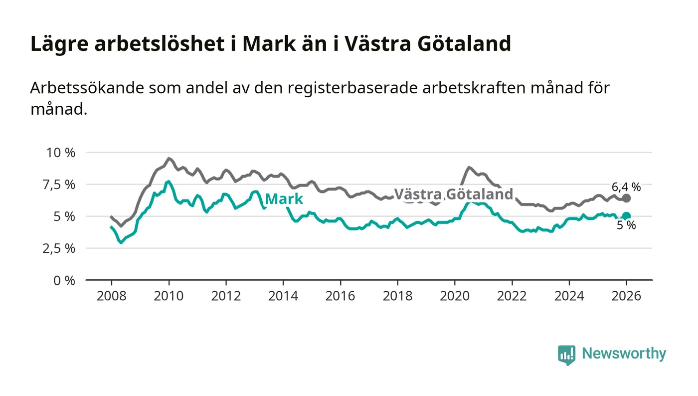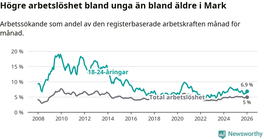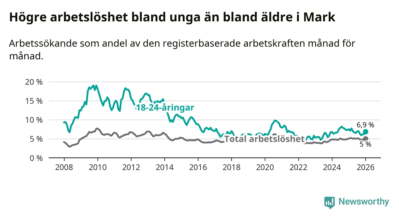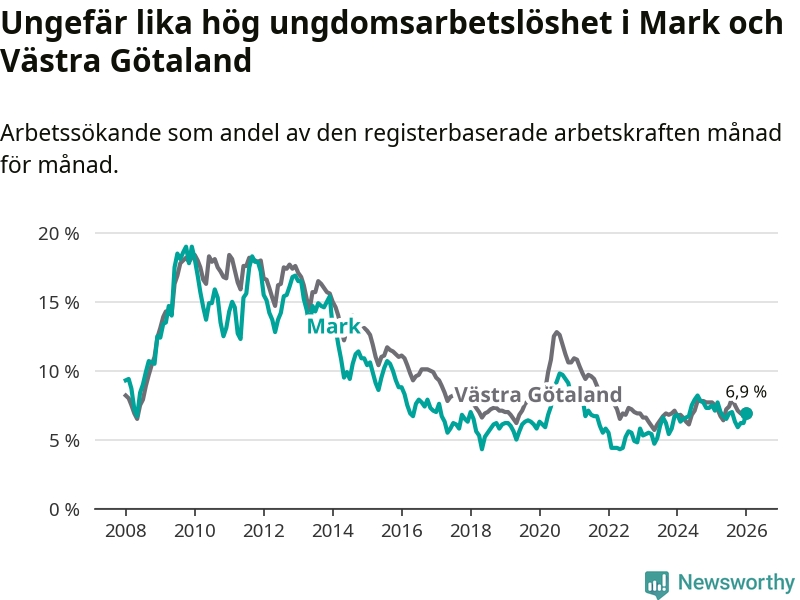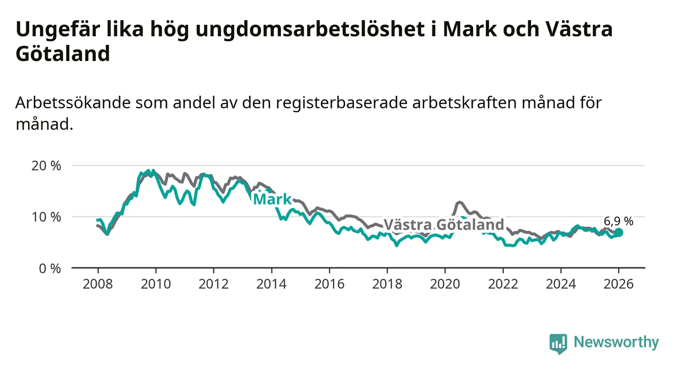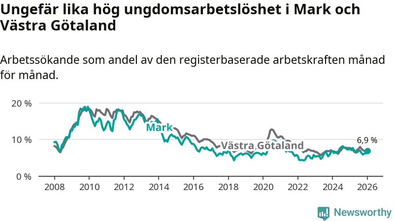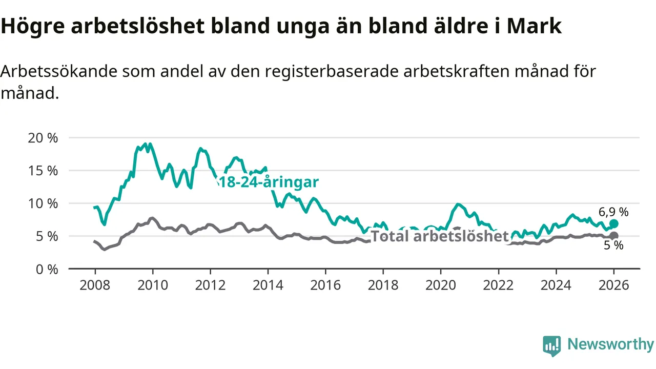 Medan Mark har lägre total arbetslöshet än Västra Götaland, ligger ungdomsarbetslösheten på i stort sett samma nivå.