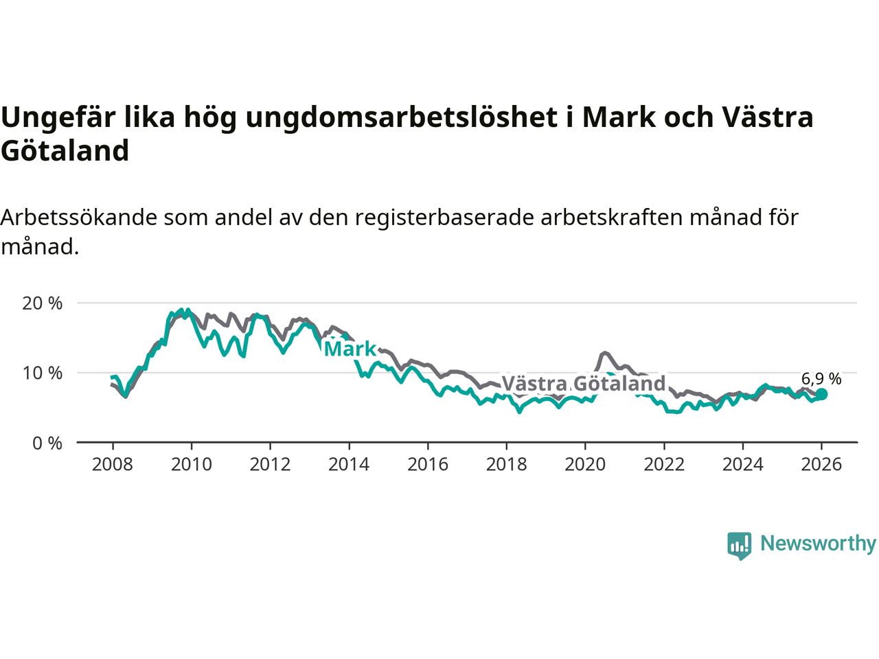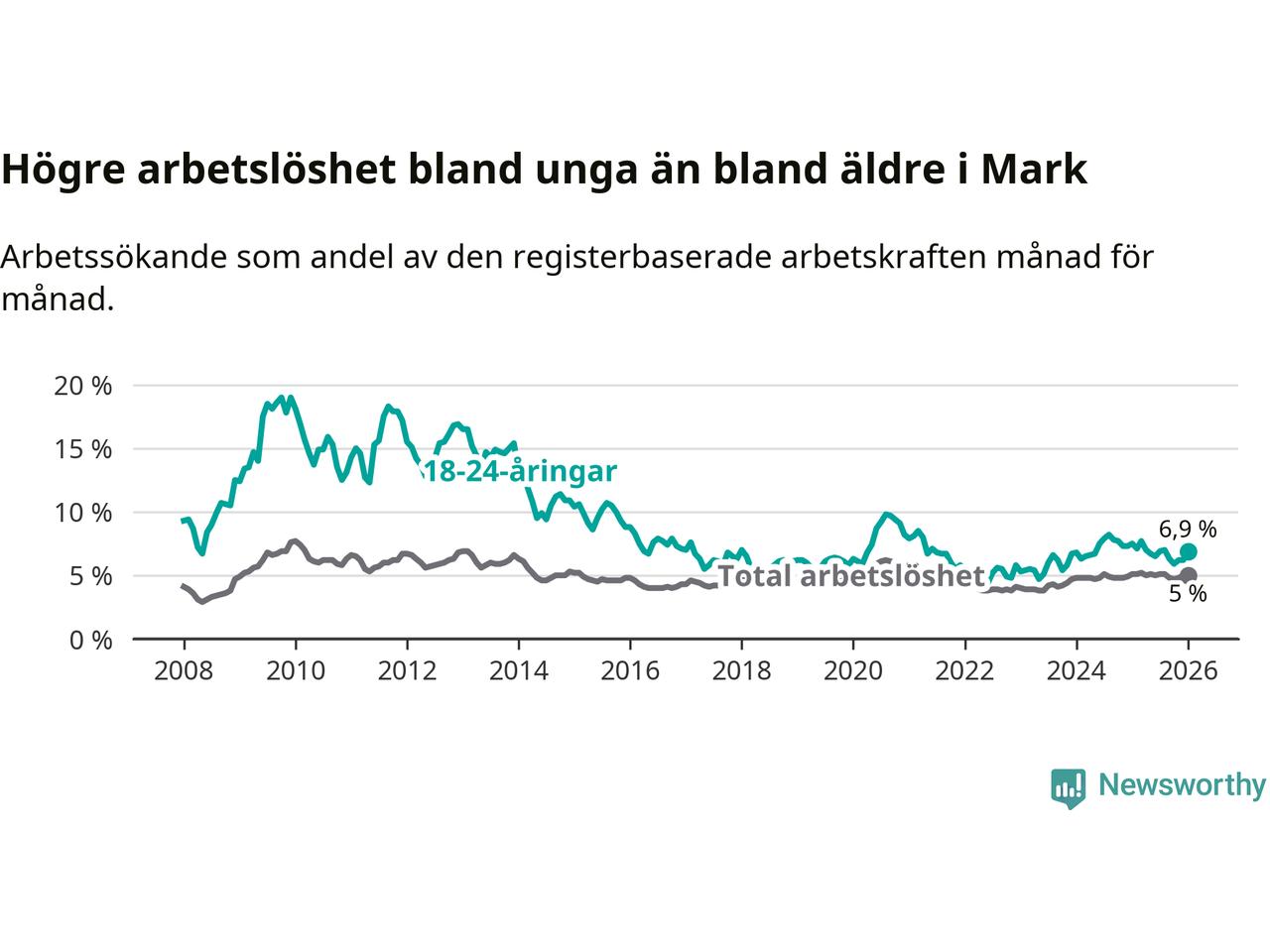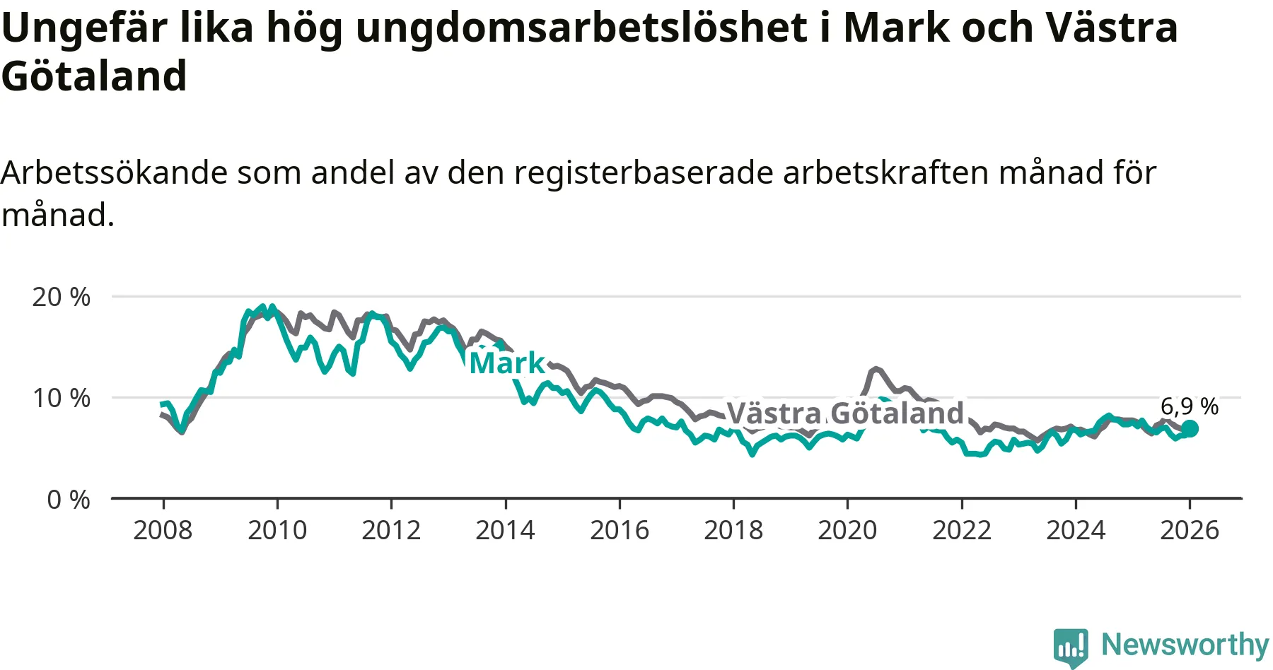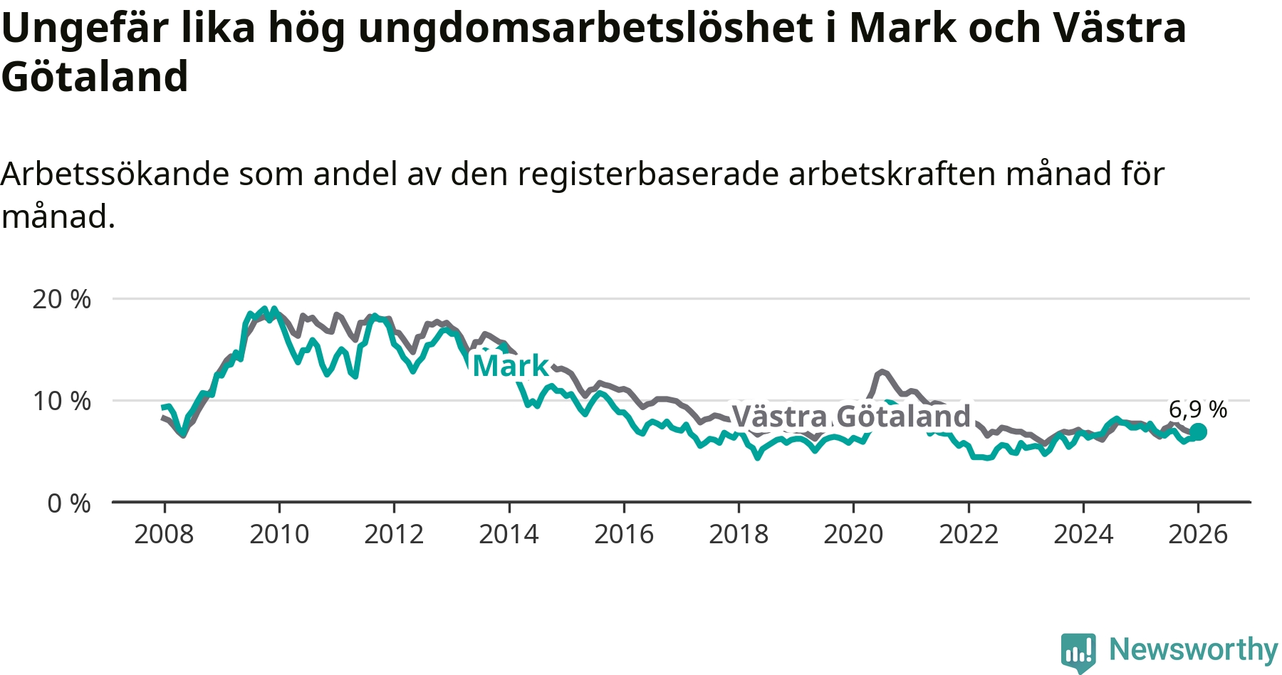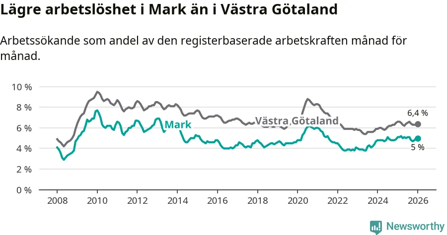 Medan Mark har lägre total arbetslöshet än Västra Götaland, ligger ungdomsarbetslösheten på i stort sett samma nivå.
