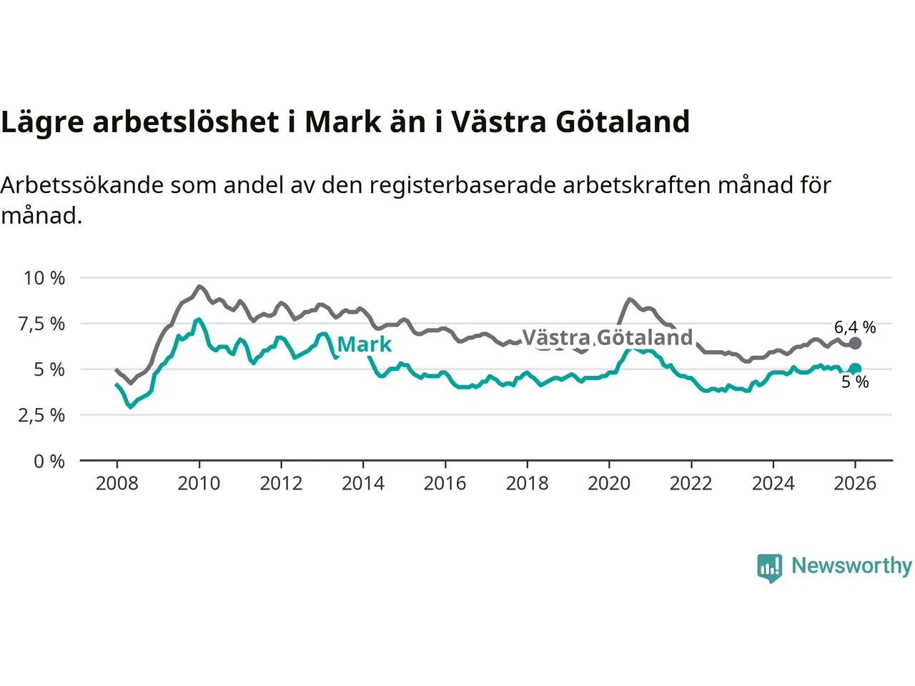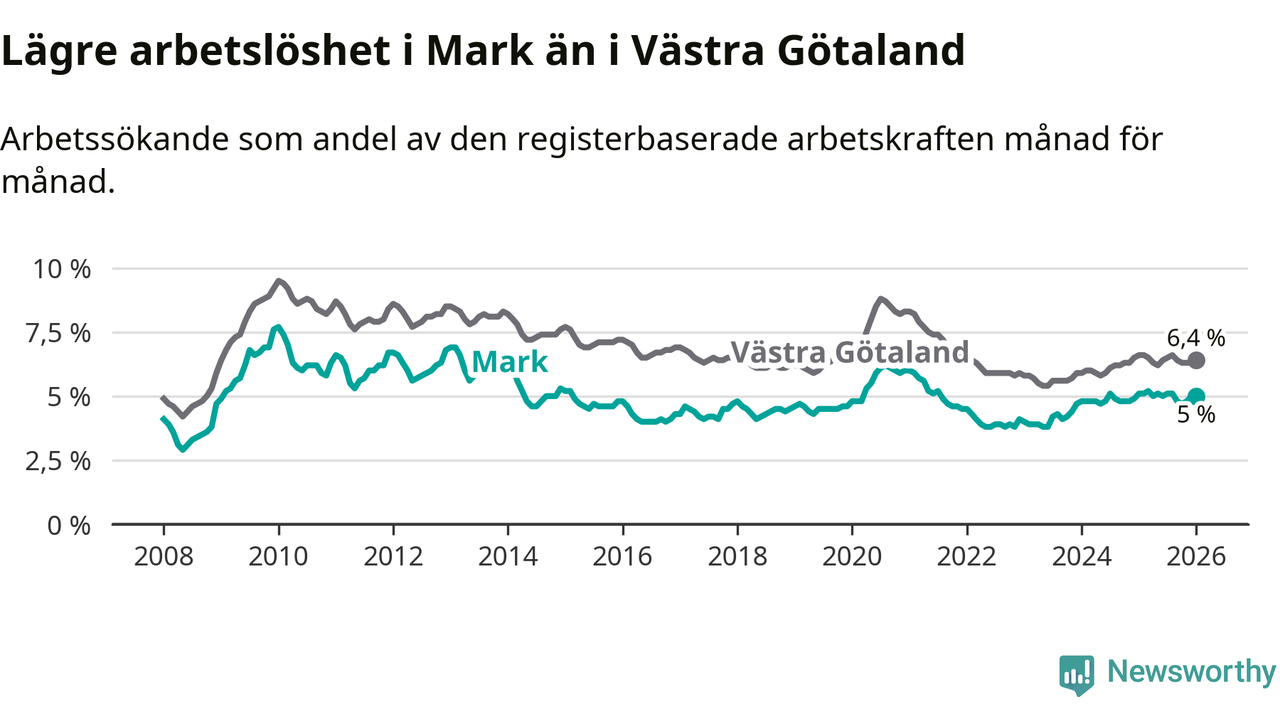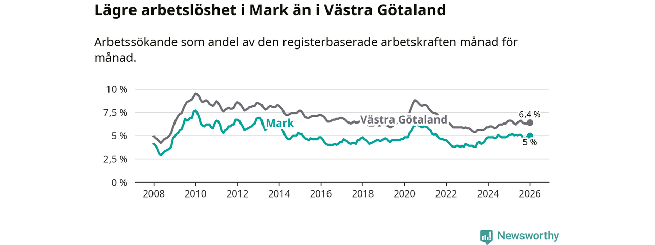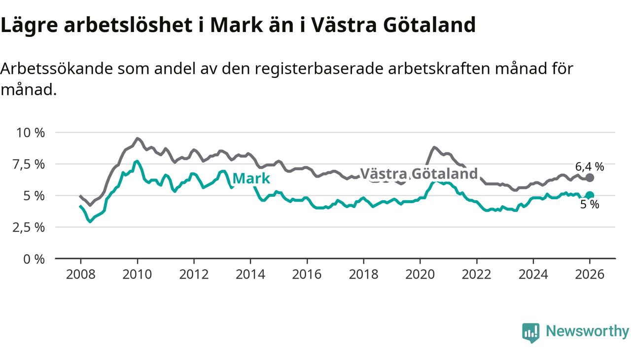 Graf: Arbetslöshet i Marks kommun och Västra Götalands län