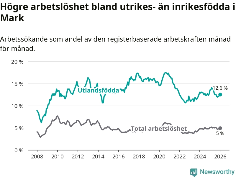 Arbetslösheten bland utlandsfödda var 12,6 procent i Mark under januari månad, motsvarande 334 av 2 651 personer. Det är 1,0 procentenheter färre än vid samma tidpunkt i fjol (−20 om man räknar personer).