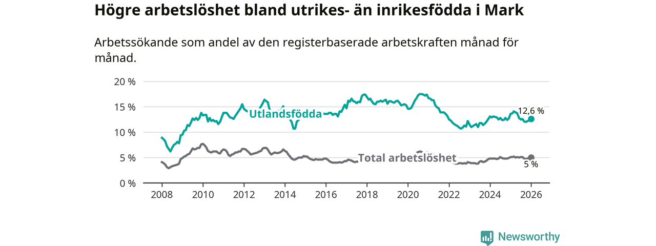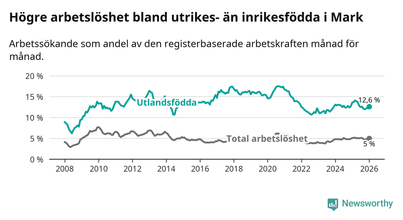 Skillnaden i arbetslöshet mellan utrikesfödda och hela befolkningen är 7,6 procentenheter i Mark. Det är en mindre skillnad än för ett år sedan (−0,9 procentenheter).