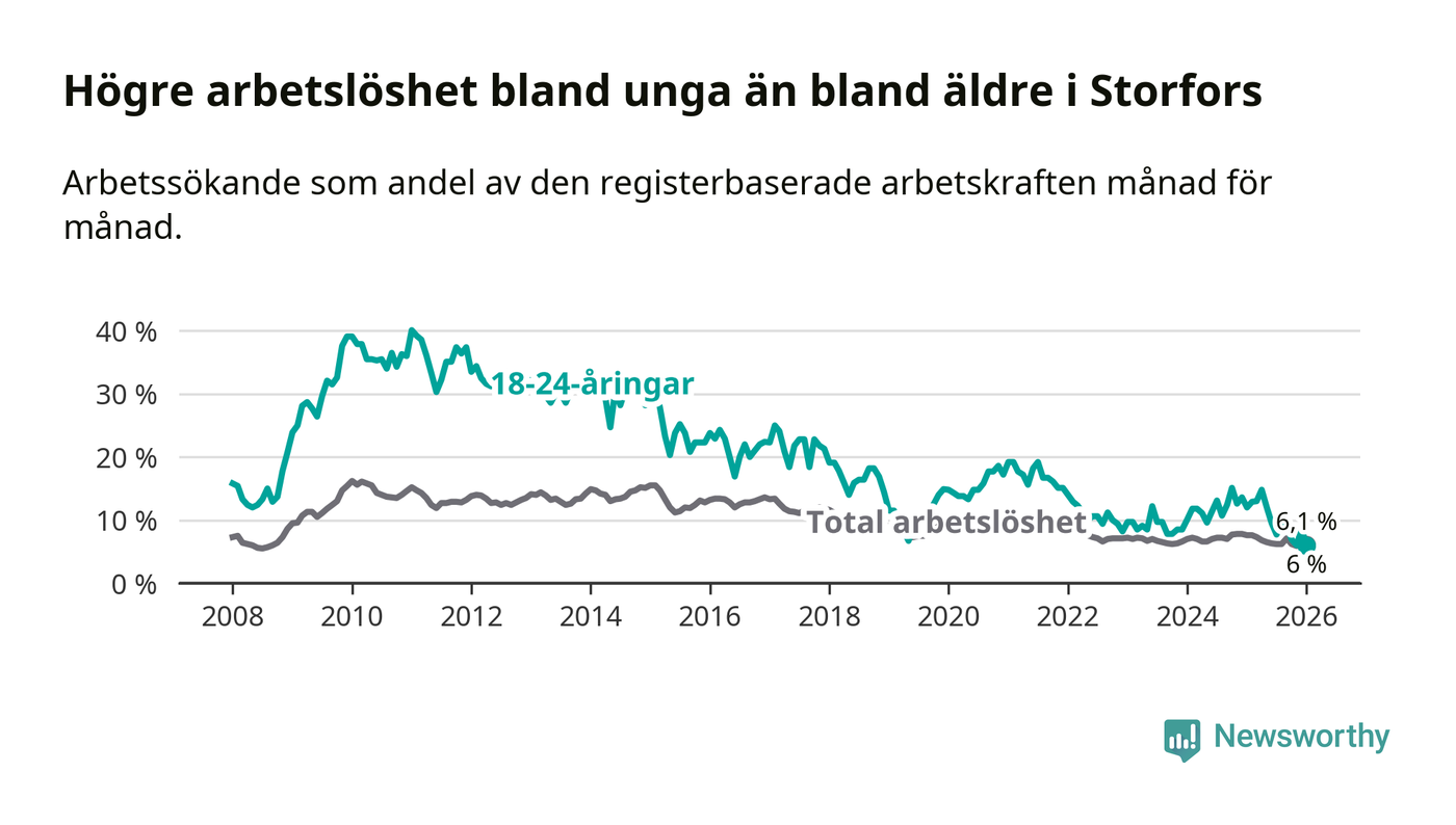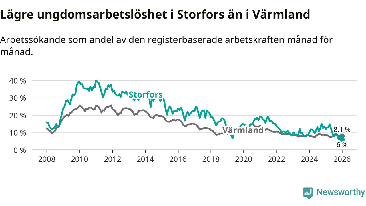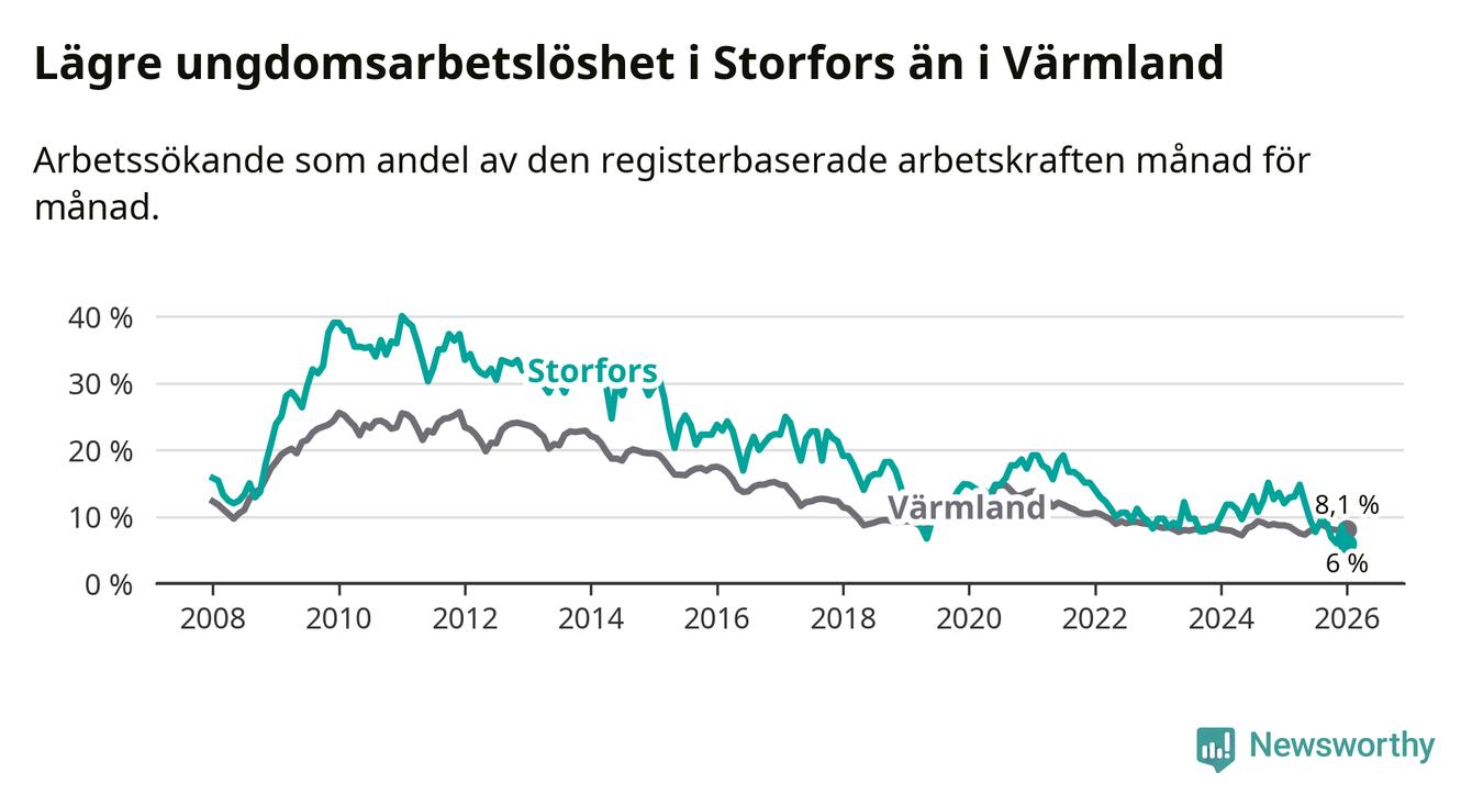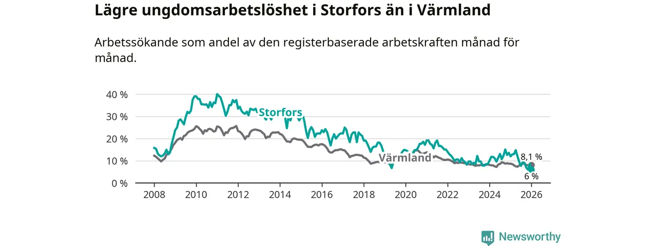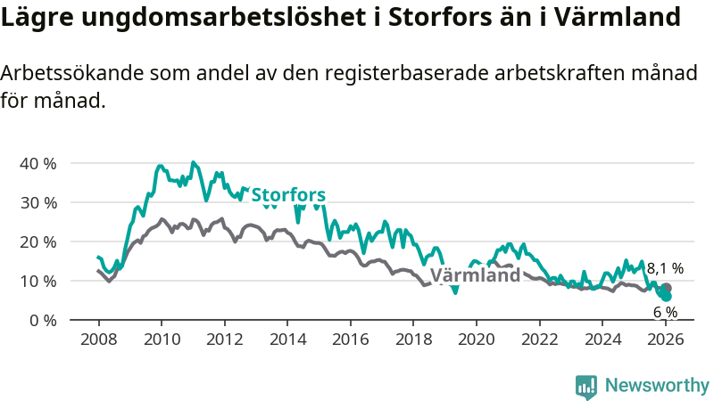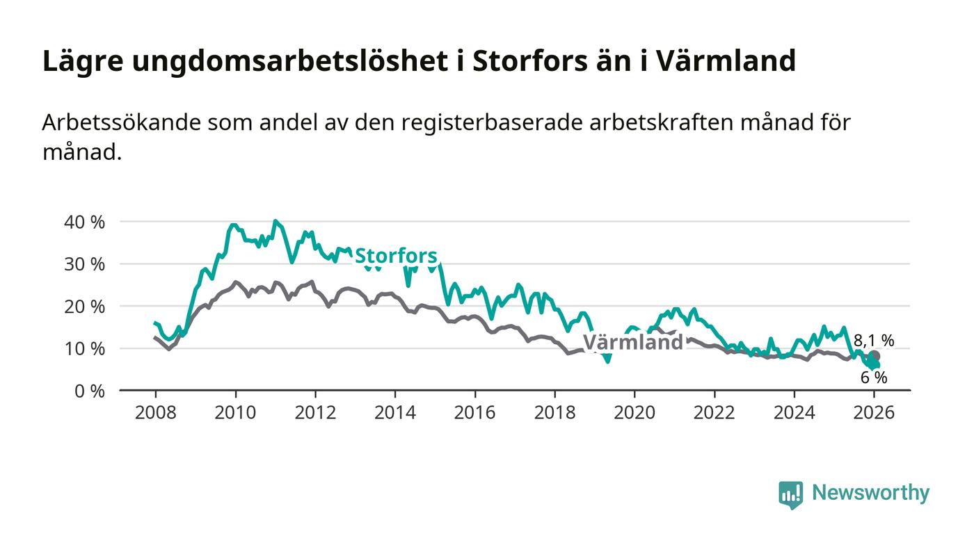 I och med den senaste månadens nedgång har de ungas arbetslöshet i Storfors sjunkit åtta månader i följd (ner från 12,1 procent i maj 2025 till 6,0 procent nu).