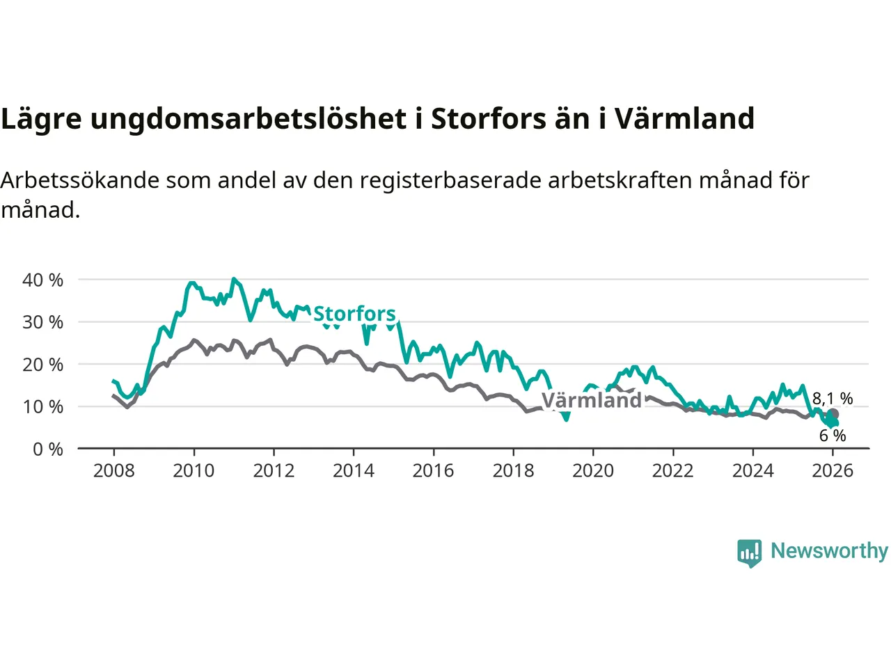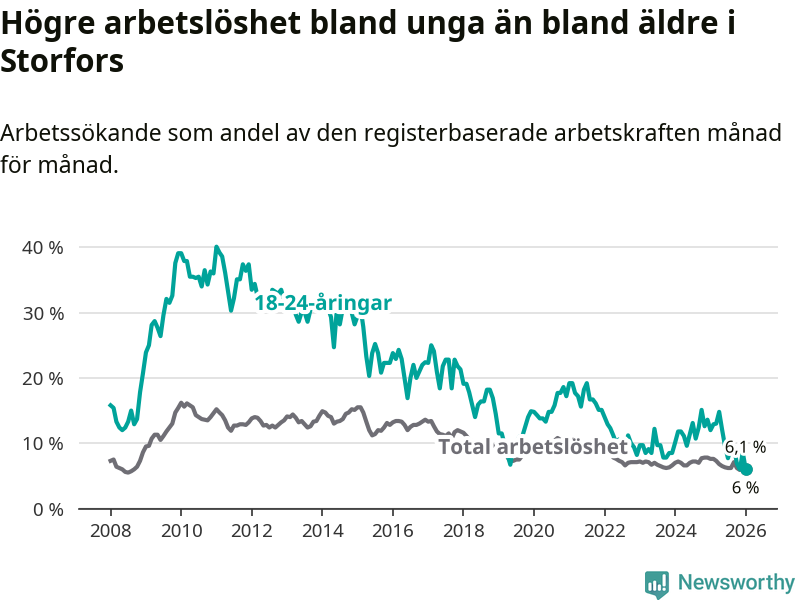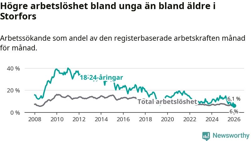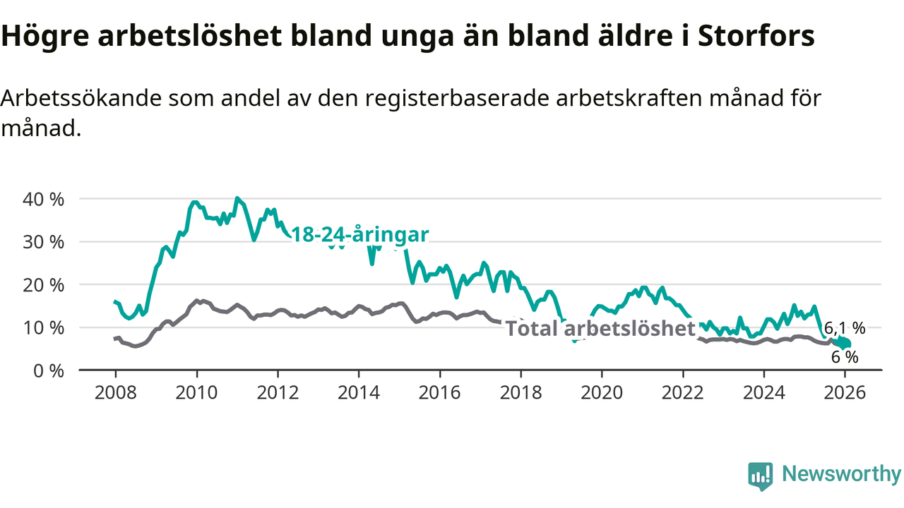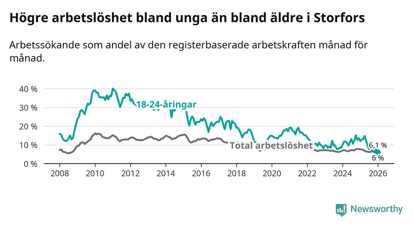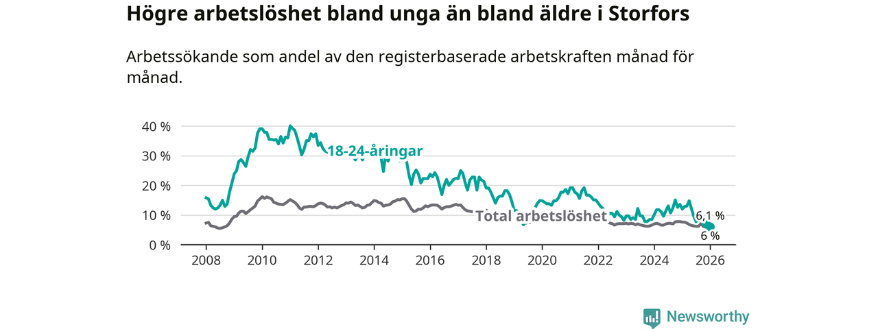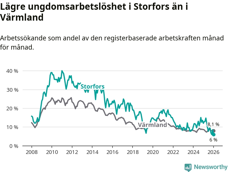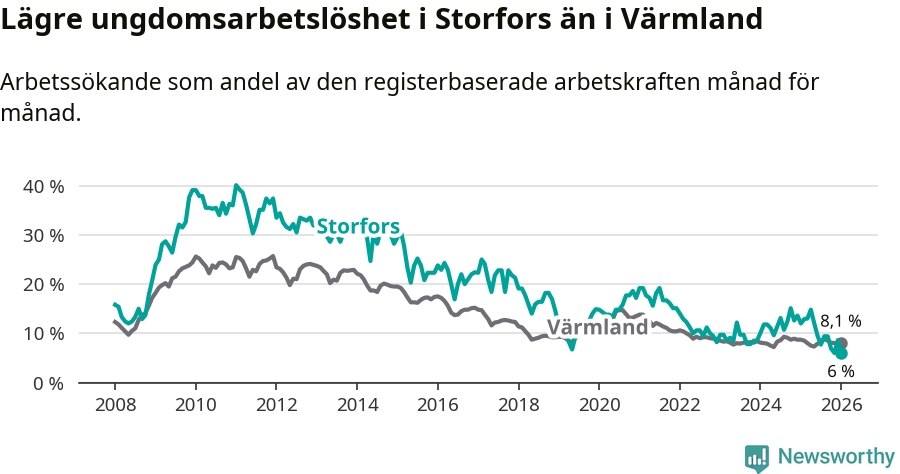 I och med den senaste månadens nedgång har de ungas arbetslöshet i Storfors sjunkit åtta månader i följd (ner från 12,1 procent i maj 2025 till 6,0 procent nu).