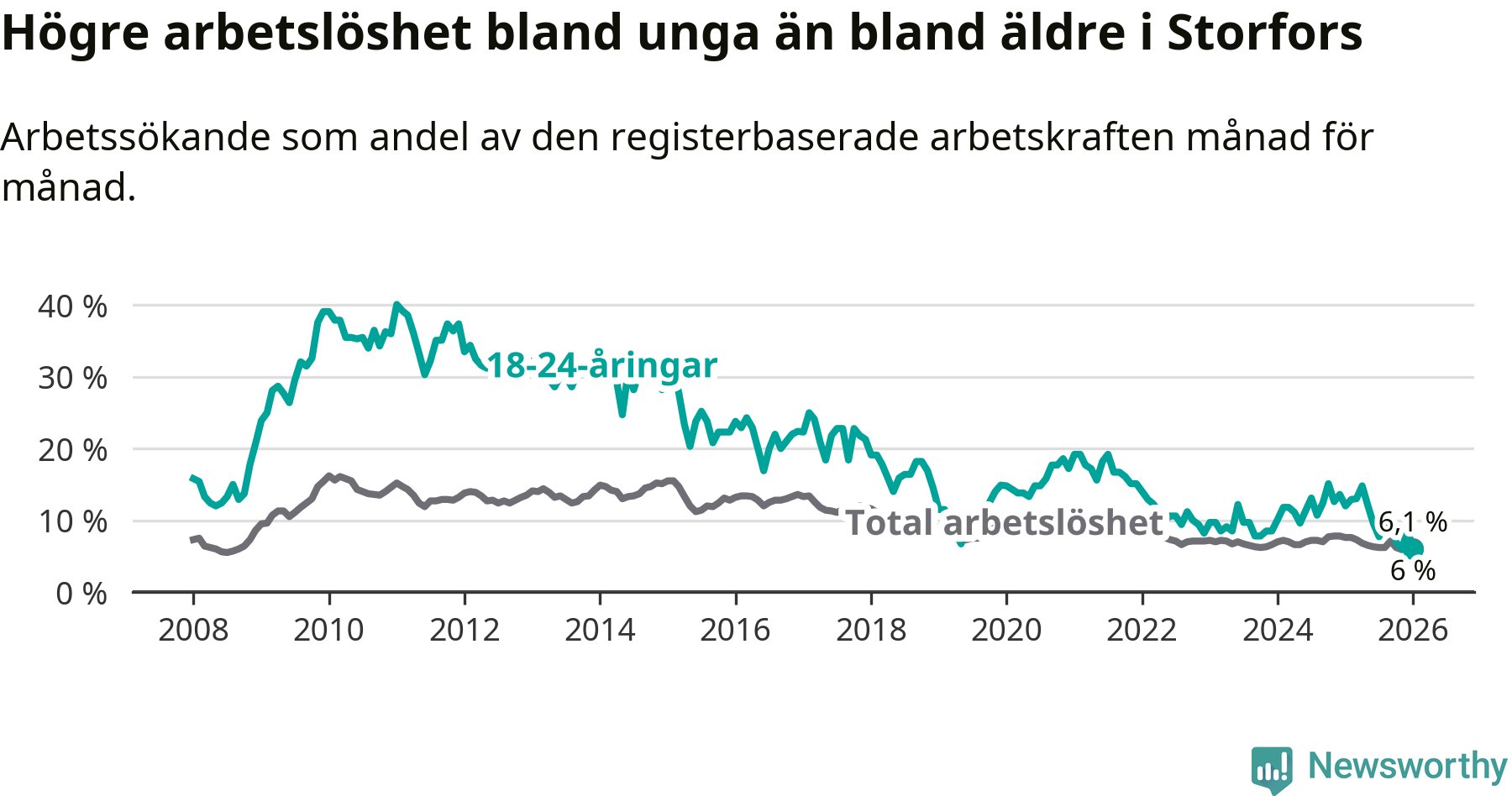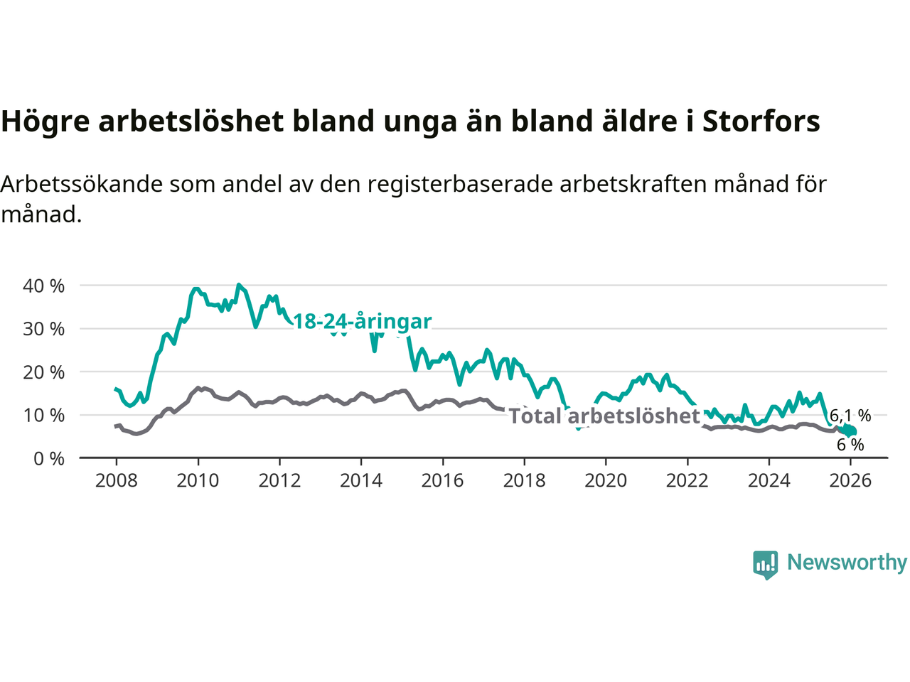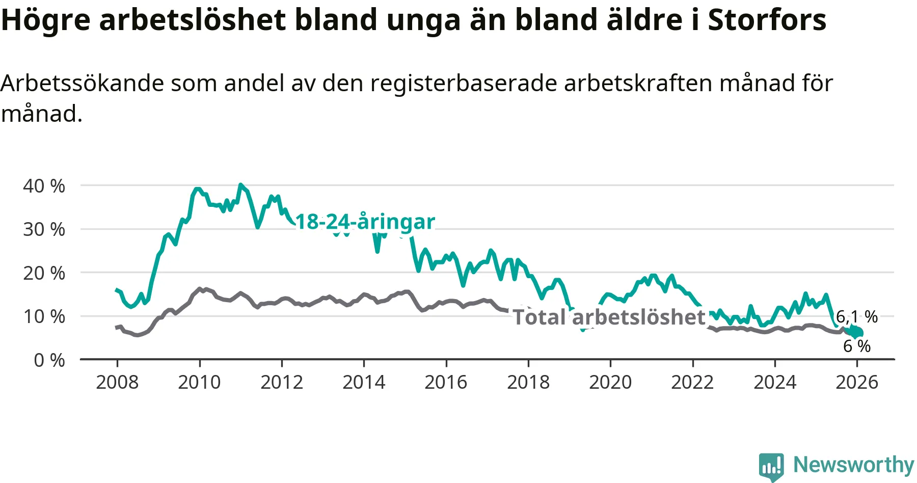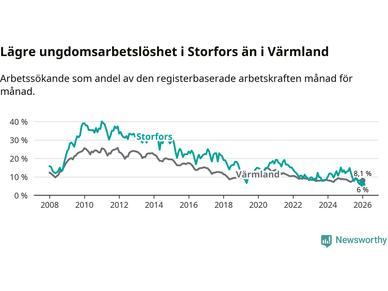I och med den senaste månadens nedgång har de ungas arbetslöshet i Storfors sjunkit åtta månader i följd (ner från 12,1 procent i maj 2025 till 6,0 procent nu).