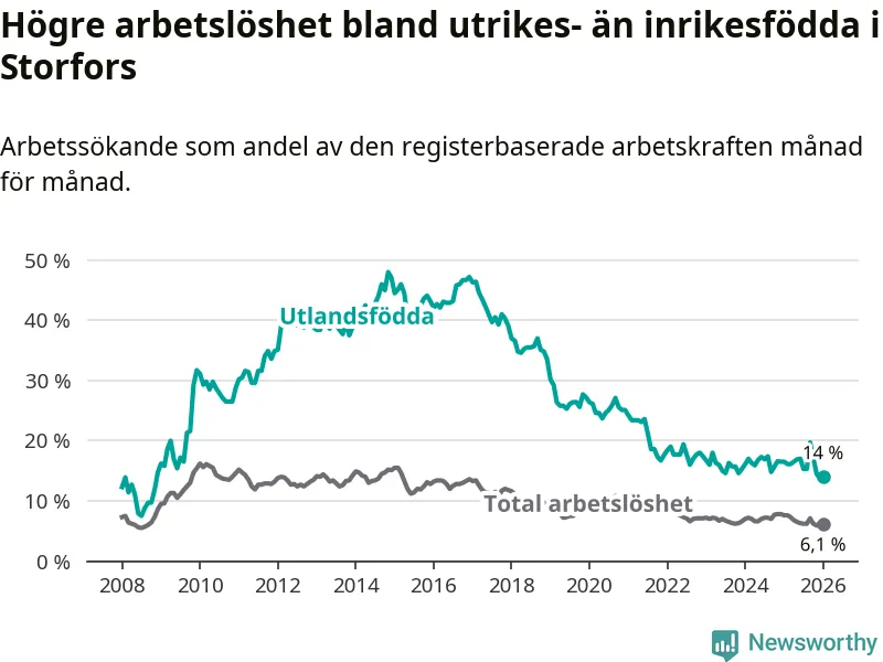 Arbetslösheten bland utlandsfödda var 14,0 procent i Storfors under januari månad, motsvarande 32 av 229 personer. Det är 2,5 procentenheter färre än vid samma tidpunkt i fjol (−6 om man räknar personer).