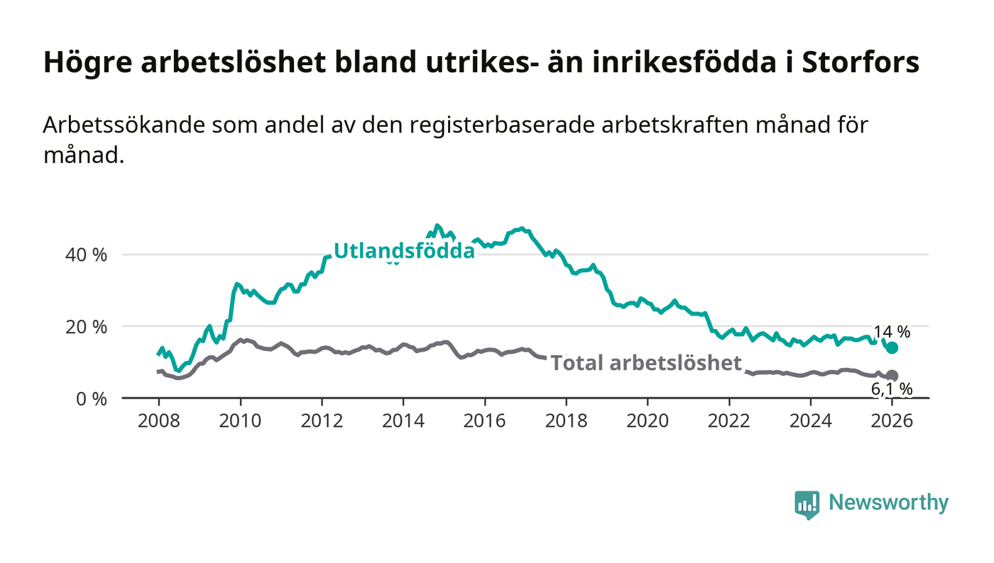 Skillnaden i arbetslöshet mellan utrikesfödda och hela befolkningen är 7,9 procentenheter i Storfors. Det är en mindre skillnad än för ett år sedan (−1,0 procentenheter).